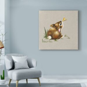 This ready to hang, gallery-wrapped art piece features a baby rabbit over a gray background.