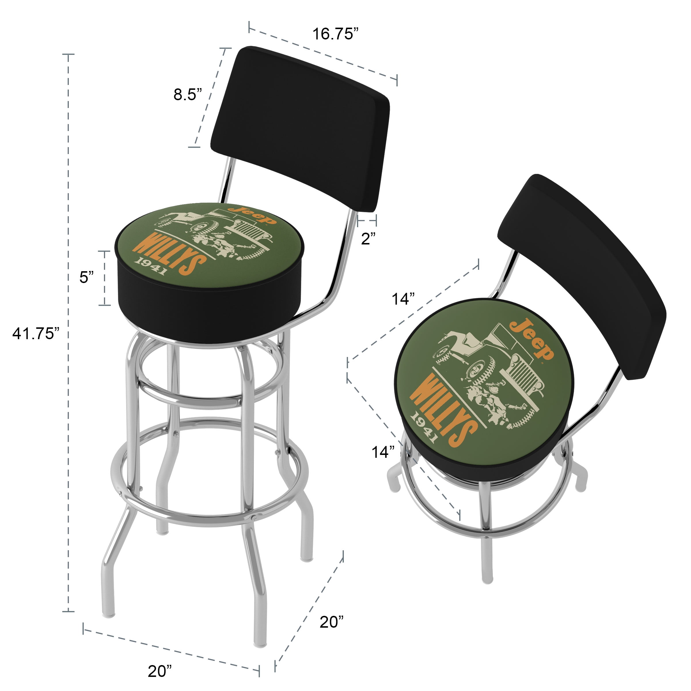 OFFICALLY LICENSED BARSTOOLS – The bar stools with back are sure to bring style to any basement, garage, or man cave with the officially licensed Jeep logo. FOAM PADDED SEAT – The counter stool is equipped with plush foam padding, while the marine grade vinyl sides and quarter inch vinyl beaded top provide added durability. REINFORCED LEGS – The base of the garage stool is constructed from tubular steel with chrome double rung reinforced legs, making this industrial bar stool both lightweight and supportive. 360-DEGREE SWIVEL – The workbench stool features a 360-degree swivel rotation for added versatility and will make an excellent addition to any area of your home or bar. MATERIALS – Chrome Plated Steel, Marine Grade Vinyl, and Foam Padding. DIMENSIONS – (L) 20″ x (W) 20″ x (H) 41.75″; Seat: (L) 14″ x (W) 14″ x (H) 5″; Back Rest: (L) 16.75″ x (W) 2″ x (H) 8.5″; Vinyl Beading: 0.25″.