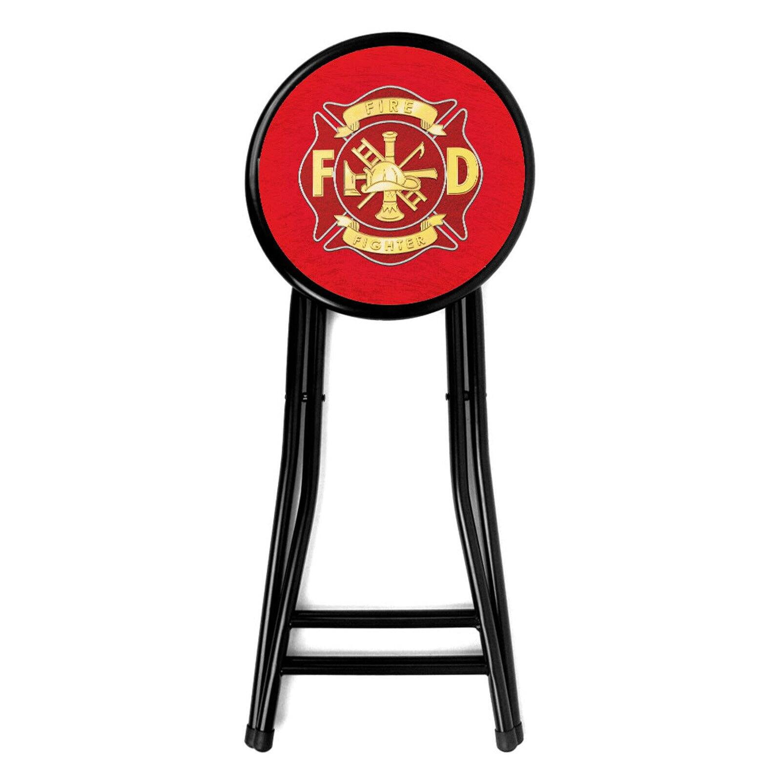 Dimensions: 14L x 15D x 24H inches Folding counter-height stool Steel legs with spring-loaded safety lock Vinyl cover with round cushioned seat Officially licensed fire fighter logo Seat height: 24 inches