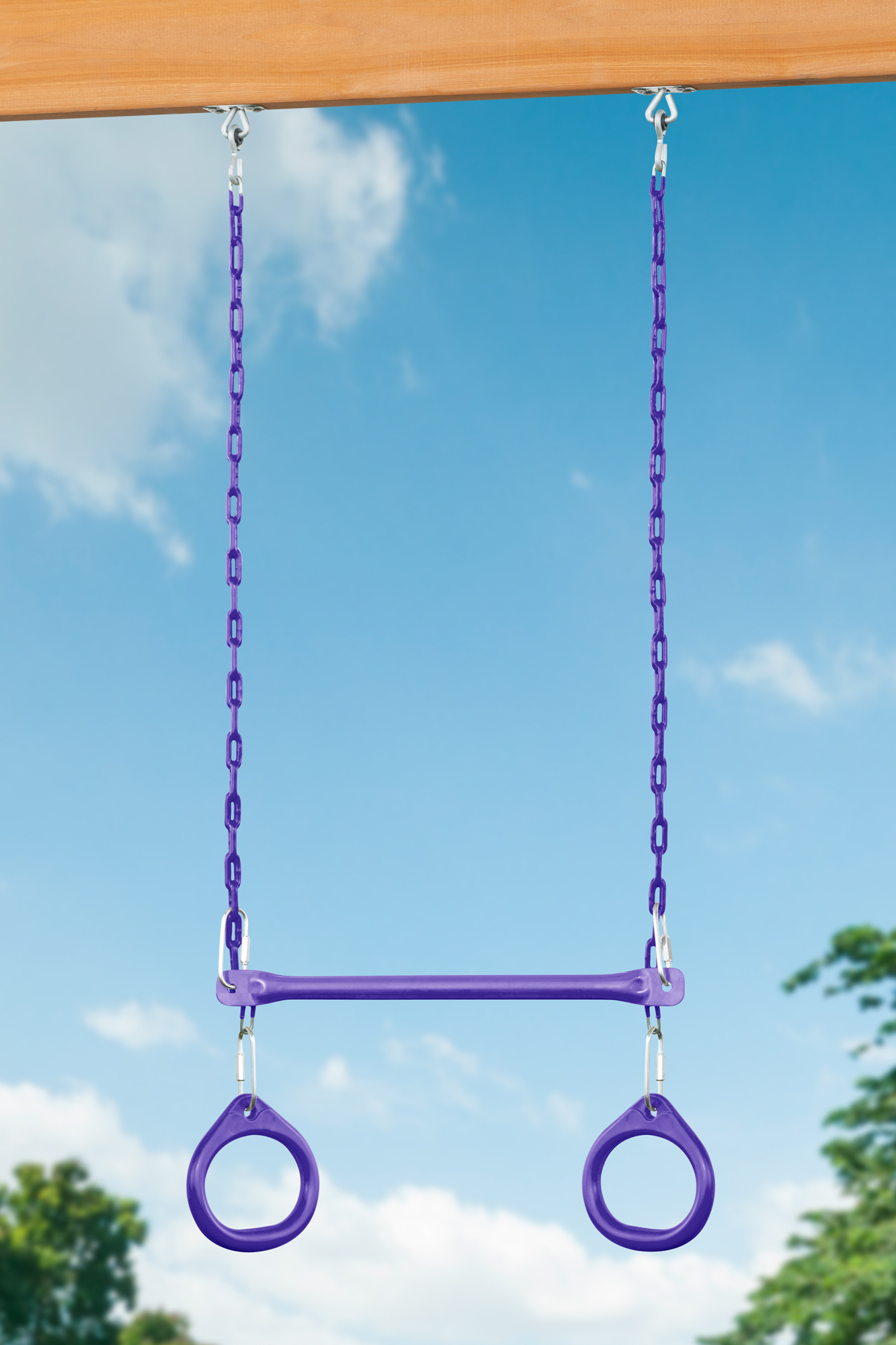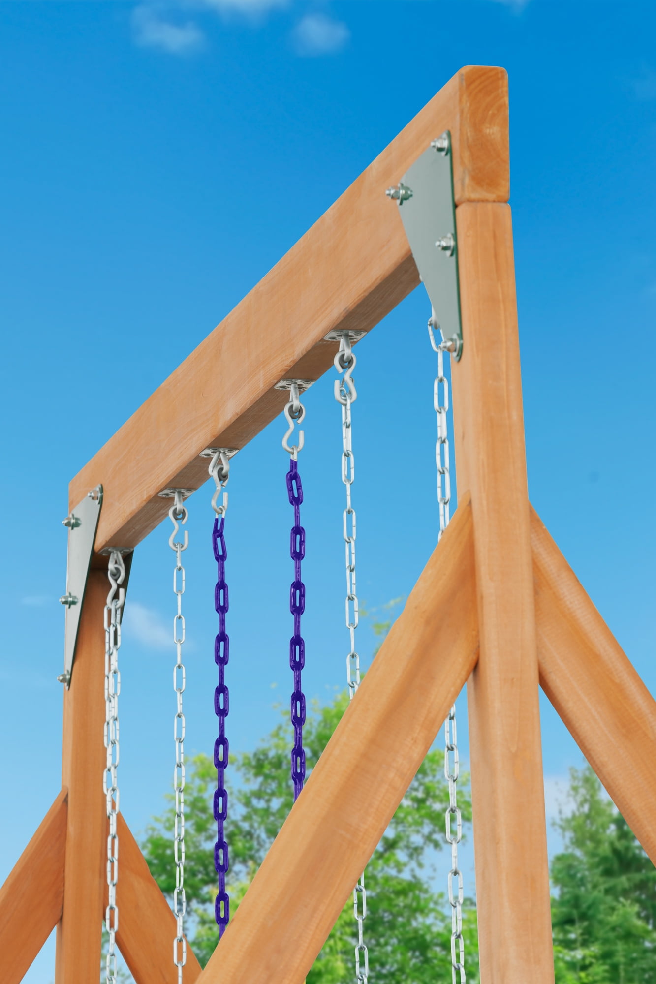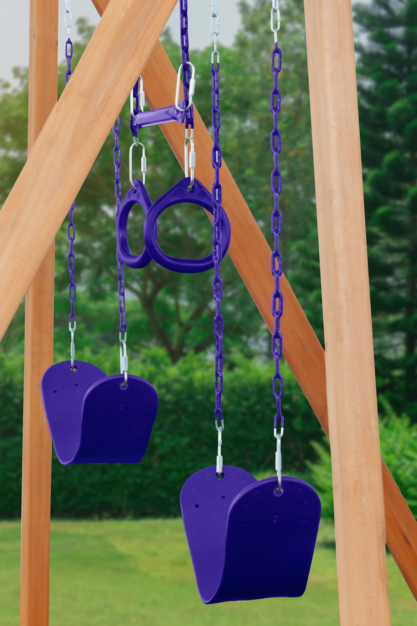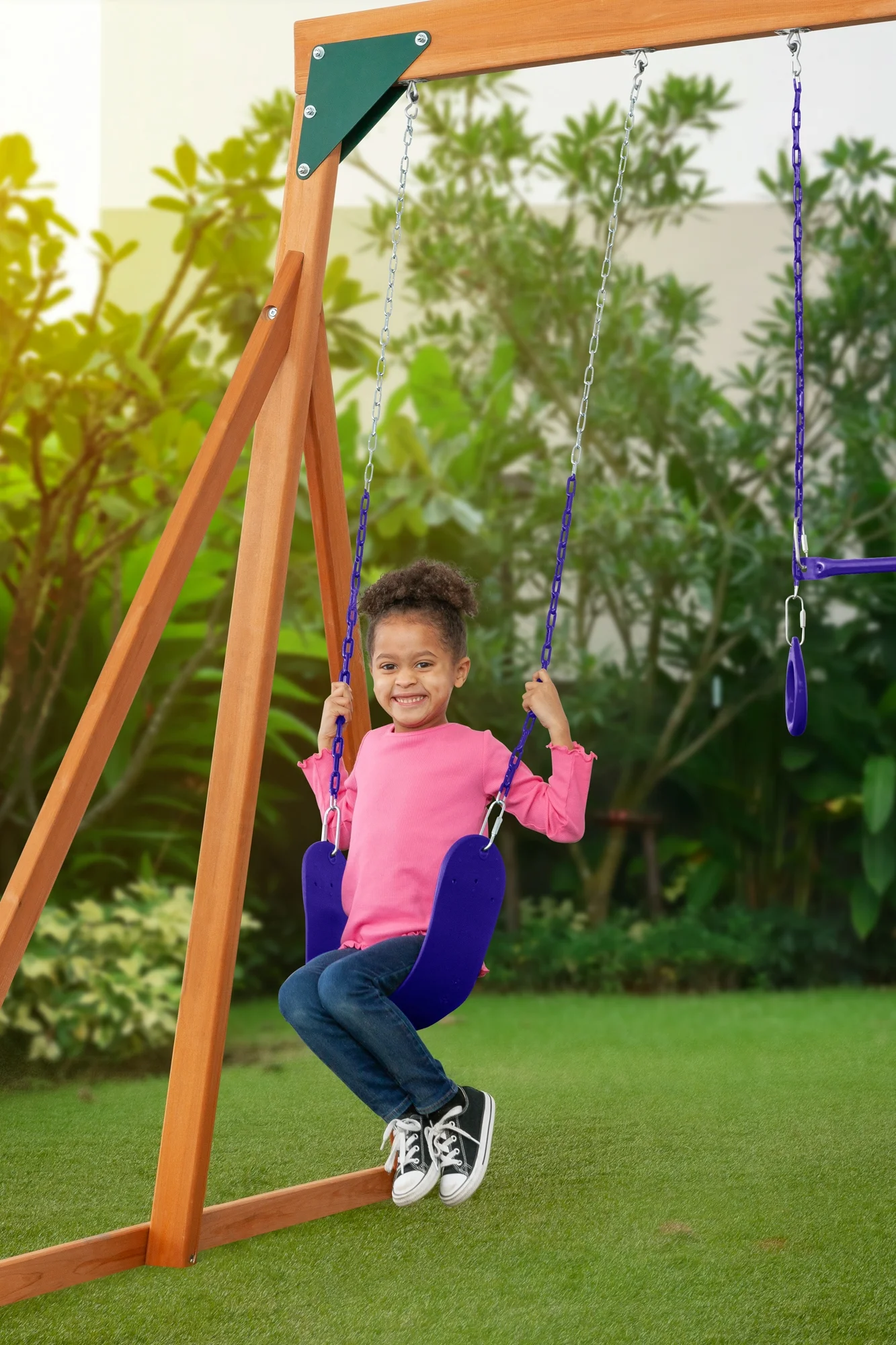 Offered in 7 color options, customize your backyard to blend into nature, customize to your favorite sports team’s colors, or indulge your child’s inner Princess and customize to all pink or purple! The Trailside Wooden Swingset can be easily setup in one afternoon. All wood, hardware, accessories, and instructions are included for assembly Easily unclip existing swings to replace with a baby swing, saucer swing, or other desired attachments