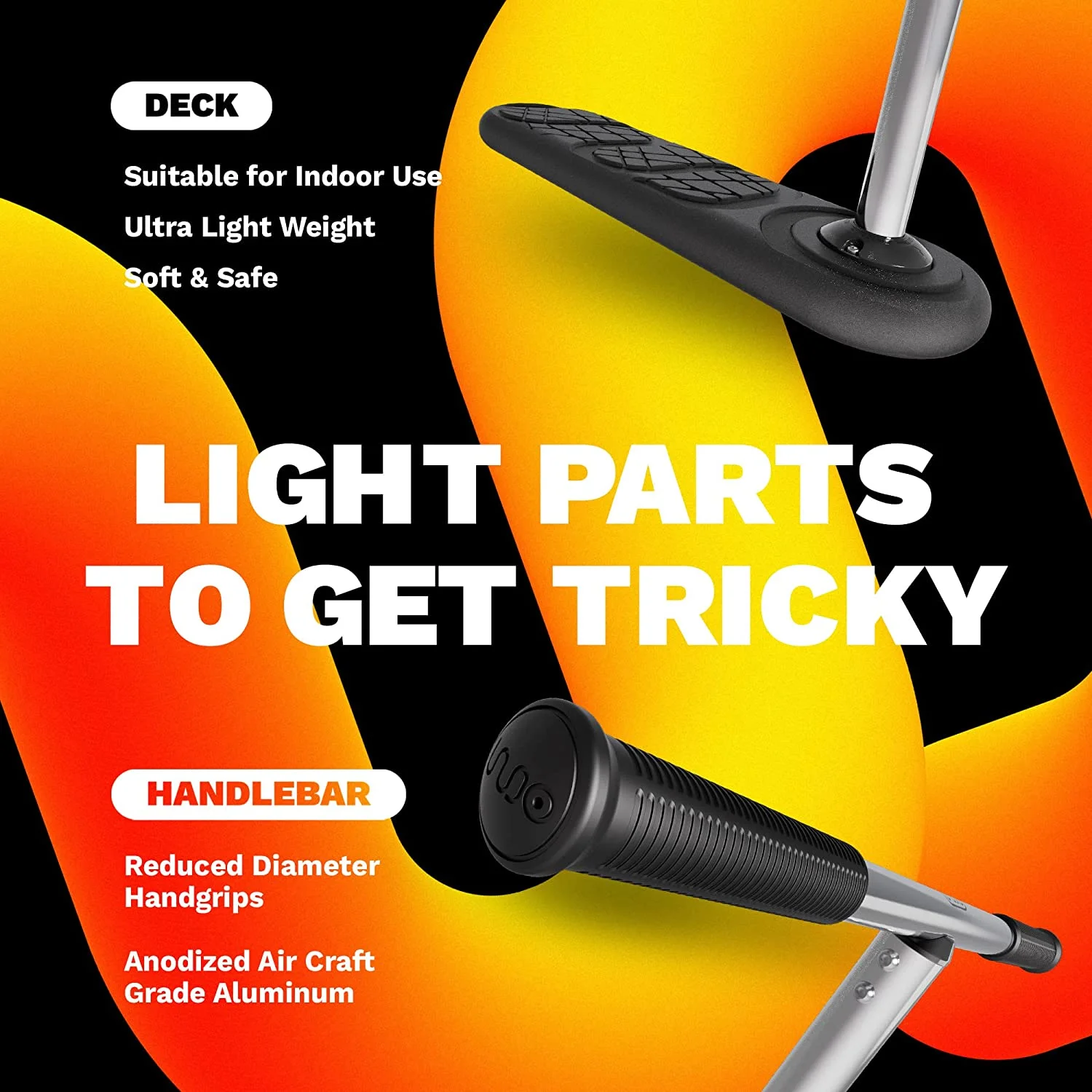 IMPROVE YOUR STREET & TRAMPOLINE RIDING SKILLS: Infinite tricks you can try and create with this tramp scooter, your only obstacle is the sky. Perfect stunt scooter to fight against gravity and have fun at the same time. BUILD YOUR CONFIDENCE: You will be the main hangout spot for your friends and have way more confidence in yourself. Beats the winter season since you will have an indoor scooter. USE IT AT HOME OR AT TRAMPOLINE: This trick scooter is easy to build and use. Its strong, secure and lightweight design allows your kids to practice all kinds of stunts, it is safer on a trampoline than normal scooters.