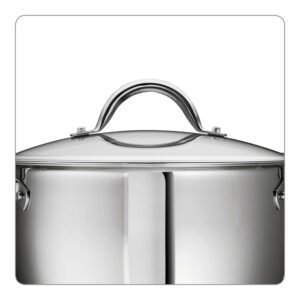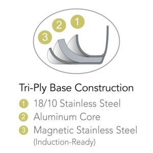 – It is made of premium 18 & 10 stainless steel & features an impact-bonded, tri-ply base construction (consisting of stainless steel, an aluminum core & a magnetic stainless steel) to help distribute heat quickly & evenly when cooking.