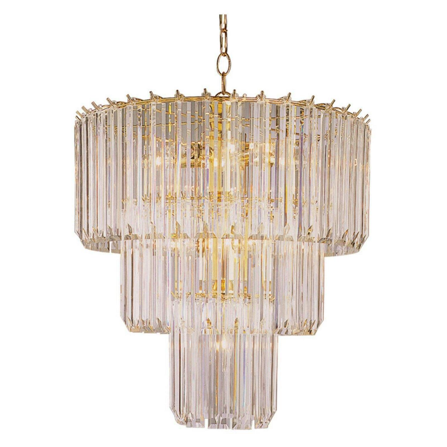 Designed to blend well with traditional or contemporary settings, the Transglobe 9647 PB Chandelier – Polished Brass – 20W in. makes its presence felt through its striking silhouette and upscale appeal. Tube-shaped acrylic prisms with polished brass accents create draped strands of flowing light, making this 3-tier chandelier a charming addition to your foyer, living space, or dining area. This 20-inch fixture uses nine candelabra-base 40-watt bulbs (not included).