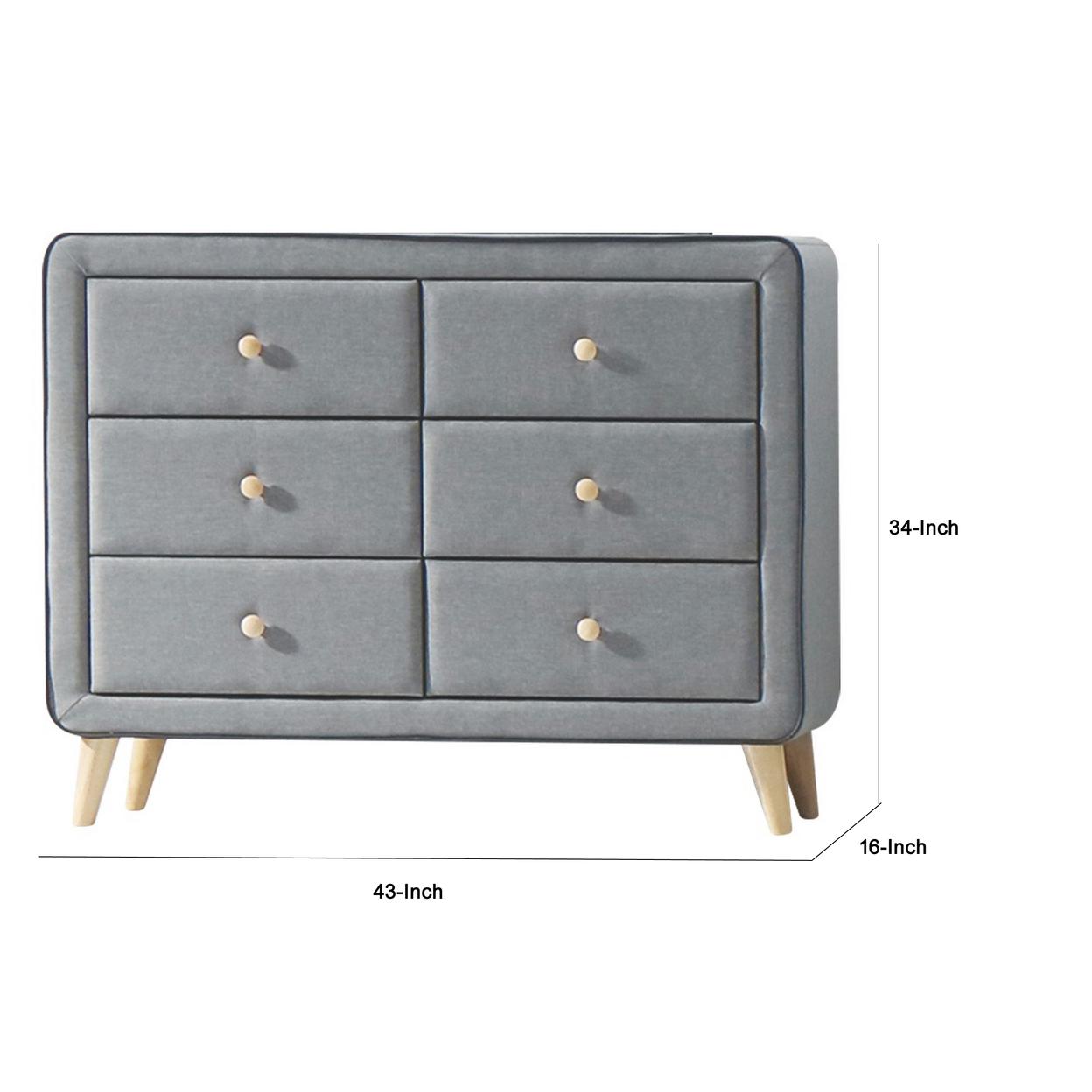 Transitional Style Wood and Fabric Upholstery Dresser with 6 Drawers, Gray Transform your living space with the addition of this transitional style dresser incorporating gray fabric upholstery. It features six drawers with ample storage space and wooden tapered legs that make it look elegant. Finished in a gray color, this dresser is versatile and can be placed in any corner of your house. Other featured items in the image are sold separately.