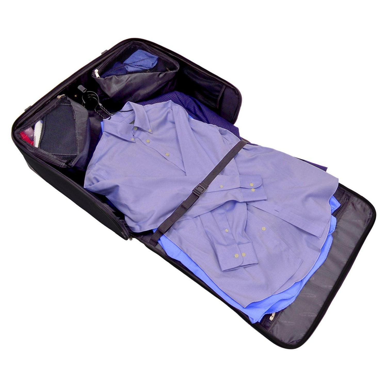 The Travel Select Amsterdam business rolling garment bag is ideal for keeping your clothes crisp and clean while you are traveling. This garment bag is made of industrial quality hardware; 1200d two-tone polyester construction with an EVA reinforced front panel. It features an internal handle system, inline skate wheels, and an adjustable and detachable shoulder strap with a non-slip pad. It has a spacious main compartment with zippered mesh pockets and multiple outside gusseted pockets for easy packing. The convenient tie straps secure items while the fold-out design helps to reduce wrinkles in suits. Plus, the top carry handle is designed for easy lifting and center strap is built in for carrying extra bag. Product Dimensions: 8 x23 x22 .