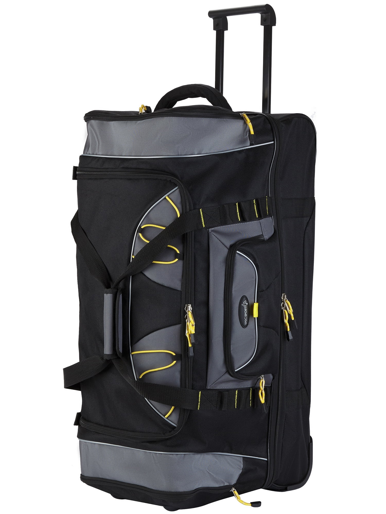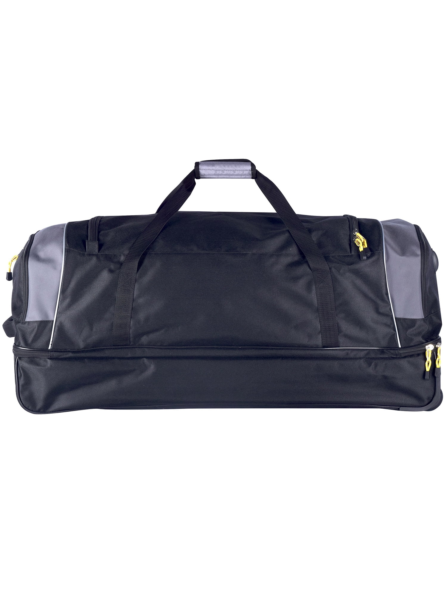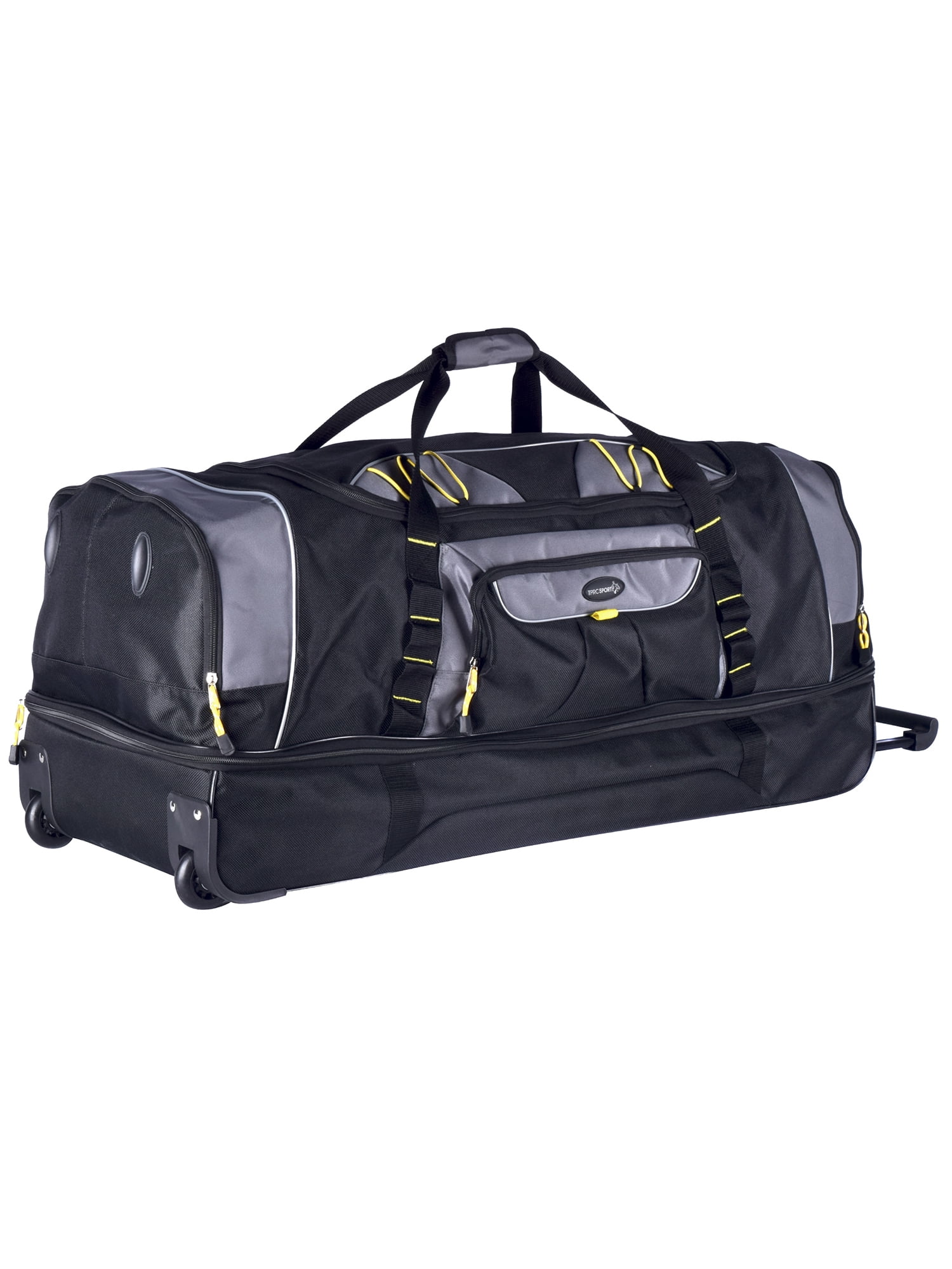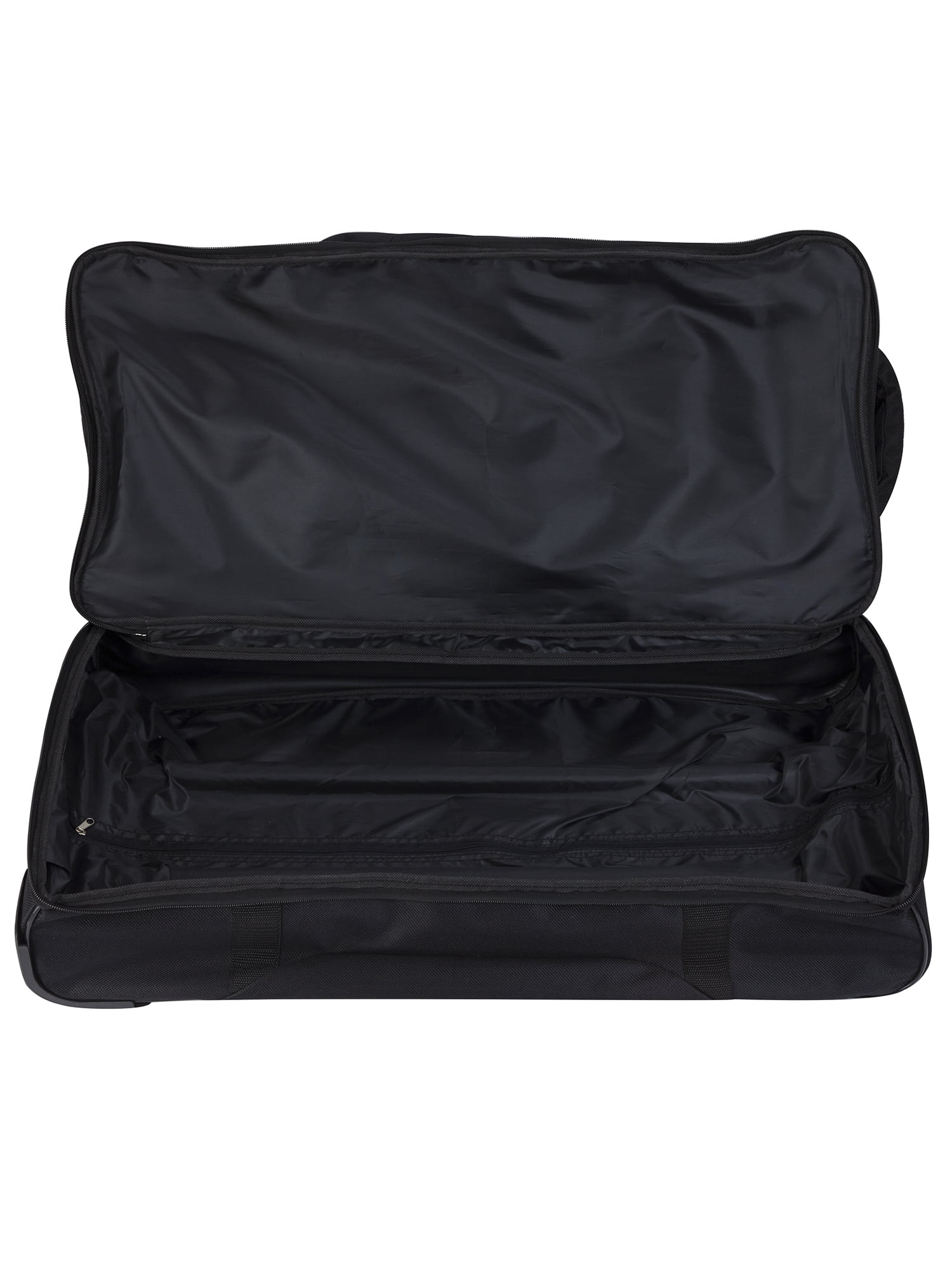 This Travelers Club 36″ jumbo drop-bottom duffel features a large bottom packing section, roomy main compartment, side accessory pockets and front pocket. Carry by top handles or roll with the telescopic handle that has in-line skate wheels. Made of rich and durable 900 denier polyester. Ideal for a long trip since packs plenty. Size: 36in x 15in x 16in. Weighs 6.6 lbs. Ideal for all adults. Over-sized as a check-in bag for most airlines.