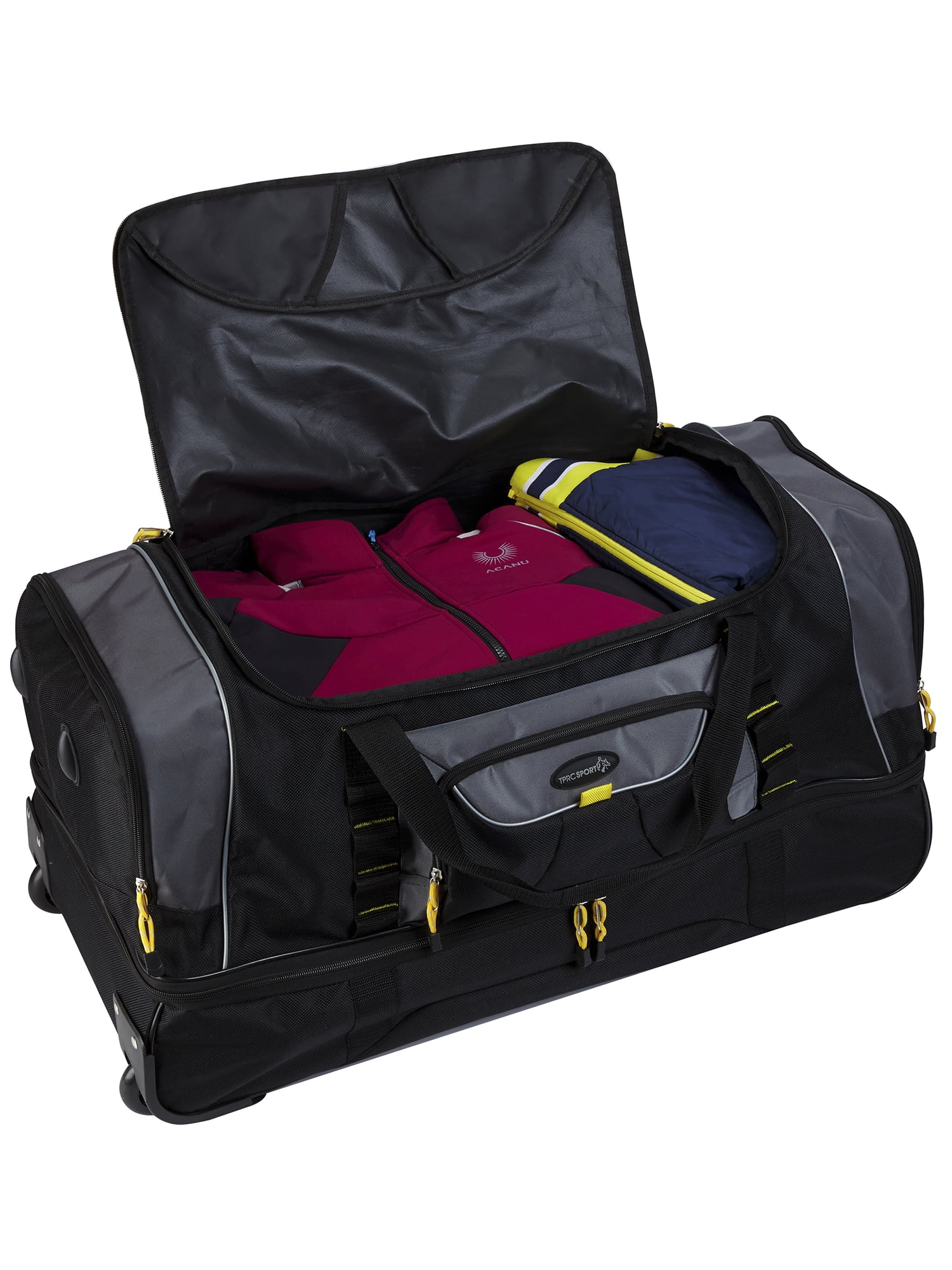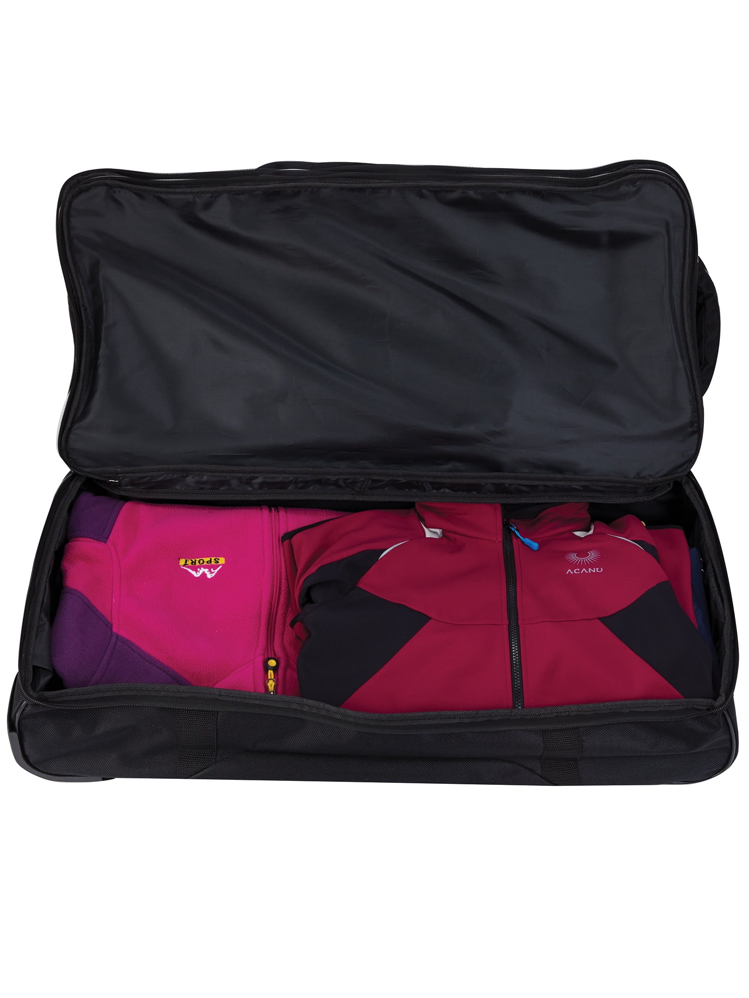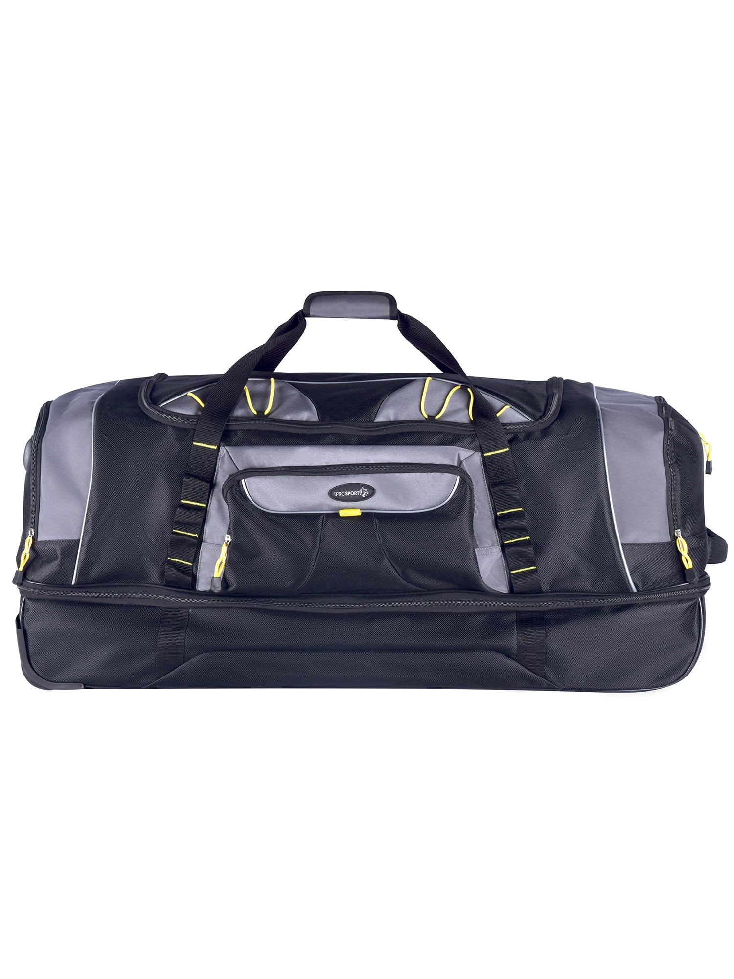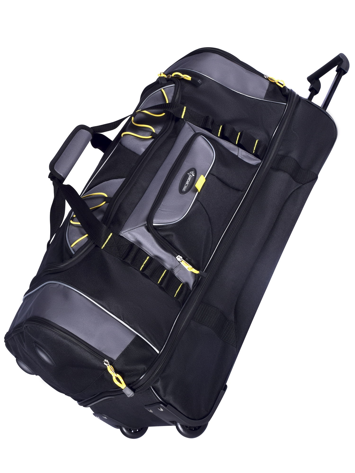 This Travelers Club 36″ jumbo drop-bottom duffel features a large bottom packing section, roomy main compartment, side accessory pockets and front pocket. Carry by top handles or roll with the telescopic handle that has in-line skate wheels. Made of rich and durable 900 denier polyester. Ideal for a long trip since packs plenty. Size: 36in x 15in x 16in. Weighs 6.6 lbs. Ideal for all adults. Over-sized as a check-in bag for most airlines.