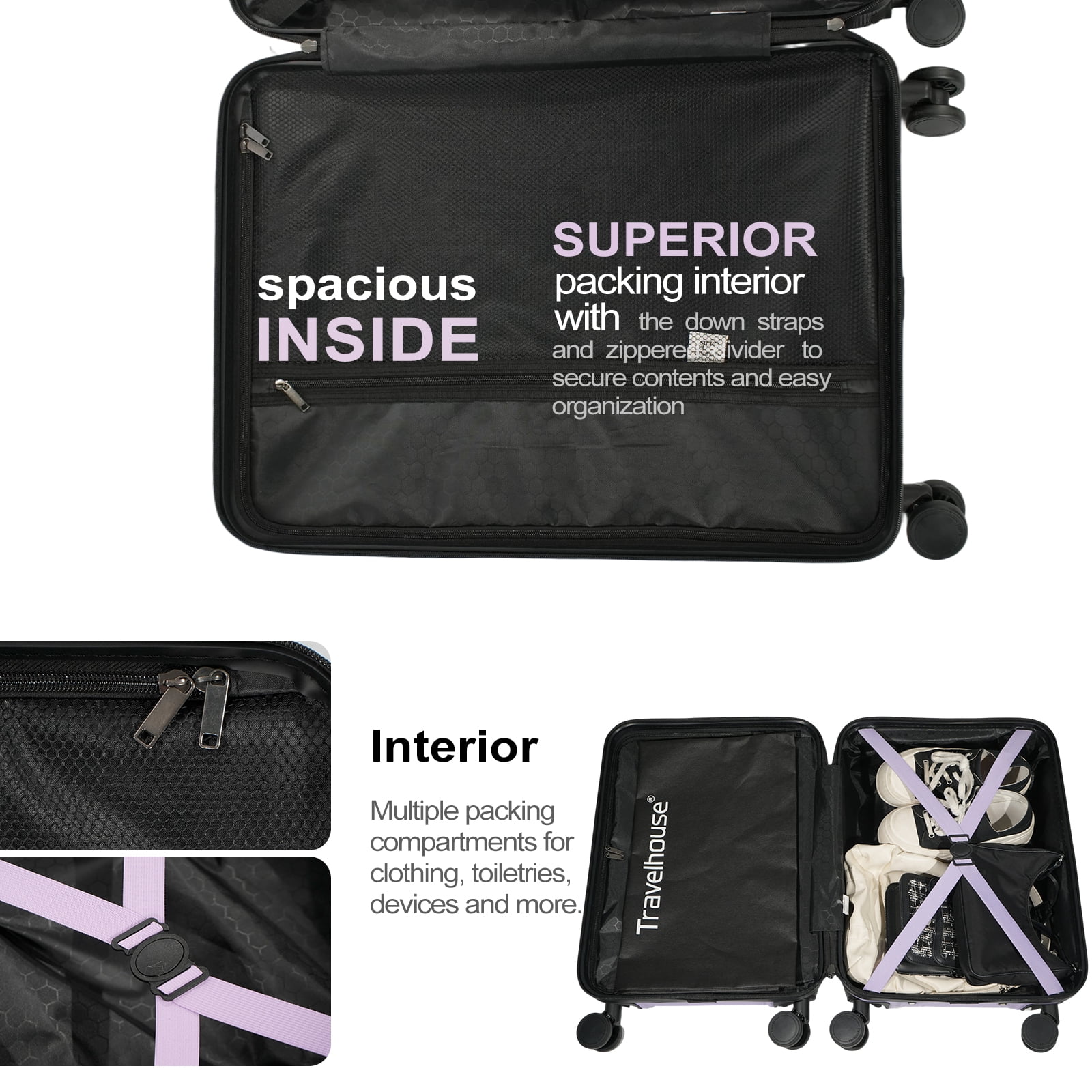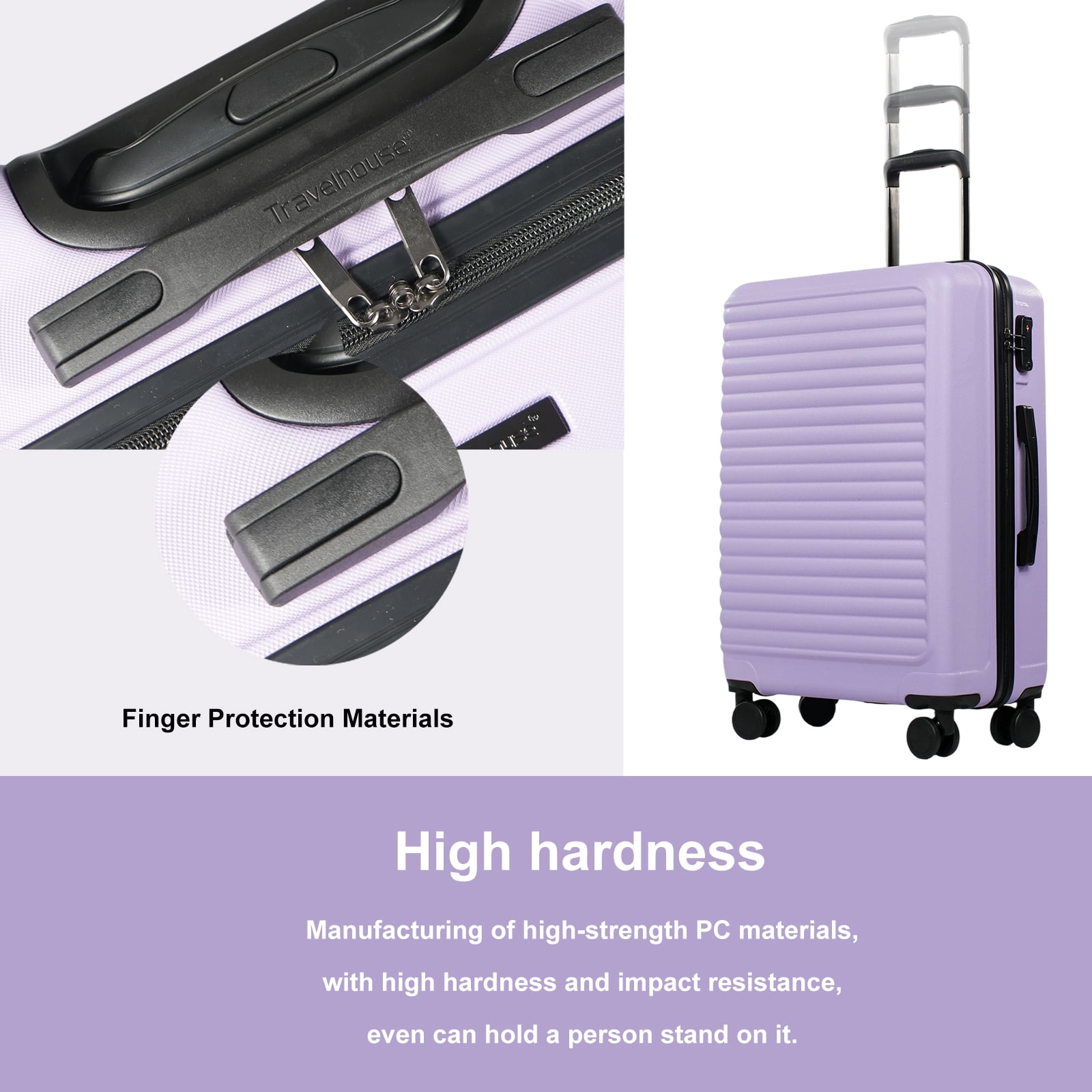 Travelhouse is not just in the business of making luggage, we are in the business of building confidence. Transport your travel essentials effortlessly and stylishly. This extremely lightweight and durable spinner features ABS ,a privacy curtain with its own zippered organizational pockets. Secure Lock approved TSA combination lock for security and peace of mind. Extra Details: 100% ABS material, lightweight, hard side and durable 3-Step Telescoping Handle; 4 Quiet Spinner Wheels; TSA Combination Lock; Top and Side Handles; Organized Interior; Mesh Zip Pocket; Tie-down Straps Luggage Size (Include Wheels) : 20 inch: 15 x 8.7 x 22″ / 38.1 x 22.1 x 55.88 cm 24 inch: 17.5 x 10 x 26″ / 44.5x 25.4 x 66 cm 28 inch: 20 x 11.6 x 30″ / 50.8 x 29 x 76.2 cm Luggage Weight: 20 inch: 5.6 lbs / 2.54 kg 24 inch: 7.1 lbs/ 3.22 kg 28 inch: 8.6 lbs/3.9 kg Luggage Capacity: 20 inch: 38 L 24 inch: 63 L 28 inch: 93 L How to reset a combination lock 1. Lockout is factory set to 0-0-0. 2. Find a small round button near the main slider, press the button with a pen or a pointed object, turn the digital dial, and set a new password. (remember the new password you set) 3. Press the unlock key, the small round button, after reset, your code is now set successfully. 4. Scramble the dials and test your new code to make sure the correct code is set.