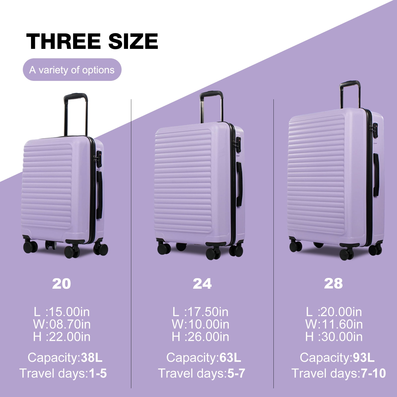 【High Quality Luggage Set】Made of 100% ABS material,this texture is extremely impact-resistant,scratch-resistant,and fairly light in weight, This set weighs only 21.3lb. Best choice for long-term travels and business trips. 【Top material for every part】4x Silent & Smooth Multi-directional Spinner Wheels Can accept a height of 1 meter and a weight of 40kg without breakage;TPR soft handle with straight handle makes you more comfortable when you need to carry; Aluminum pull rod can be adjusted for three lengths. 【Elegant + Practical Design】Features textured finish to prevent against scratches, keeping cases beautiful after a trip; Combination lock +TSA customs lock, better protection of luggage security. The business card is on the outside of the case. You can even hang the Handle Bag on the 4 placement feet. 【Organized & Secure Interior】Interior mesh zip pocket and elasticated,Squared full-capacity design, Capacity : 20in38L 24in63L 28in 93L Warranty:Two Years Warranty. Product incloud: 20in(Comply with carry-on size restrictions for domestic travel); 24&28in suitcase (provide more space).