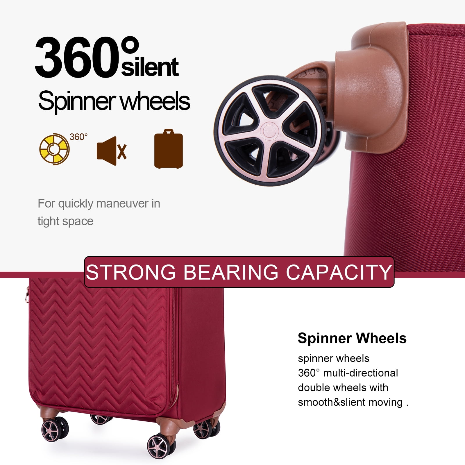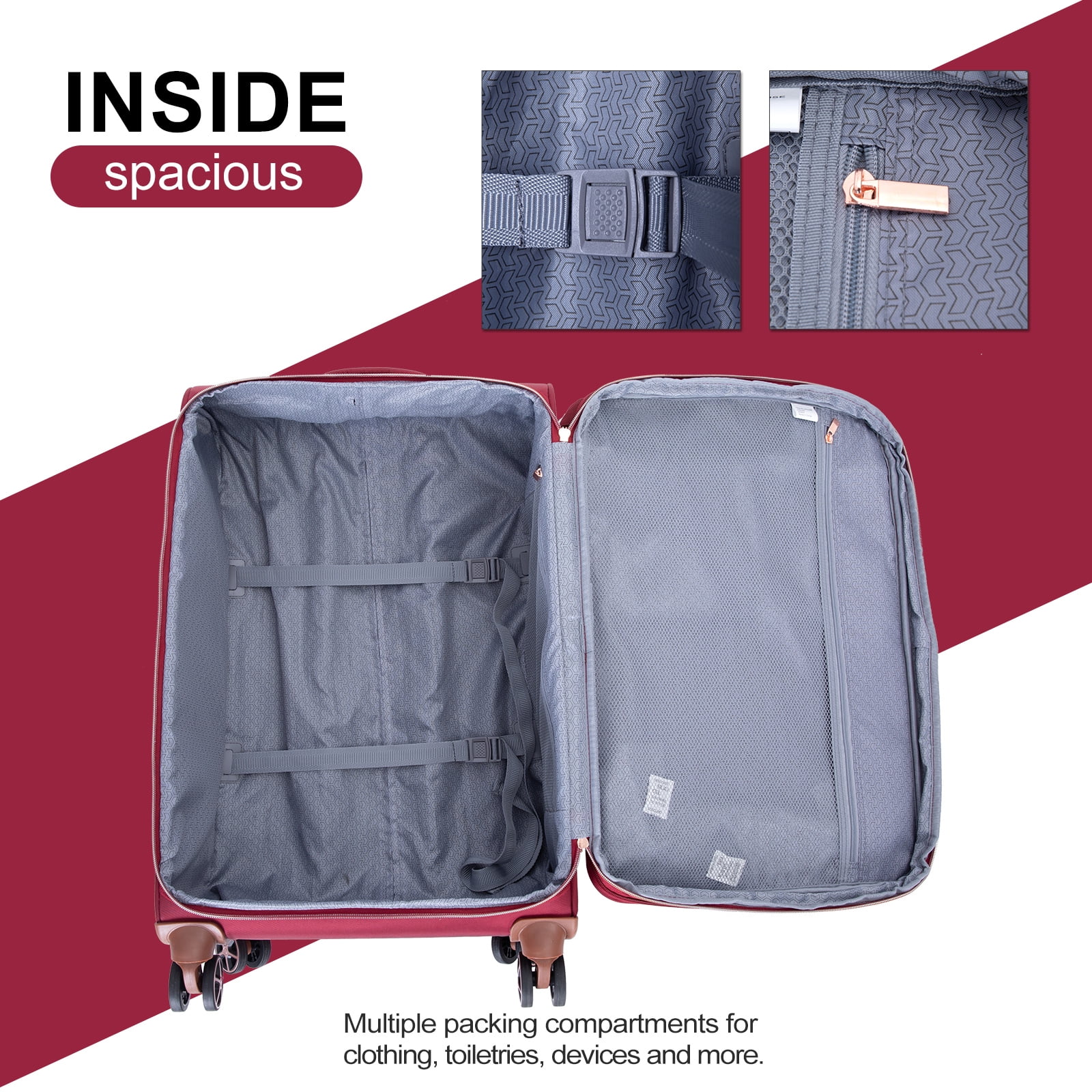 【High Quality Luggage Set】Made of 100% Oxford cloth,this texture is extremely durability,and fairly light in weight, This set weighs only 26lb. Best choice for long-term travels and business trips. 【Top material for every part】4x Silent & Smooth Multi-directional Spinner Wheels Can accept a height of 1 meter and a weight of 40kg without breakage; Aluminum pull rod can be adjusted for three lengths; Oxford backing on the front panel, ensuring that it is built to withstand the rigors of travel. 【Elegant + Practical Design】The aesthetically pleasing wave pattern makes it easier to locate your luggage after checking it in. The expandable feature increases packing capacity by 25%, providing more room for travel essentials. 【Organized & Secure Interior】Interior mesh zip pocket and elasticated,Squared full-capacity design, Capacity : 20in32L 24in63L 28in 93L Warranty:Two Years Warranty. Product incloud: 20in(Comply with carry-on size restrictions for domestic travel); 24&28in suitcase (provide more space); 15 inch tote bag.