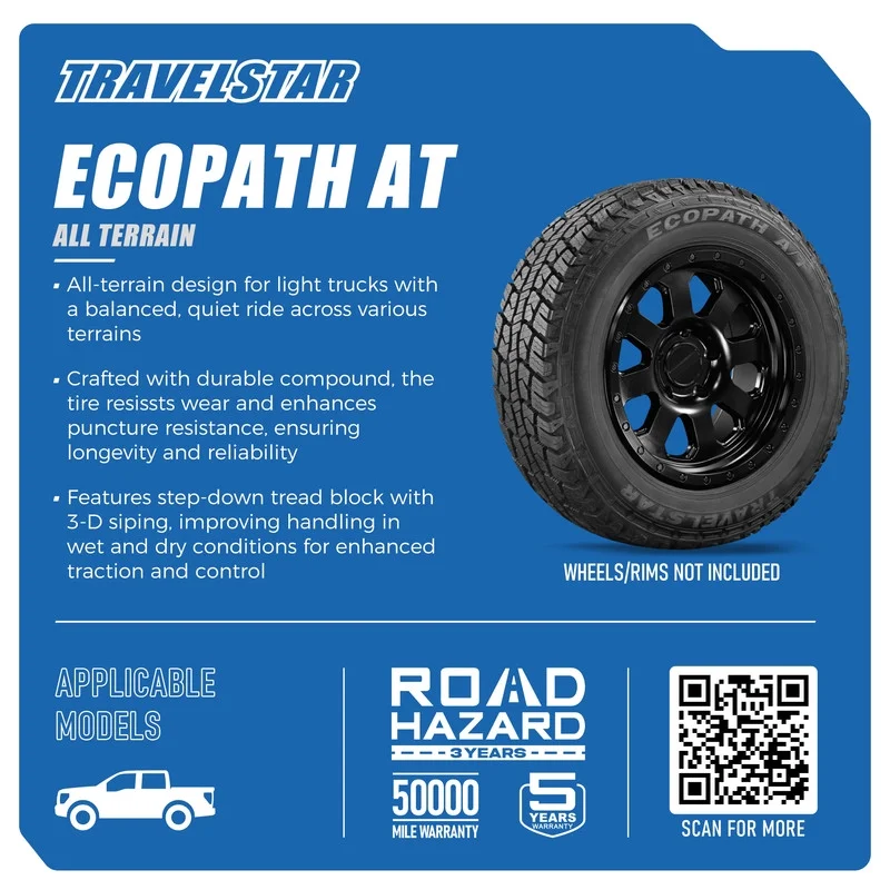 Travelstar Ecopath AT All Season LT275/65R20 LT275/65/20 10 Ply Load Range E 126/123S All Terrain Light Truck Tire 50000 Manufacturer Tread Wear Out Warranty. Road Hazard Warranty. All-terrain design for trucks/SUVs with a balanced, quiet ride across various terrains. Durable compound for tire resissts wear and enhances puncture resistance. Features step-down tread block with 3-D siping, enhanced traction and control. OVERVIEW TRAVELSTAR offers a broad line of passenger, UHP, CUV, SUV, light truck, and specialty trailer tires. Designed, engineered, manufactured, and tested using some of the world’s leading facilities, TRAVELSTAR delivers the performance and quality you can trust.