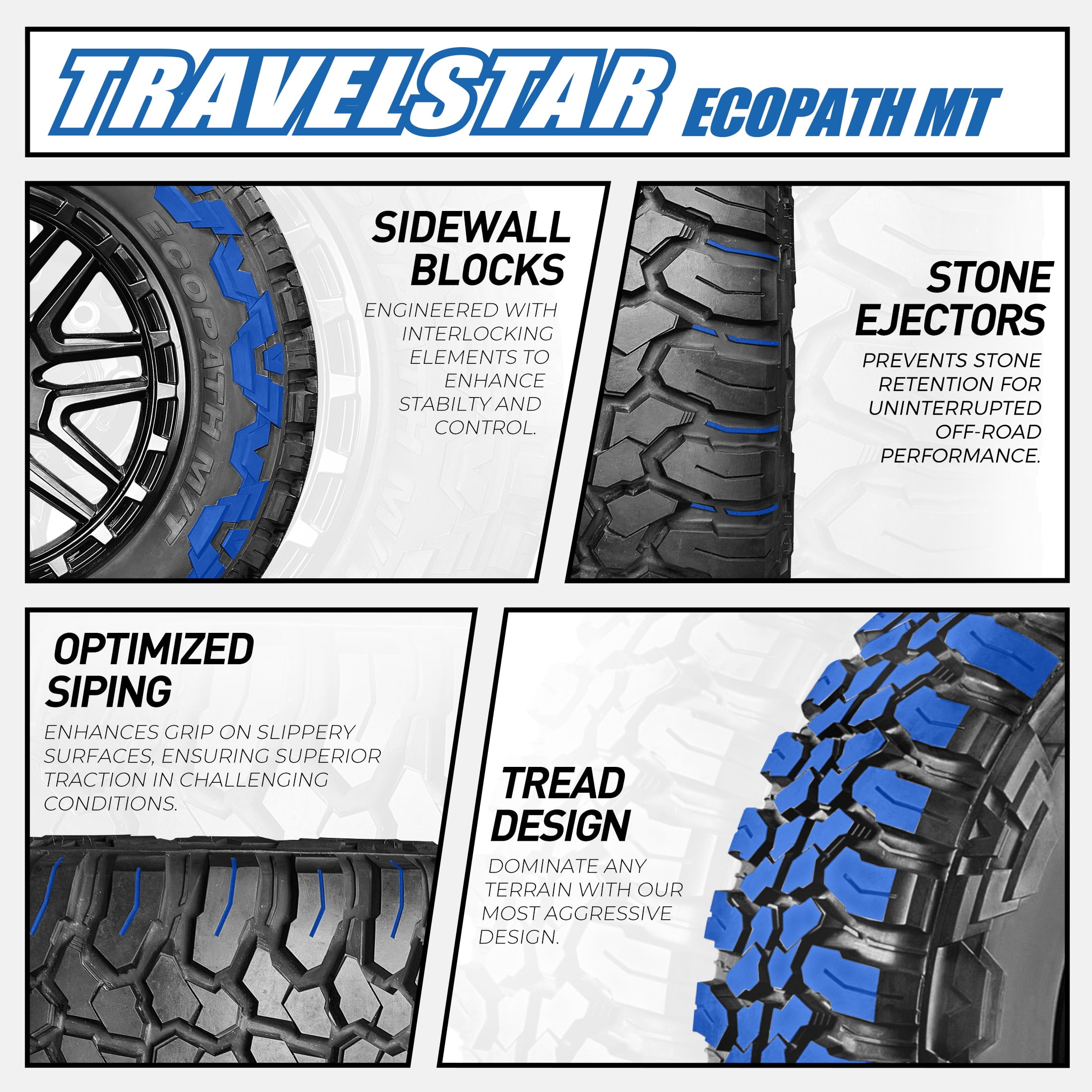 Travelstar Ecopath M/T LT285/75R16 10Ply 126Q Light Truck Mud Terrain Tire 285/75/16(Tire Only) Features And Benefits Road Hazard Warranty Manufacturer Tread Wear Out Warranty All terrain traction Low on-road road noise Durable controllability Self-cleaning tread design OVERVIEW Where are your tires leading you? Whether cruising down the highway or taking the road less traveled, let the Travelstar Ecopath MT tire lead you there. The Travelstar Ecopath MT provides remarkable off-road performance without sacrificing on-road traction. The new generation tread design and open shoulder grooves provide outstanding off-road traction and prevent hydroplaning with wet grip performance. Addition, our tire product comes with a Road Hazard Warranty, and here’s how it benefits you: This warranty provides you with protection against unforeseen road circumstances such as punctures, cuts, or other damages. If your tire gets damaged due to road conditions while driving, our warranty offers support and assistance without any additional expenses on your part.Purchasing our tire product grants you this reassuring Road Hazard Warranty, adding an extra layer of safety to your driving experience!