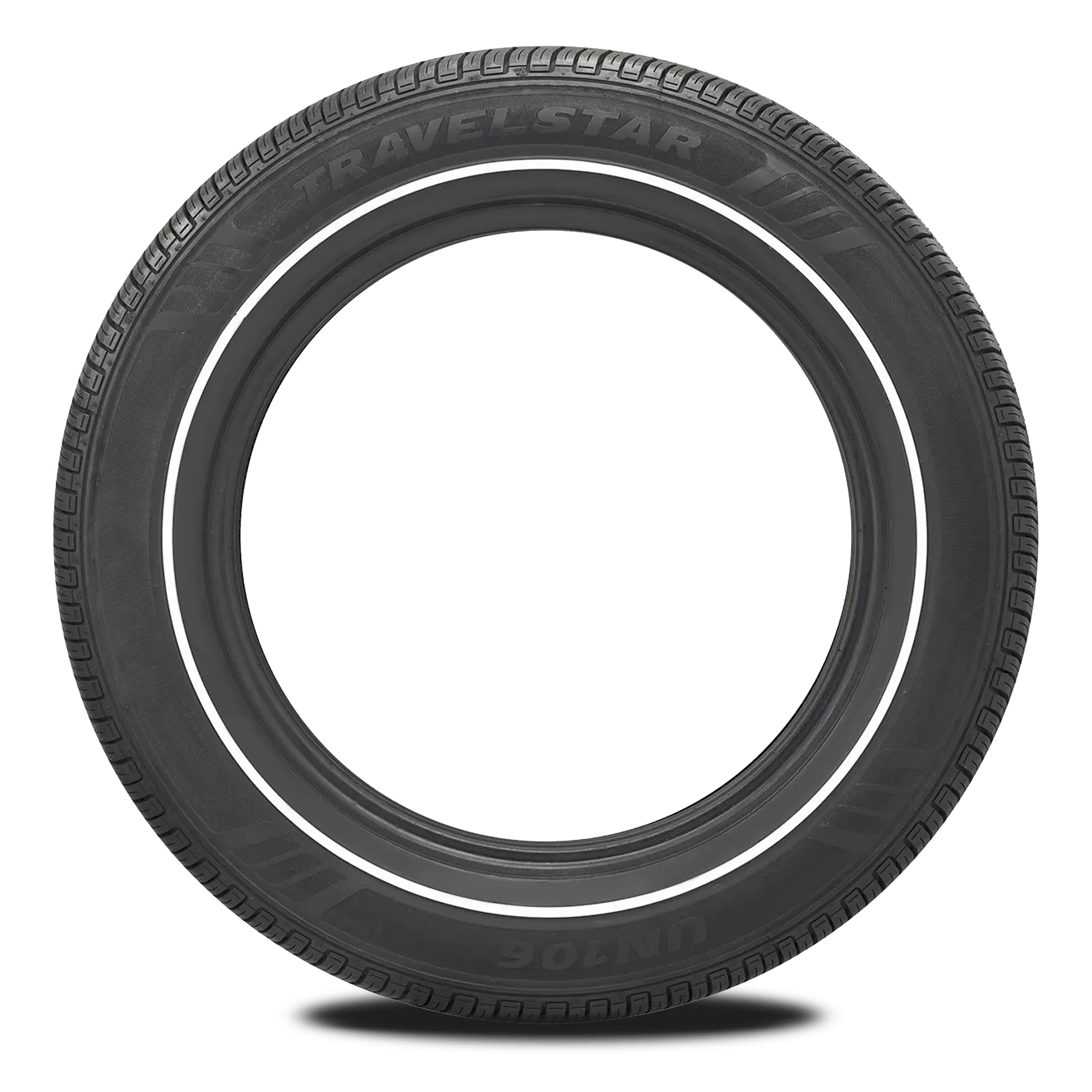 Travelstar UN106 All Season 225/60R16 225/60/16 98T Passenger Tire Narrow White Wall 9mm 50000 Manufacturer Tread Wear Out Warranty. Road Hazard Warranty. M+S rated tread ensures reliability in varied weather conditions. Four circumferential grooves optimize water evacuation. Travelstar UN106 with a sleek white stripe, adding elegance to your ride. OVERVIEW TRAVELSTAR offers a broad line of passenger, UHP, CUV, SUV, light truck, and specialty trailer tires. Designed, engineered, manufactured, and tested using some of the world’s leading facilities, TRAVELSTAR delivers the performance and quality you can trust.