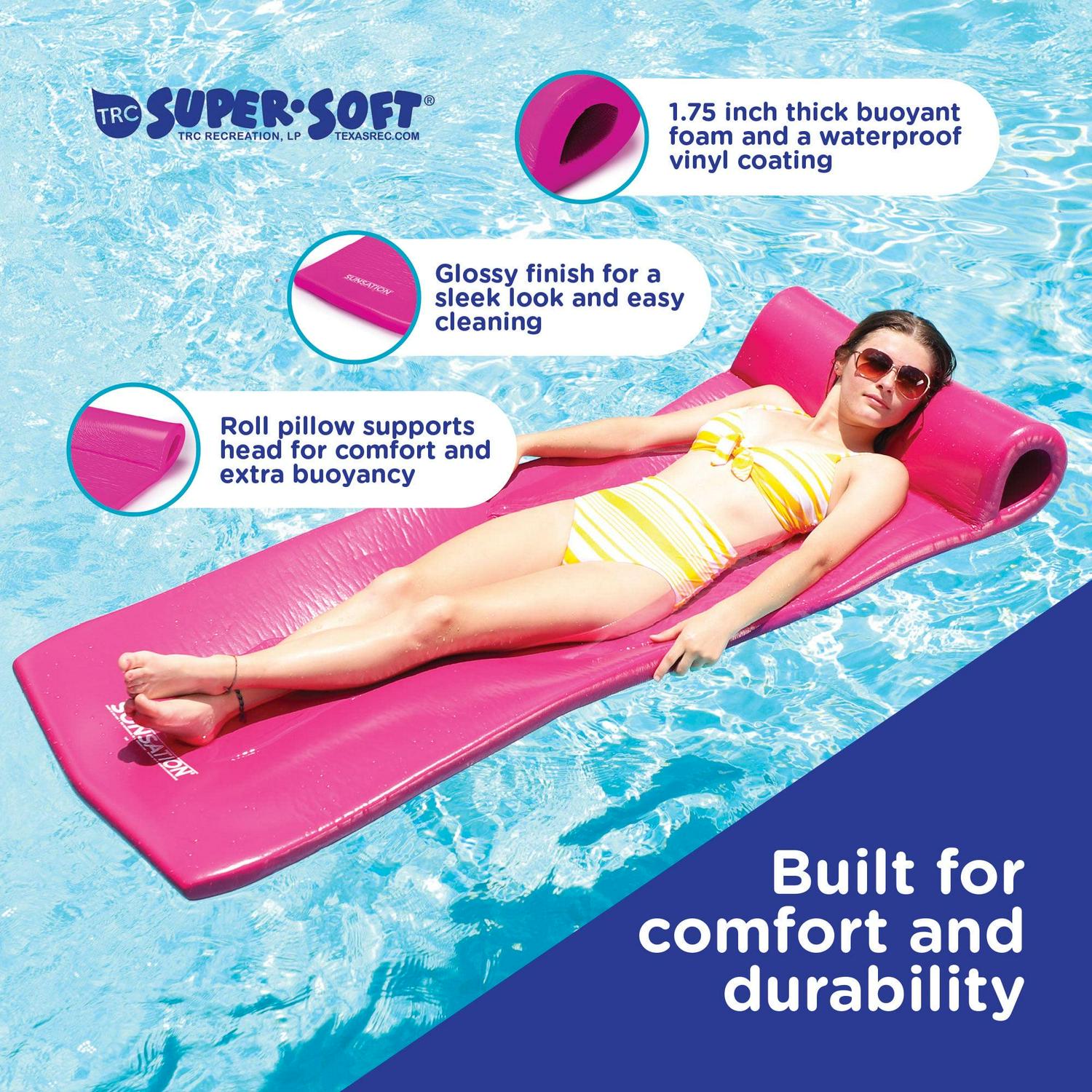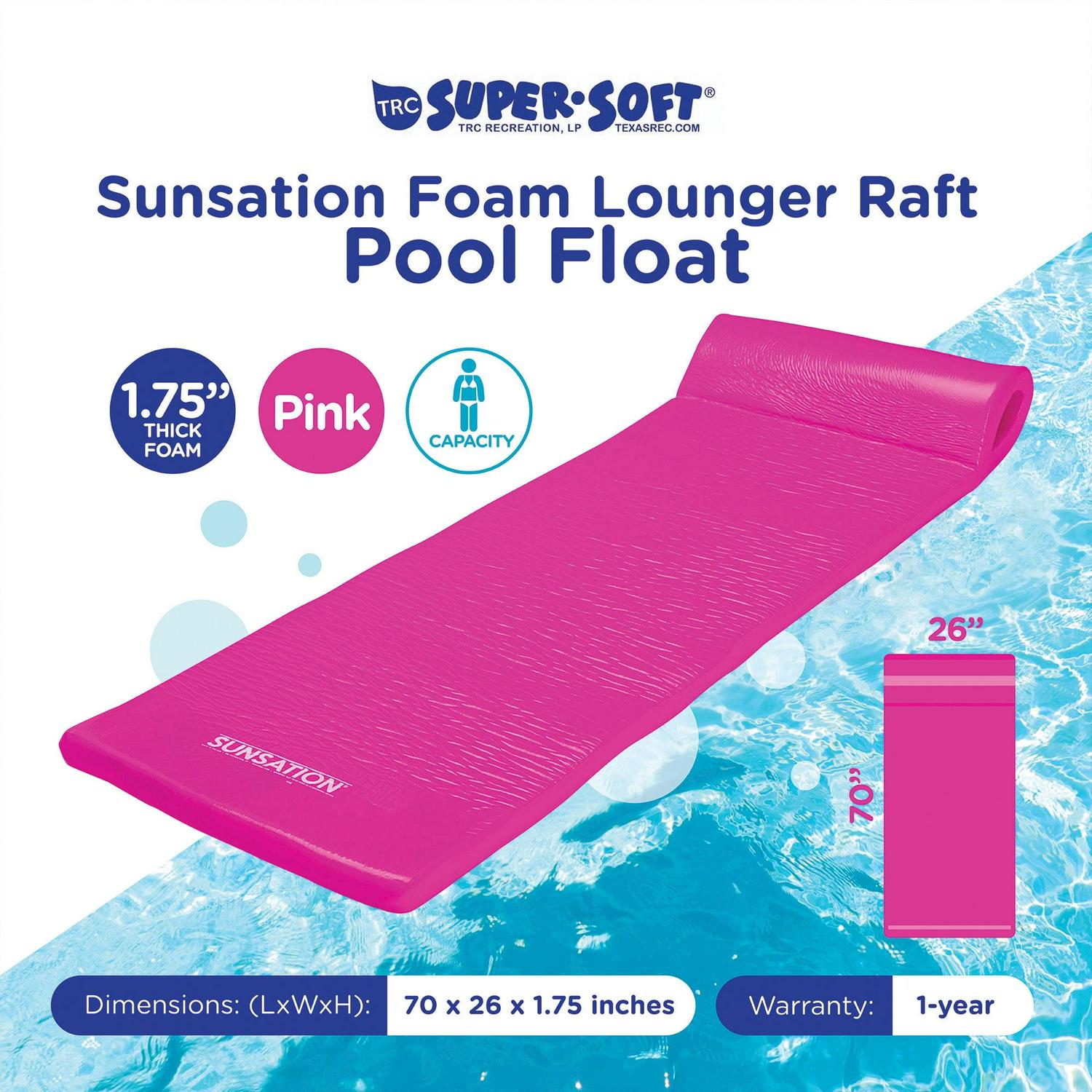 Summertime is a time for fun and relaxation either at the lake or in a pool. From the poolside to the lake, you can relax in style and lounge around without worrying about troublesome air pumps or inflation thanks to the TRC Recreation Sunsation Lounger Raft Pool Float. Durable and amazingly buoyant, this pool mat is crafted with tough yet comfortable 1.75-inch thick foam. The smooth vinyl coating protects this pool float chair from water absorption, so you don’t have to worry about sinking or any potential leaks that deflate in the middle of the pool or lake. Measuring 70 inches long and 26 inches wide, this pool float is large enough for a full-sized adult and features a roll pillow to support your head and neck, providing extra buoyancy as you float along. Additionally, the roll pillow aids in carrying convenience as you take it with you to the beach. The pool and lake lounger is easy to clean by simply wiping the mat down with a damp cloth as needed. Take your relaxation to the next level this summer and catch those sunny rays in comfort. The TRC Recreation Sunsation Pool Float is built for comfort and durability, so choose this lounger the next time you hit the swimming pool. Spend more time lounging in the water and less time inflating pool floats that take time away from your summer.