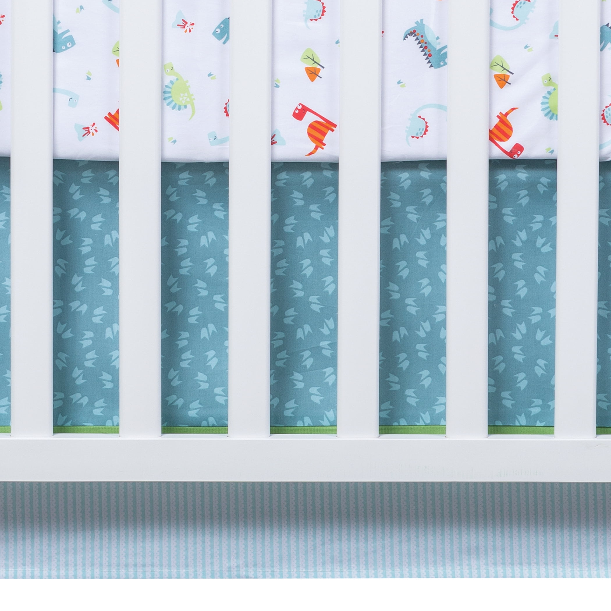 Your little one?s imagination will roar with the Dinosaur Roar Crib Bedding Set by Trend Lab. Friendly pre-historic dinosaurs alongside trees, volcanoes and adorable prints mix with a variety of different textures to take your little one on an exciting adventure. Scallop stripes, bones and dinosaur foot prints are showcased in the fun color palette including orange, mandarin red, mint, dusty blue, light green, green, silver and glacier gray. Coordinating Dinosaur Roar accessories are sold separately. Please adhere to JPMA?s Safe Infant Bedding Practices. Set includes: Quilt, Crib Skirt and Fitted Crib Sheet Quilt measures 35 in x 45 in Crib Skirt fits standard crib mattress 28 in x 52 in with 13 inch drop Fitted Cotton Crib Sheet fits standard crib mattress 28 in x 52 in with 8 inch deep pockets and is fully elasticized