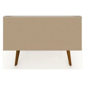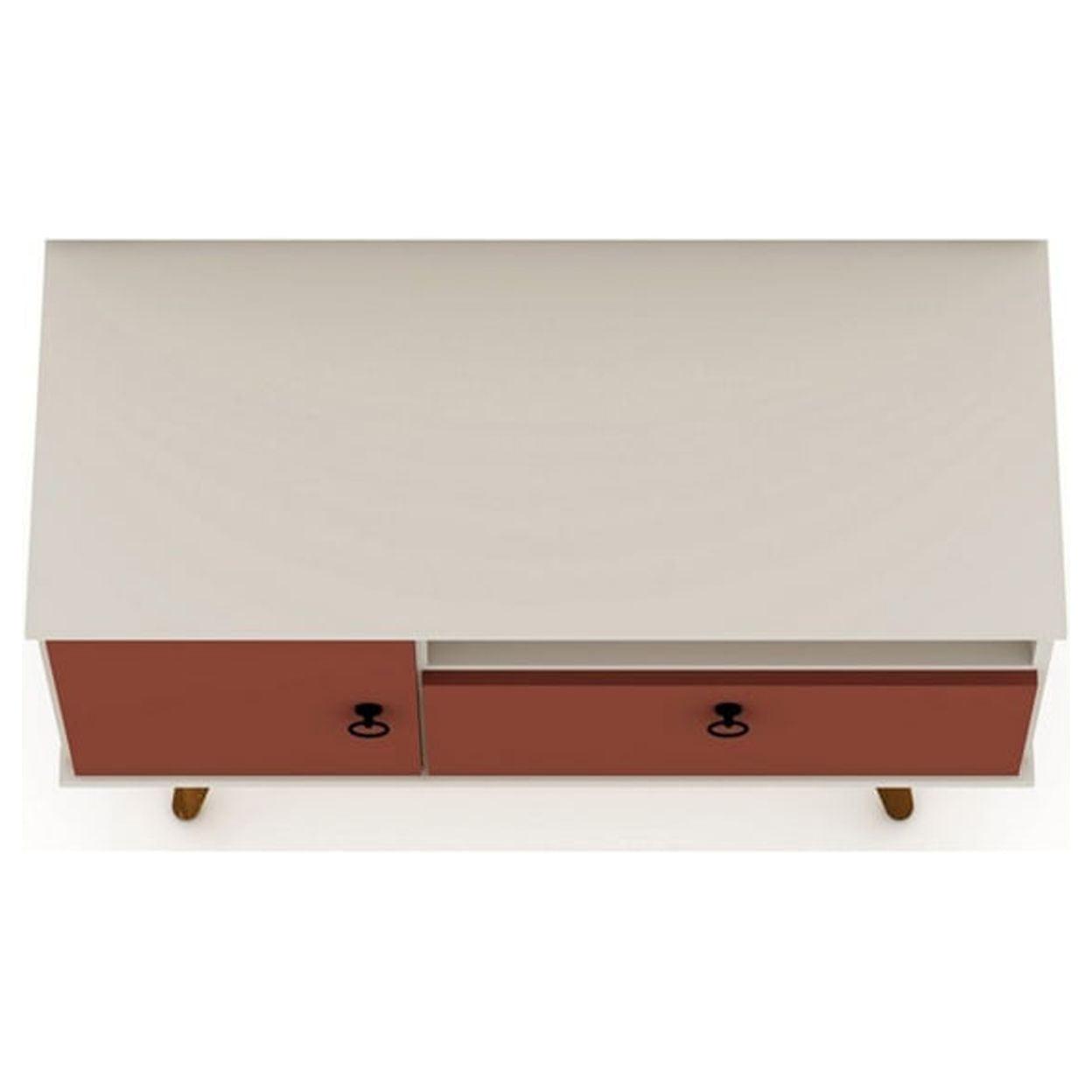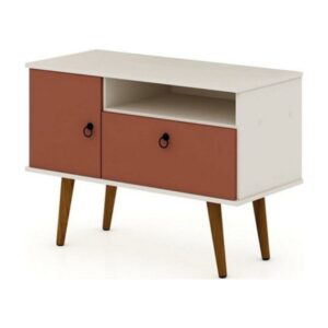 Tribeca 35.43 Mid-Century Modern TV Stand with Solid Wood Legs in Off White and Terra Orange Pink Part dresser, part living room entertainment focal point, the Tribeca TV stand is Mid-century modern at its best, and is as versatile as it is functional. This piece couples as a dresser and easily showcases your television, tucking away any media accessories in the concealed shelving space, while an open shelf perfectly fits a DVD player or laptop. In the bedroom or in the living room, stow throw blankets, clothing, or table linens, this piece goes easily from space to space and blends with existing decor to create a statement. Splayed legs and clean lines make for a seamless look.