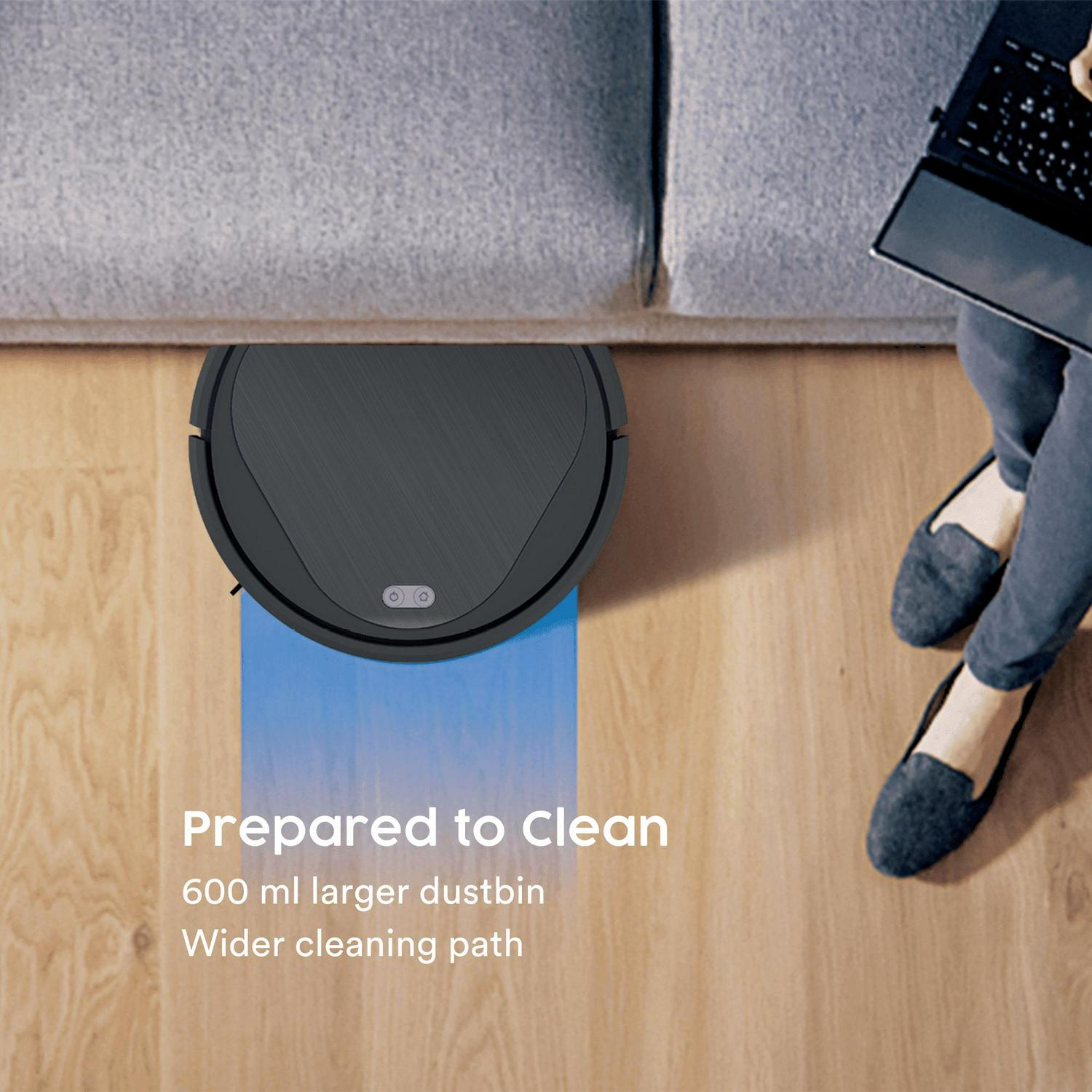 – Scheduled Clean: Longer main brush and six-claw side brush create a much wider cleaning path and quicker work of any room. A larger dustbin makes less-frequent emptying.