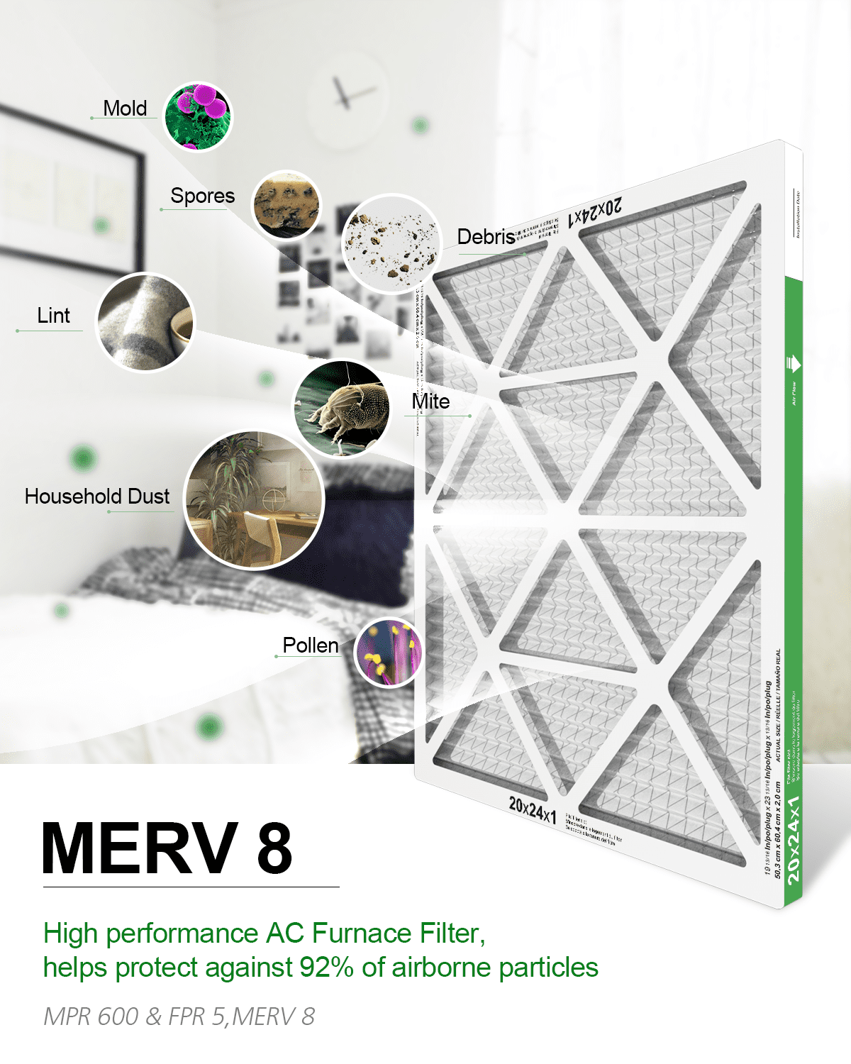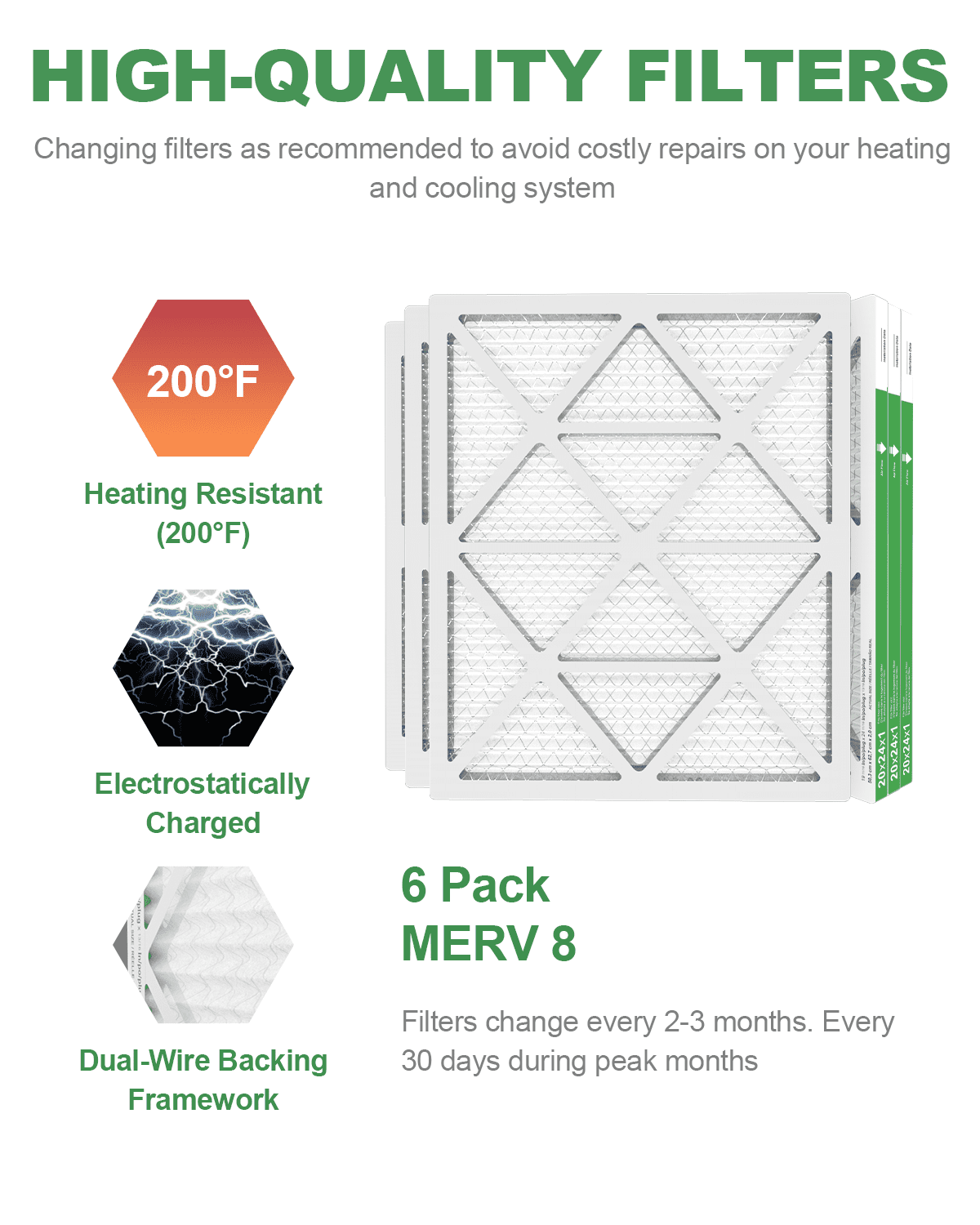 TRIGHTFILTERS 20x24x1 MERV 8 Pleated Air Filter, AC Furnace air filter 6 Pack MERV 8 pleated air filter works with furnaces, air conditioner, HVAC systems, house vents, air purifiers, and dehumidifiers, for almost any brand AC furnace filters can capture unwanted air particles, including household dust, microscopic particles, lint, dust mites, spores, and pollen Actual size (exact dimensions): 19.81×23.81×0.81 inches MERV 8 electrostatic media protects against 92% of particles Easy-to-understand arrows have been added to make installation easier High-quality cardboard is sturdy and moisture resistant Aluminum wire grid support formation and non-collapse No noise during use, protecting your ears and those of your family. air filters 20x24x1 change every 2-3 months, every 30 days during peak months Advanced pleating technology traps more unwanted airborne particles and lasts 3 times longer than fiberglass merv8 has better air permeability, providing better airflow and efficiency