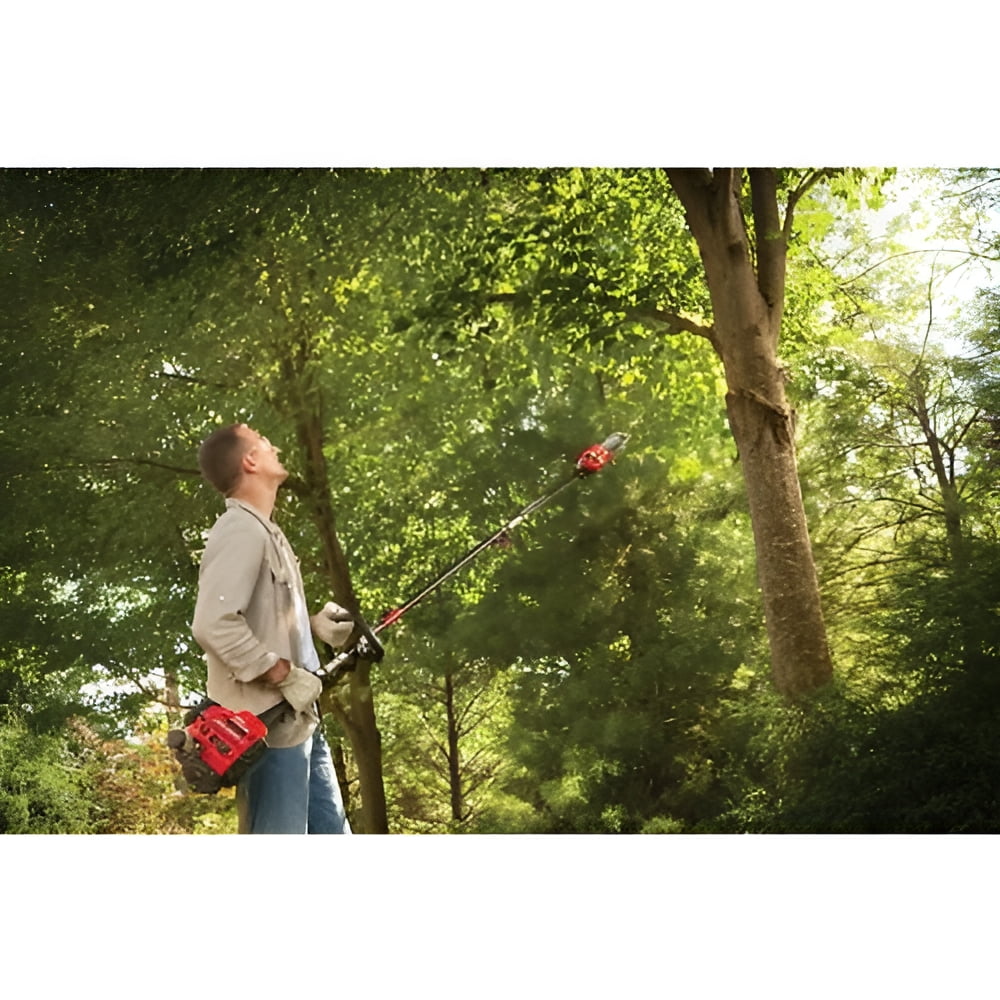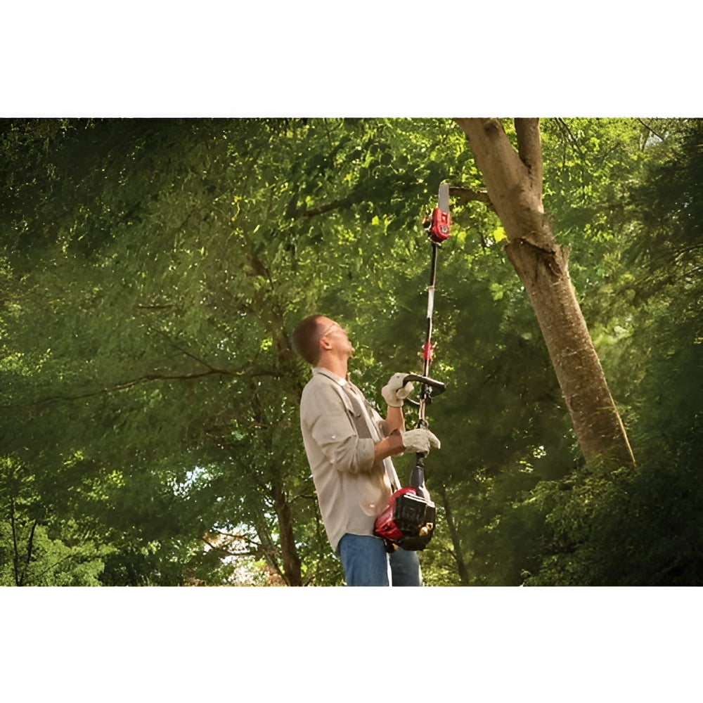 The **Trimmer Plus PS720 Pole Saw Attachment** is and add-on to your attachment-capable string trimmer with no tools. Perfect for pruning and cleaning up your trees and hedges. The add-on TrimmerPlus PS720 pole saw can be used to trim branches on trees without using a ladder. The 8-inch bar and chain is lubricated with an automatic oiler to maintain peak cutting performance while providing effective overhead cutting. – Extension boom included for up to 12 ft reach depending on operator height – 2 extension sections allows for 2 height options – Connects to attachment-capable trimmers, including Troy-Bilt, Remington, and Craftsman