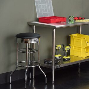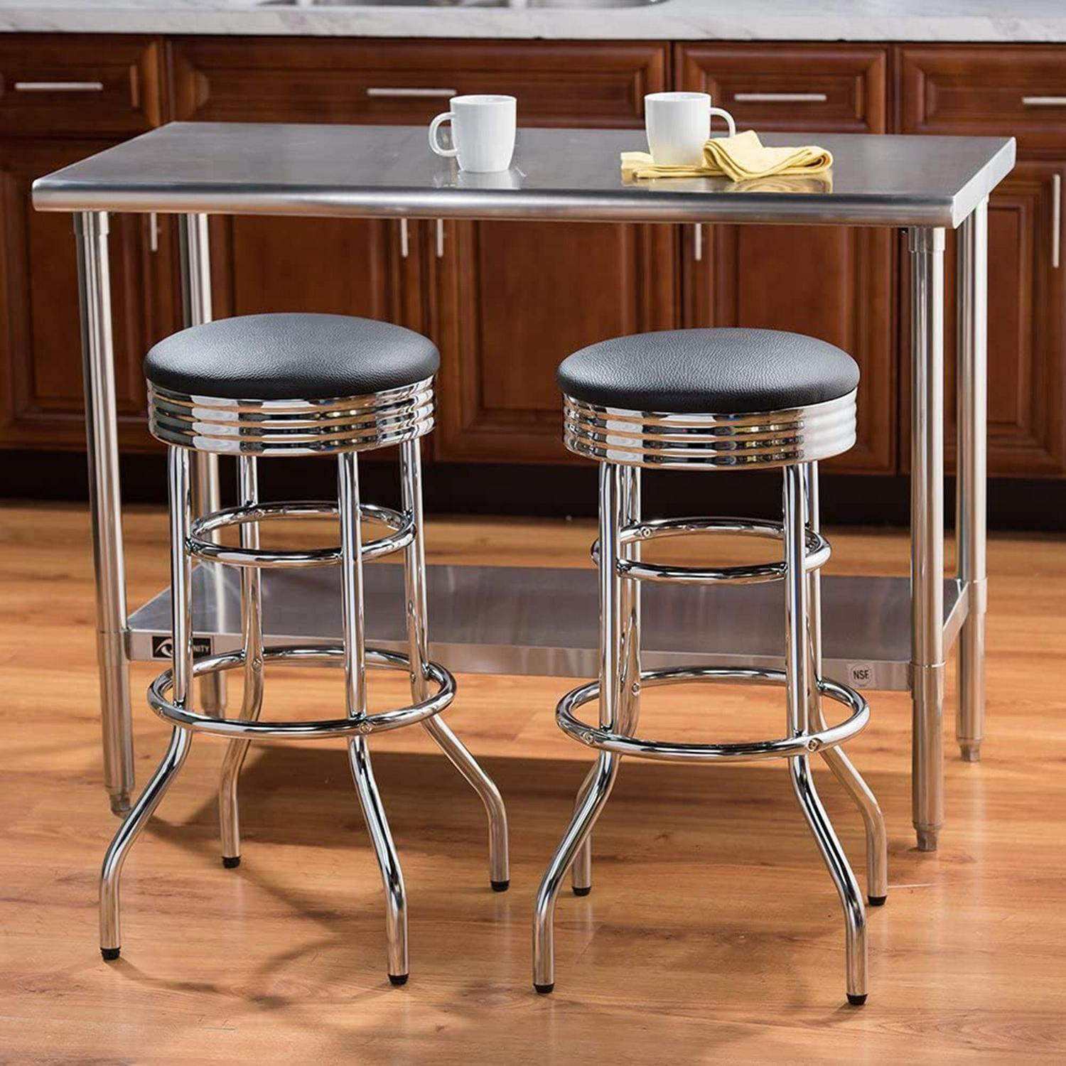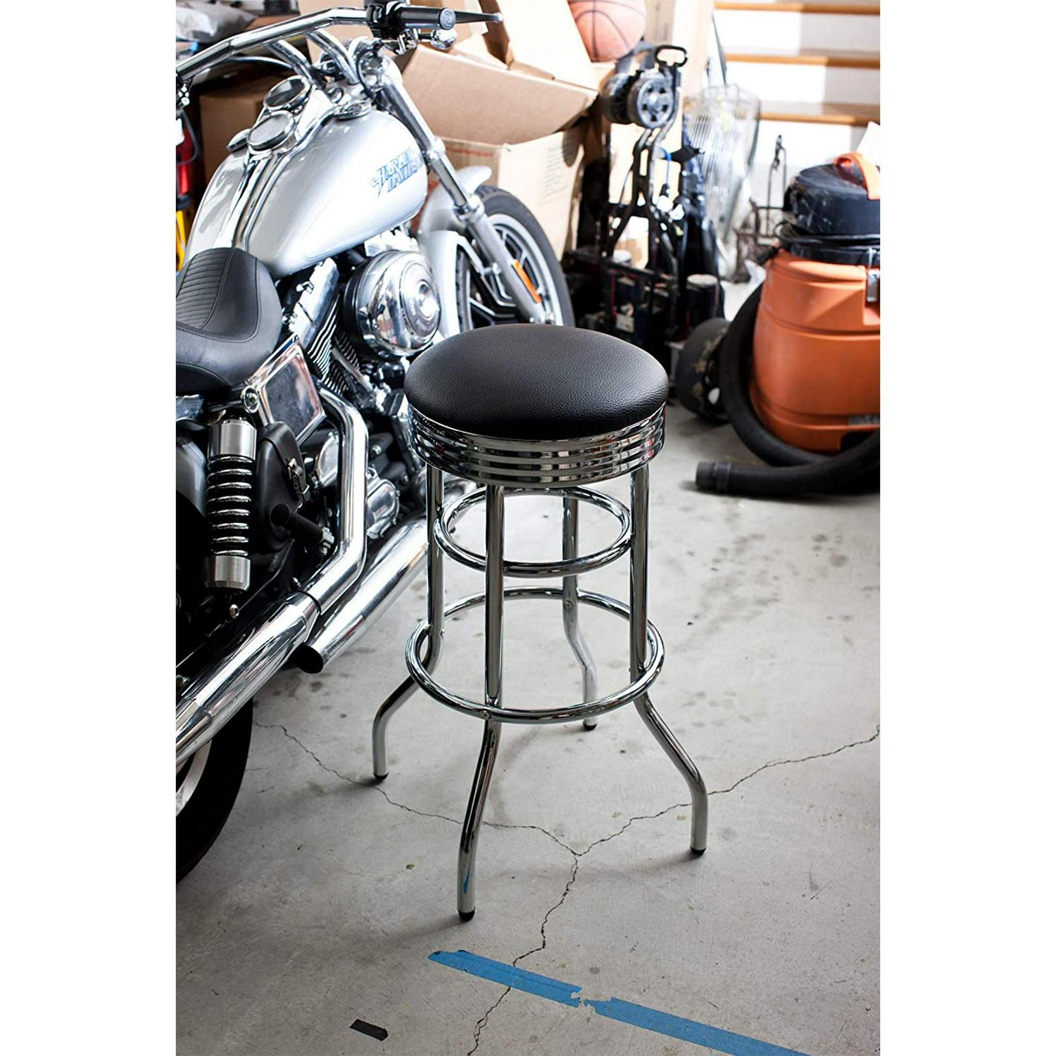 When you need a comfortable place to sit in your kitchen, workshop, or garage, turn to Trinity for the 30 Inch Double Ring Faux Leather Swivel Seat Bar Stool 2 Pack. This comfortable 30-inch tall bar stool is great for any space from kitchen islands to mechanic garages with a cushioned faux-leather seat that swivels 360 degrees and is padded for an enjoyable experience whether sitting for short or long periods. The durable, high gloss chrome-finished steel frame provides a retro, sleek look and is clean to clean and maintain. Built to last, these stools feature a reinforced double-ring frame that bolsters the legs and base for added strength and stability. The included feet levelers ensure a level placement on any surface and even weight distribution for added comfort. Assembly is quick and easy with the included instructions, allowing you to start using your new stool set right away. Finish your workspace, kitchen bar, or game room with this 2-pack of stylish, fun, and comfortable Trinity 30 Inch Double Ring Faux Leather Swivel Seat Bar Stools.
