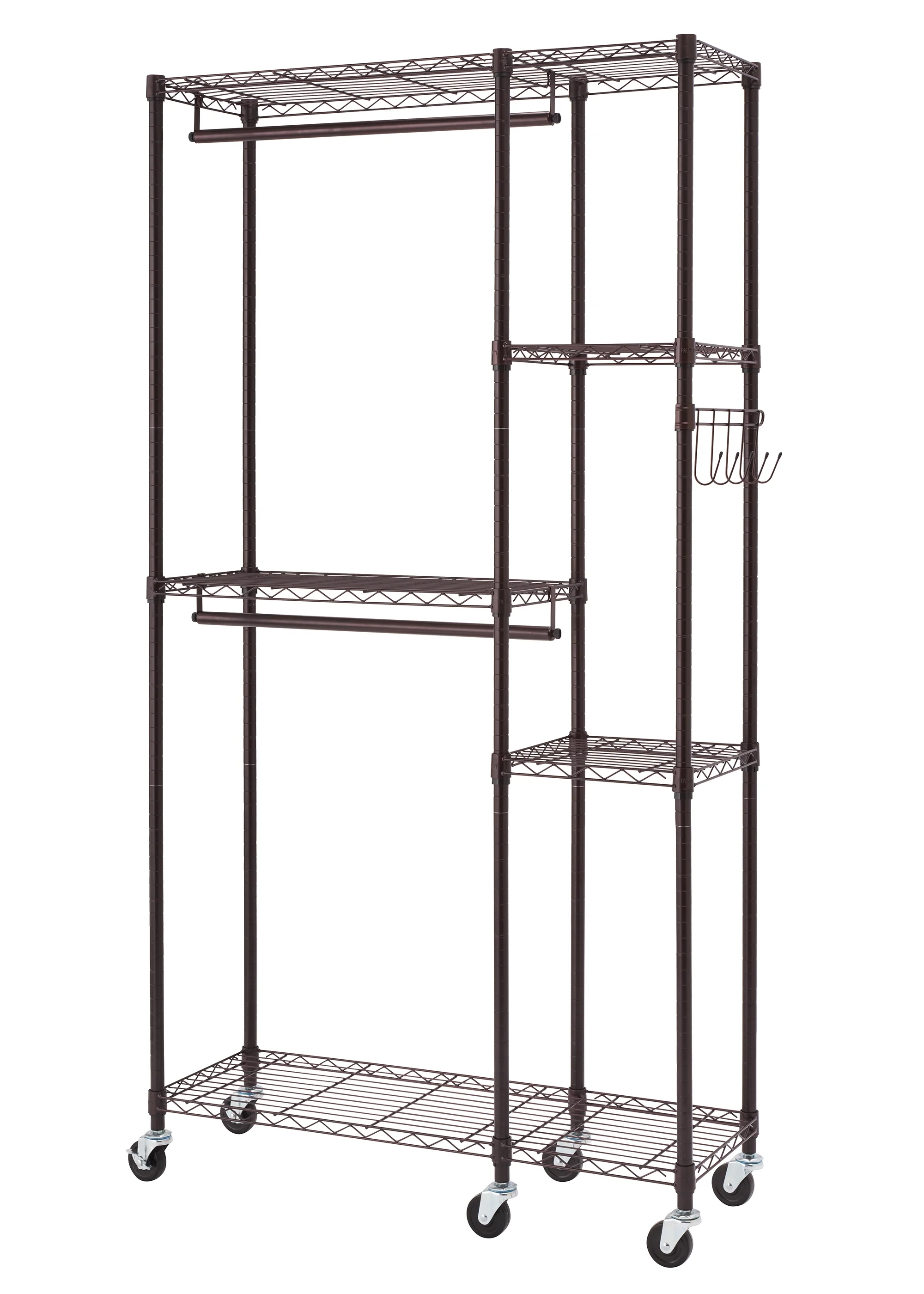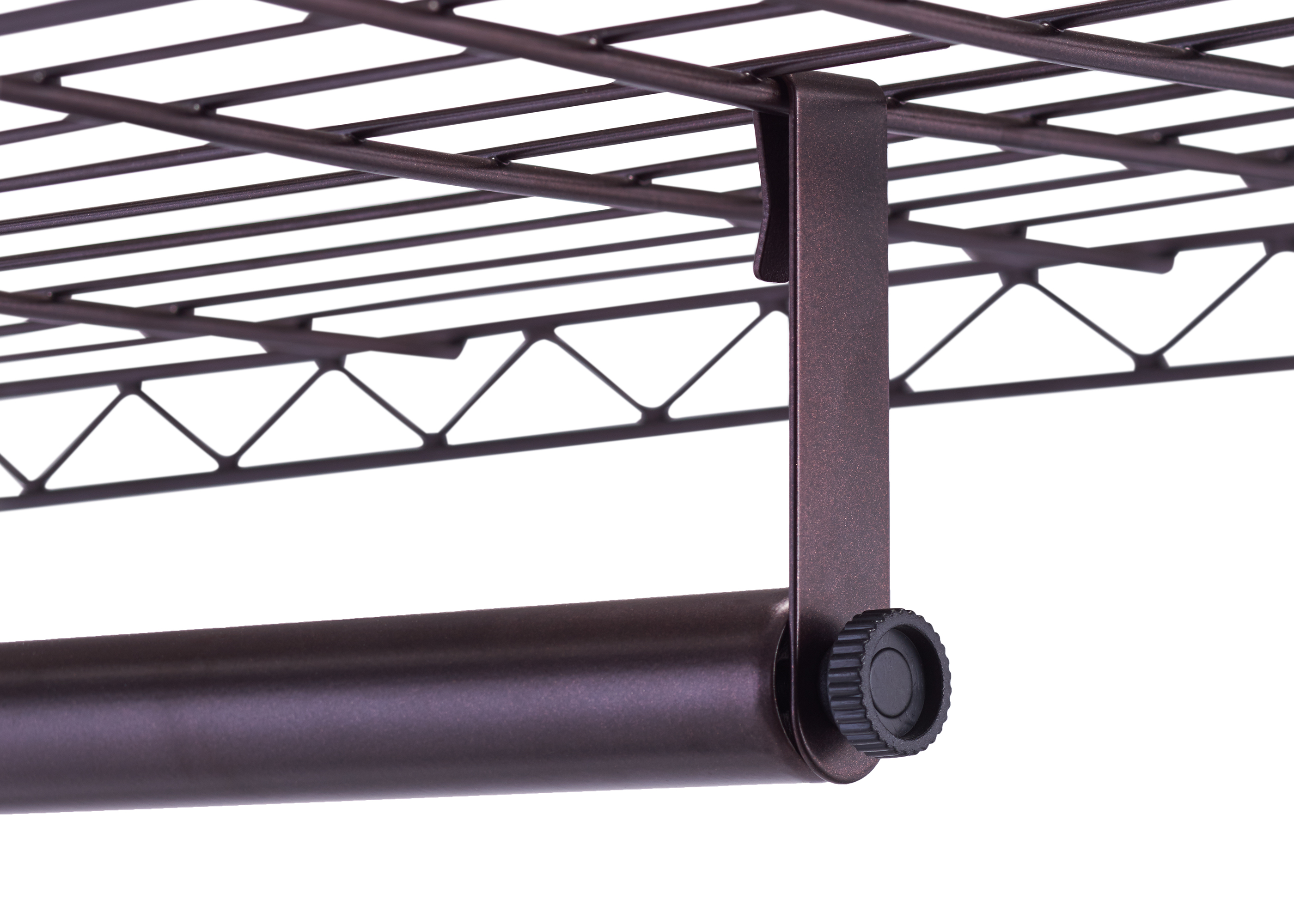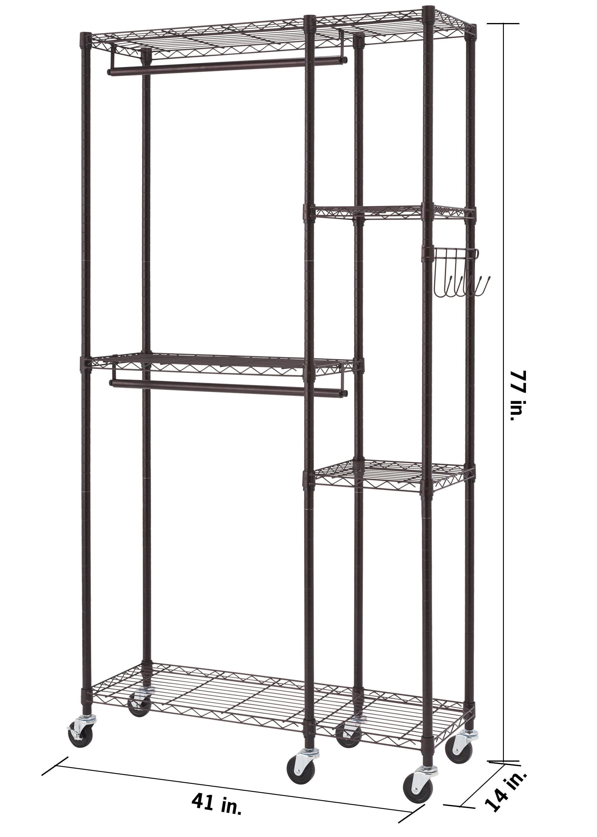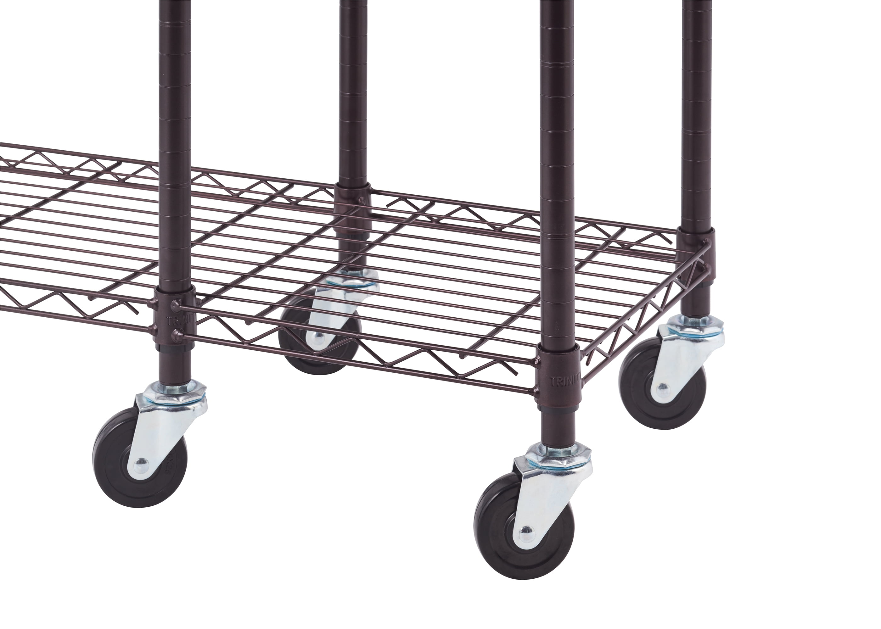Dark bronze powder coated finish (2) 41″ W x 14″ D shelves – 60 lbs. per shelf (1) 28″ W x 14″ D shelves – 40 lbs. per shelf (2) 14″ W x 14″ D shelves – 25 lbs. per shelf (2) Hanging rods – 40 lbs. per hanging rod (1) Sidebar w/ hooks – 10 lbs. total weight capacity 300 lbs. total weight capacity (6) 3″ x 1″ swivel wheels – (2) locking, (4) non-locking Shelves and sidebar adjustable in 1″ increments Easy, no-tool assembly