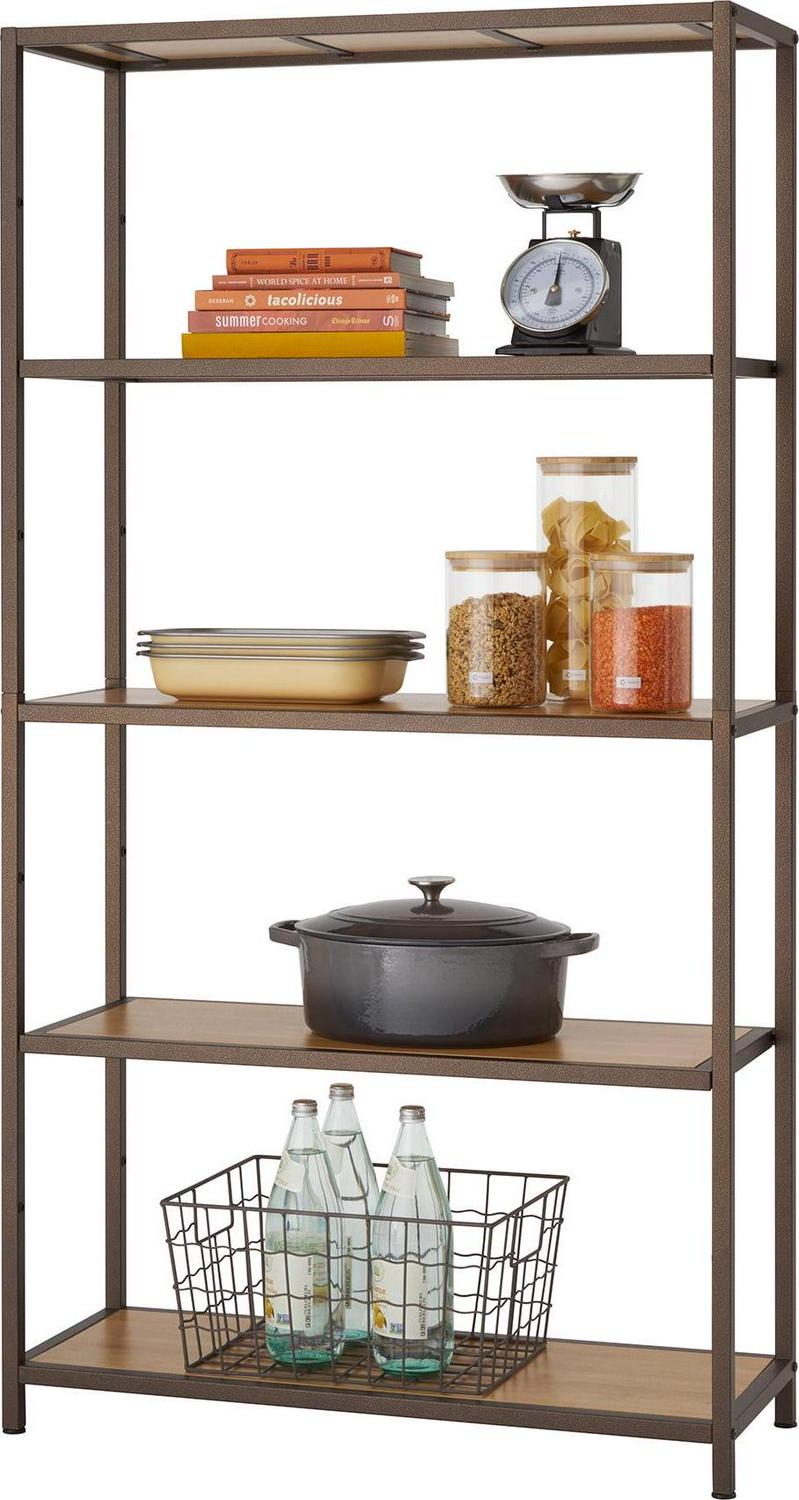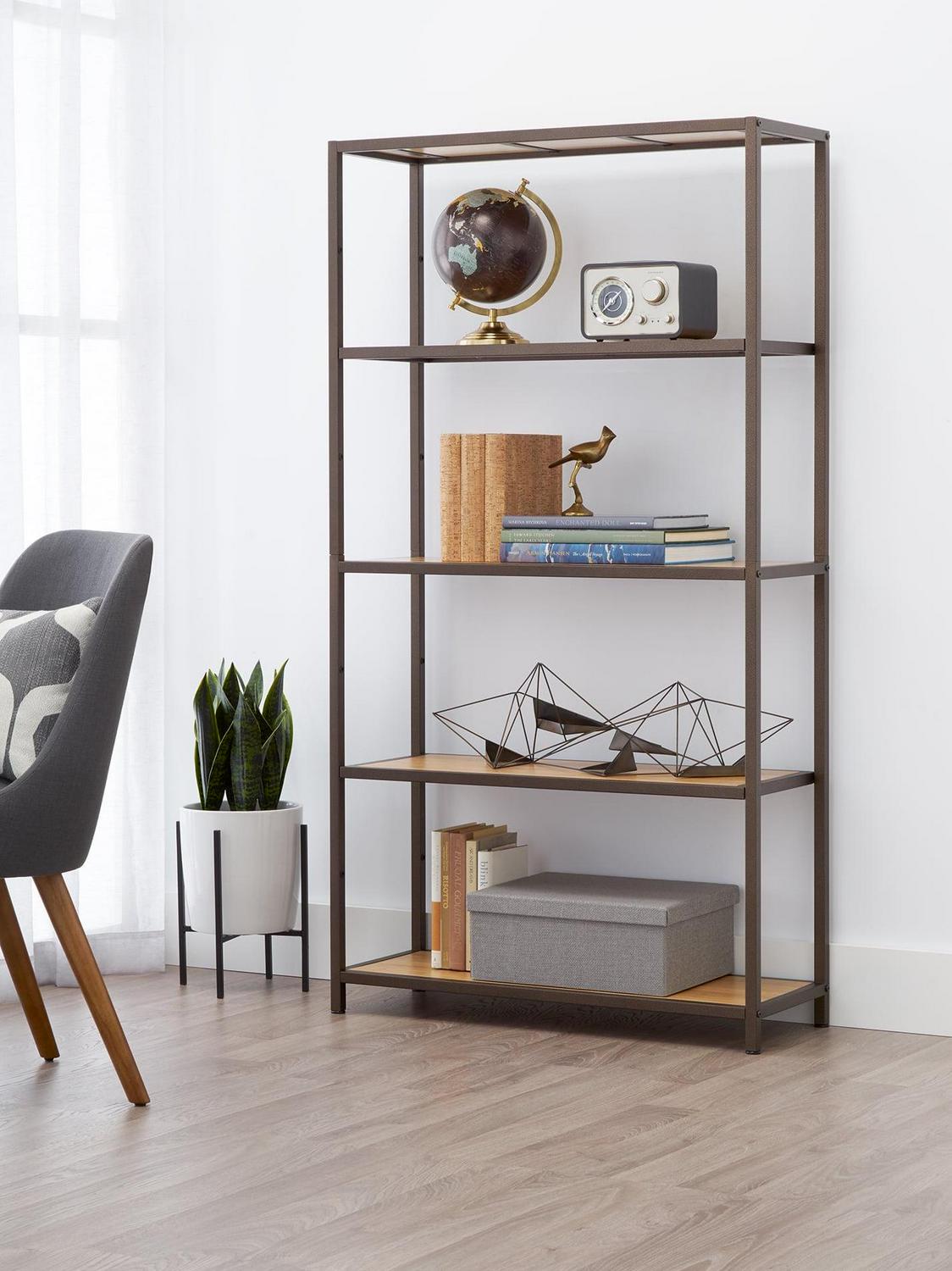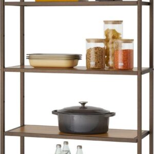TRINITY’s 5-Tier Bamboo Shelving Rack is decorative storage with a sturdy and functional design. The clean modern lines with bronze anthracite finish and natural bamboo shelves, makes this shelving rack perfect to blend with furniture and a variety of decors. The shelf height can be customized in 7″ increments to store items of all sizes. Designed with an easy, no tool assembly.