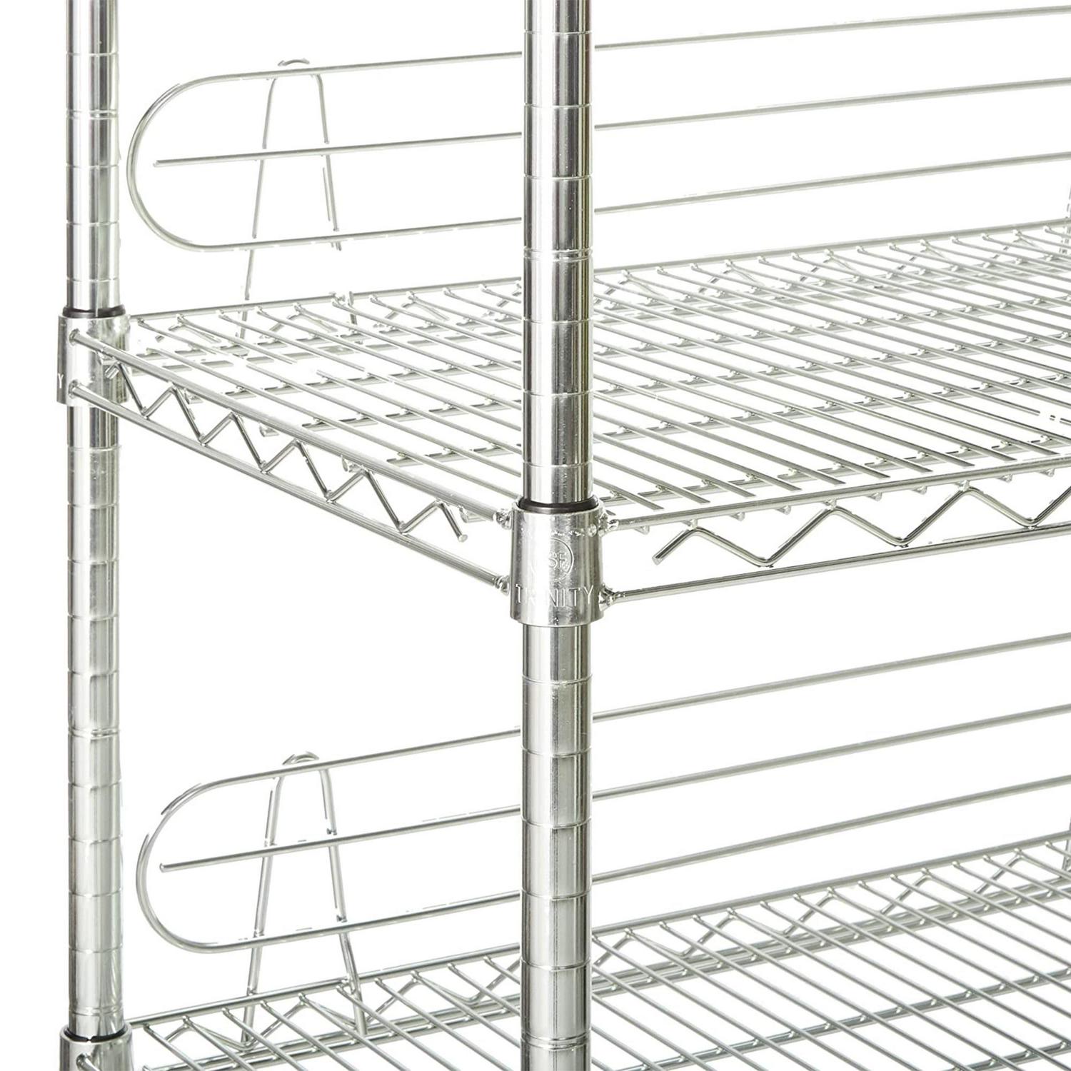Bring extra space and organization to your industrial space, garage, or commercial kitchen with Trinity’s 6-Tier Wire Shelving Rack on Wheels. The commercial-grade shelving unit is sturdy, with an 800-pound weight capacity per shelf (on feet levelers) in order to hold all of your items, both large and small. The NSF-certified shelf has an EcoStorage finish that eliminates toxic chemicals during production. The shelving is a commercial grade, making it ideal for business use. It is equipped with swivel casters, making moving and transport easy. The wire rack also contains backstands to ensure that your products do not fall off the shelves. With no tools required, assembly of the wire shelving rack is easy, and the slip-sleeve locking system allows the shelves to be adjusted for added height versatility.