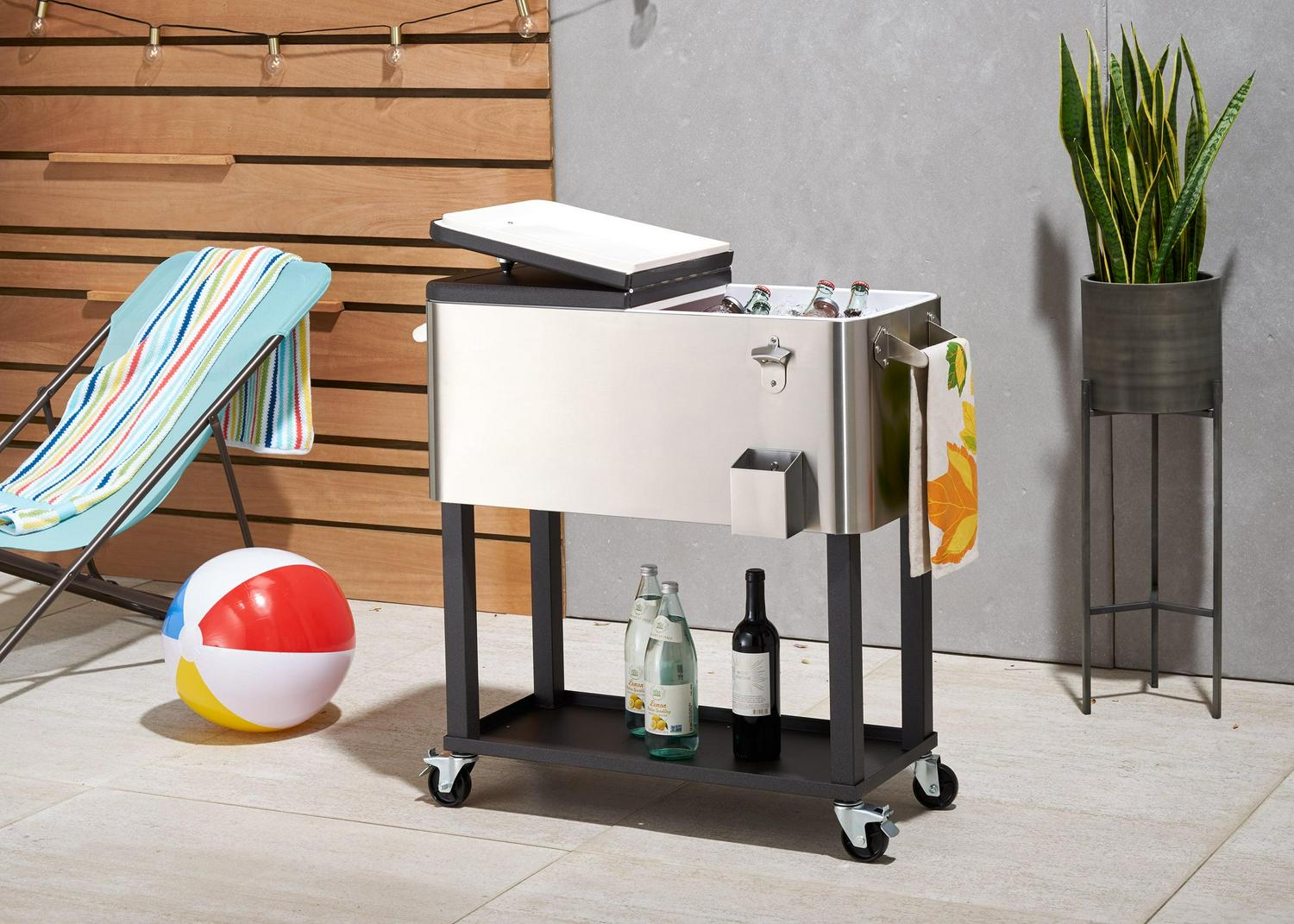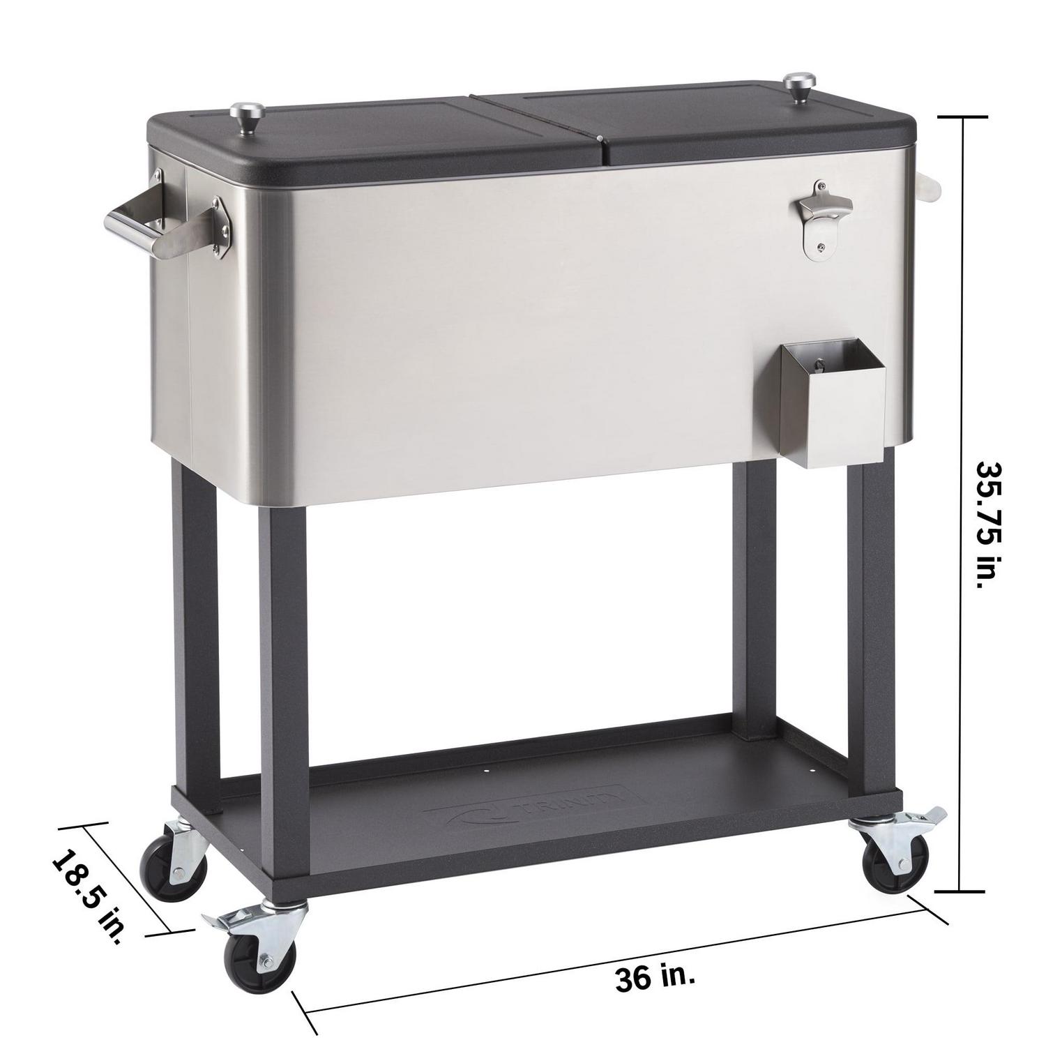 Entertain in style with an 80 quart/20 gallon/96 aluminum can capacity stainless steel cooler. This sleek stainless steel cooler/ice cart is especially convenient with its raised design and wheels, as well as with the bottle opener and cap catcher. The bottom shelf also provides extra storage space allowing for easy refills, or anything else that needs to be carted outside.