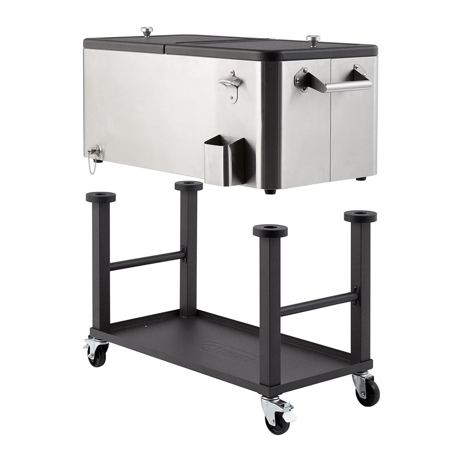 Perfect for backyard parties and barbecues, the Trinity 80-Quart Stainless Steel Cooler and Ice Cart keeps all your favorite beverages cold and close at hand. Holding up to 96 aluminum cans in the 80-quart (20-gallon) interior space, the cooler entertains guests by keeping drinks at an icy temperature. The raised design holds beverages at a convenient height, and the bottom shelf provides extra space for storing refills or carting other items outside. Easily pop open bottles with the integrated bottle opener and never worry about waste as the cap catcher grabs falling caps for effortless cleanup. Ready for your next party, the cooler moves anywhere with the integrated rolling wheels, letting you position the beverages wherever they’re most needed. Built from highly-durable stainless steel and sporting a speckled dark bronze finish on the lid, shelf, and legs, the cooler looks sleek and beautiful no matter the setting. Intuitively designed for ease of setup, the ice cart assembles in less than 20 minutes. Ready to keep your guests cool and entertained, chill and serve your beverages in the sleek and stylish 80-Quart Stainless Steel Cooler and Ice Cart by Trinity.