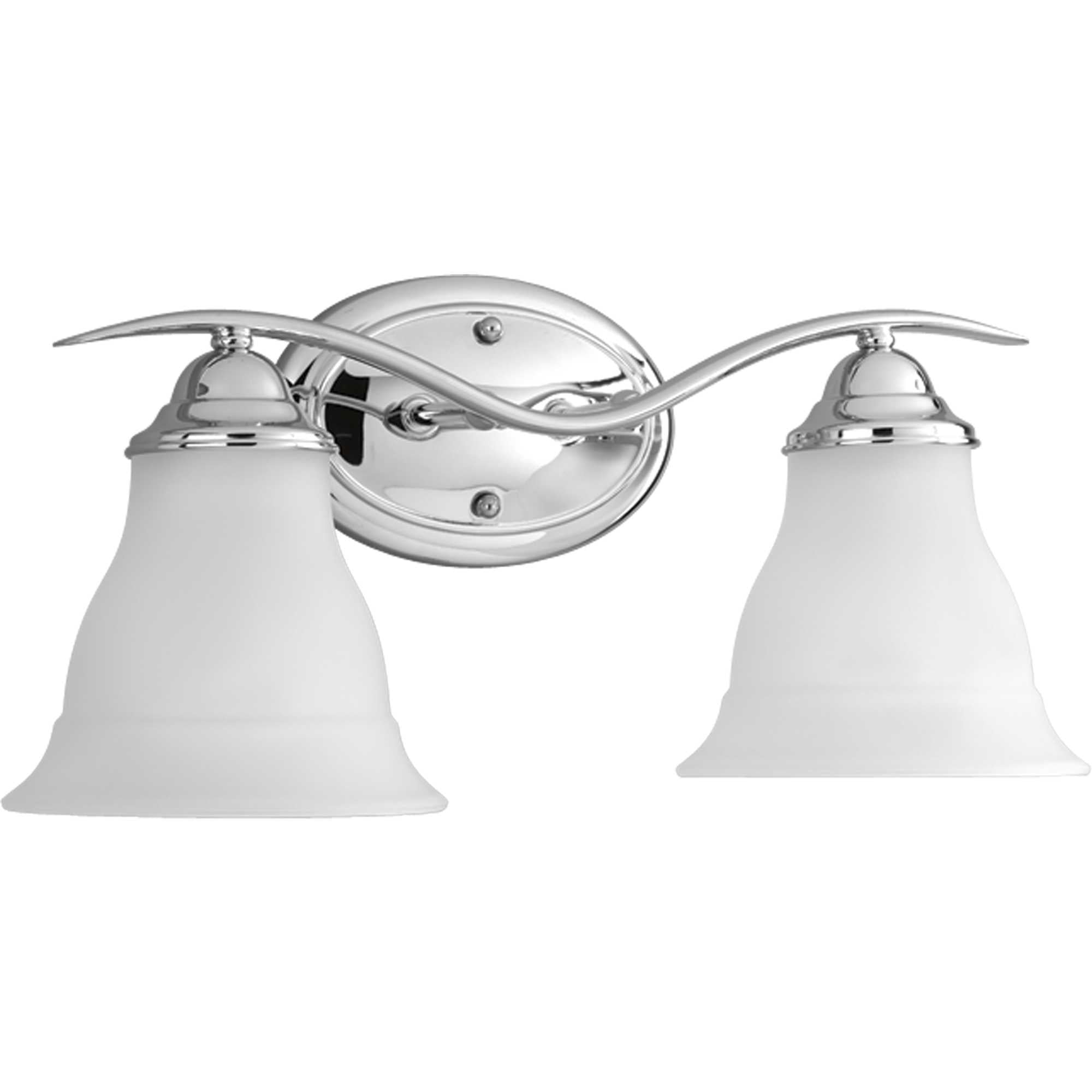 Progress Lighting-P3191-09-Collection: Trinity, Material: Steel, Finish Color: Brushed Nickel, Width: 17.25″, Height: 8.13″, Depth: 7.38″, Height From Outlet Box: 5.88″, Backplate Width: 7″, Backplate Length: 4.75″, Lamping Type: Incandescent, Number Of Bulbs: 2, Wattage: 100 Watts, Moisture Rating: Damp Rated, Desc: Two-light bath fixture featuring soft angles, curving lines and etched glass shades that mount up or down. Gracefully exotic, the Trinity Collection offers classic sophistication for transitional interiors. Sculptural forms of metal and glass are enhanced by a classic finish. This transitional style can transform a room or your whole home with its charming versatility. Brushed Nickel finish. Mounting Direction: Up/Down / Back Plate Height: 4.75 / Back Plate Width: 7.00 / Shade Included: Yes / Shade Dimensions: 6.5 x 5.5 . ,-Trinity – 17.25 Inch Width – 2 Light – Line Voltage – Damp Rated-Brushed Nickel Finish