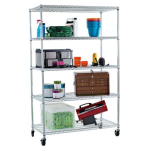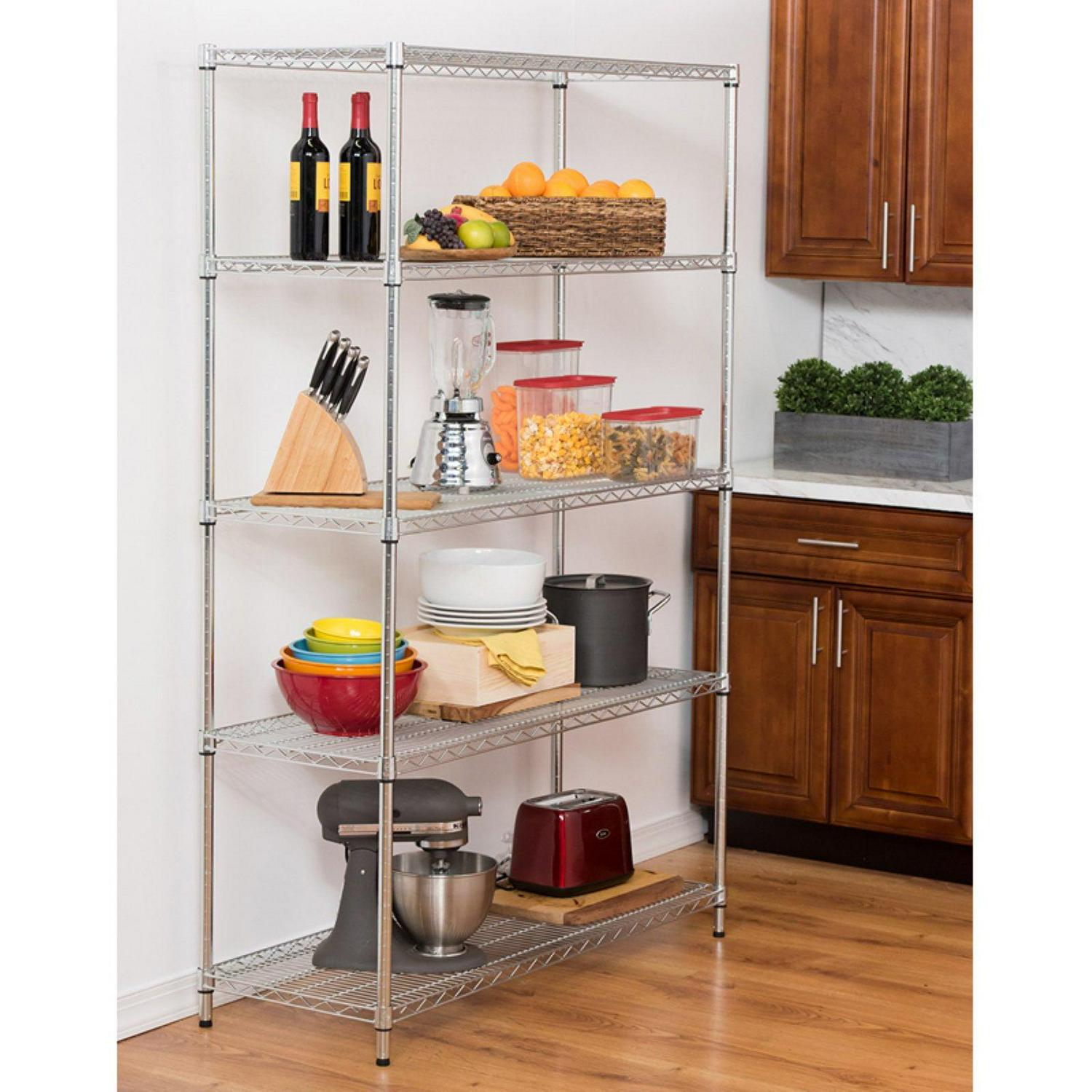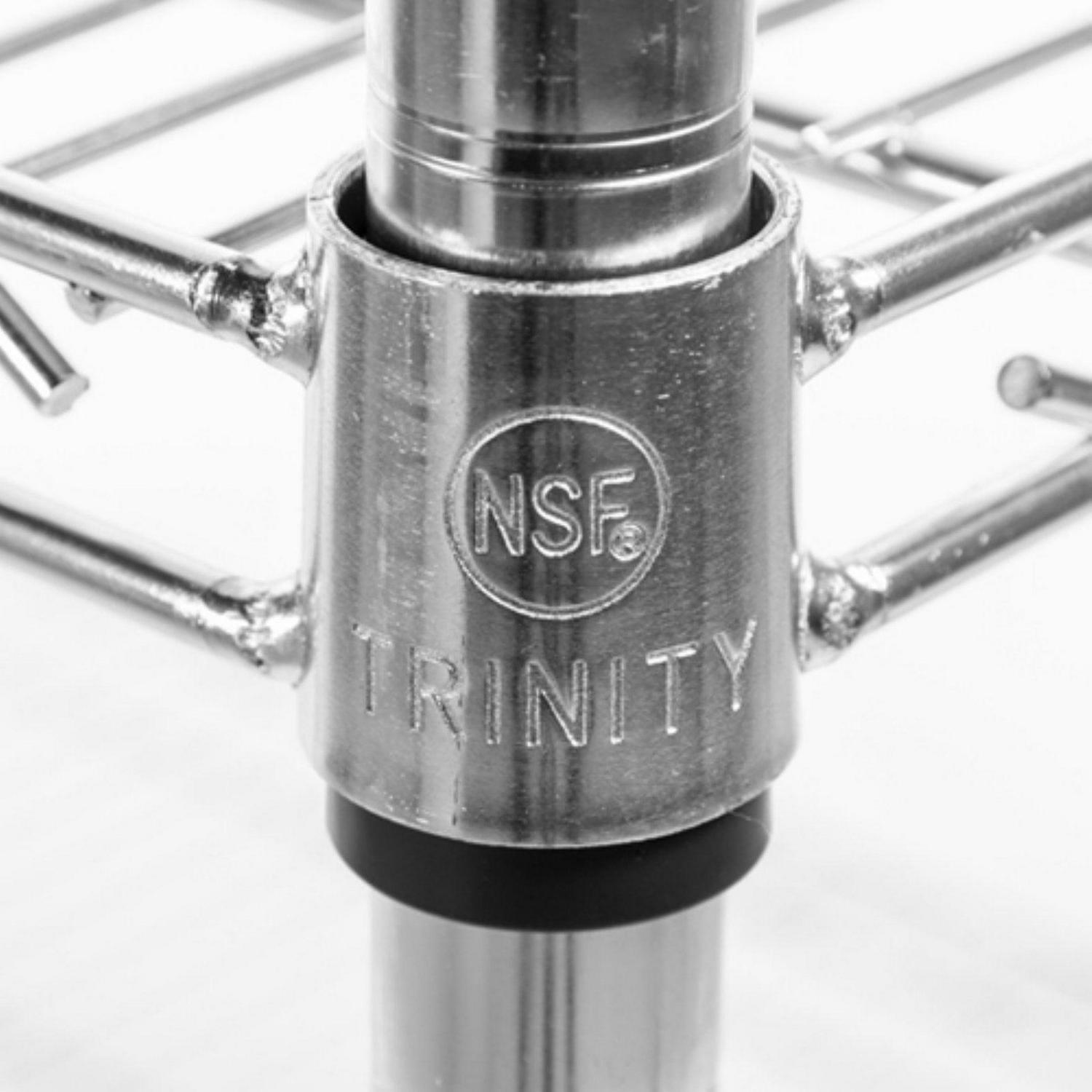 TRINITY EcoStorage NSF certified heavy-duty commercial-grade wire shelving rack is ideal for industrial, garage, or commercial kitchen use. With an 800 lb weight capacity per shelf on feet levelers, it can store your boxes, cookware, tools, and everything in between. Assembly requires no tools and uses a slip-sleeve locking system, which adjusts shelves in 1-inch increments.