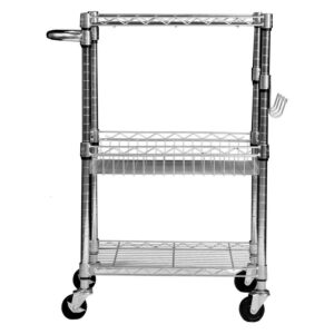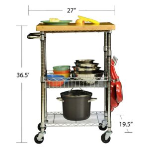 Enjoy the all-in-one convenience of the TRINITY EcoStorage Bamboo Kitchen Cart. Perfect for food prep, this kitchen cart has a removable natural bamboo top that also serves as a cutting board or shelf, plus a handy side towel rack. Underneath, two additional, spacious shelves and a side rack with hooks offer ample storage for dishes, pots, pans, ingredients, cookbooks, and more. Rolling casters let you easily move this cart wherever you do or don’t need it, and to top it all off, the chrome-finished steel provides lasting durability and slick style.