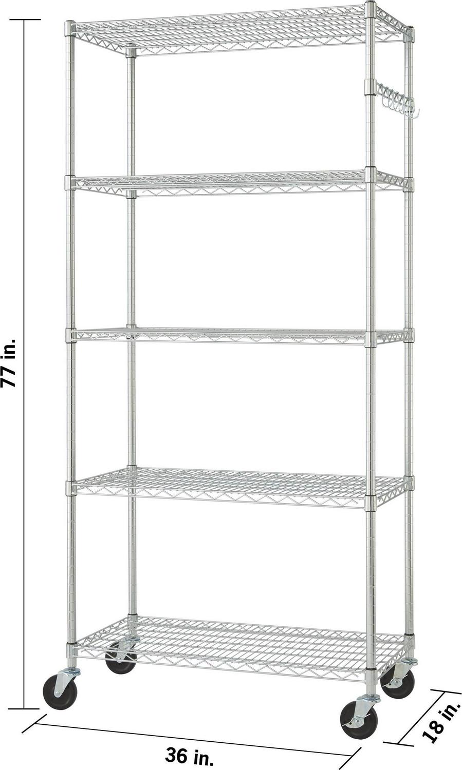 - Shelves: 5 commercial-grade 36″ x 18″ shelves