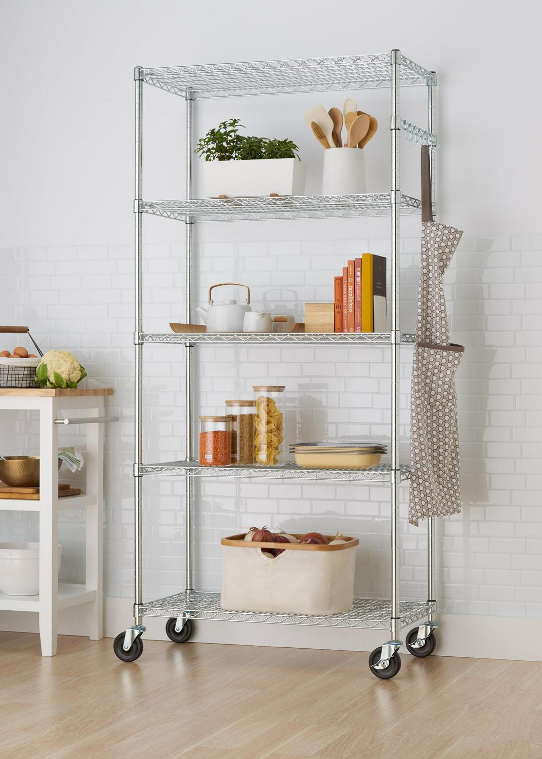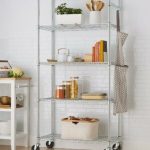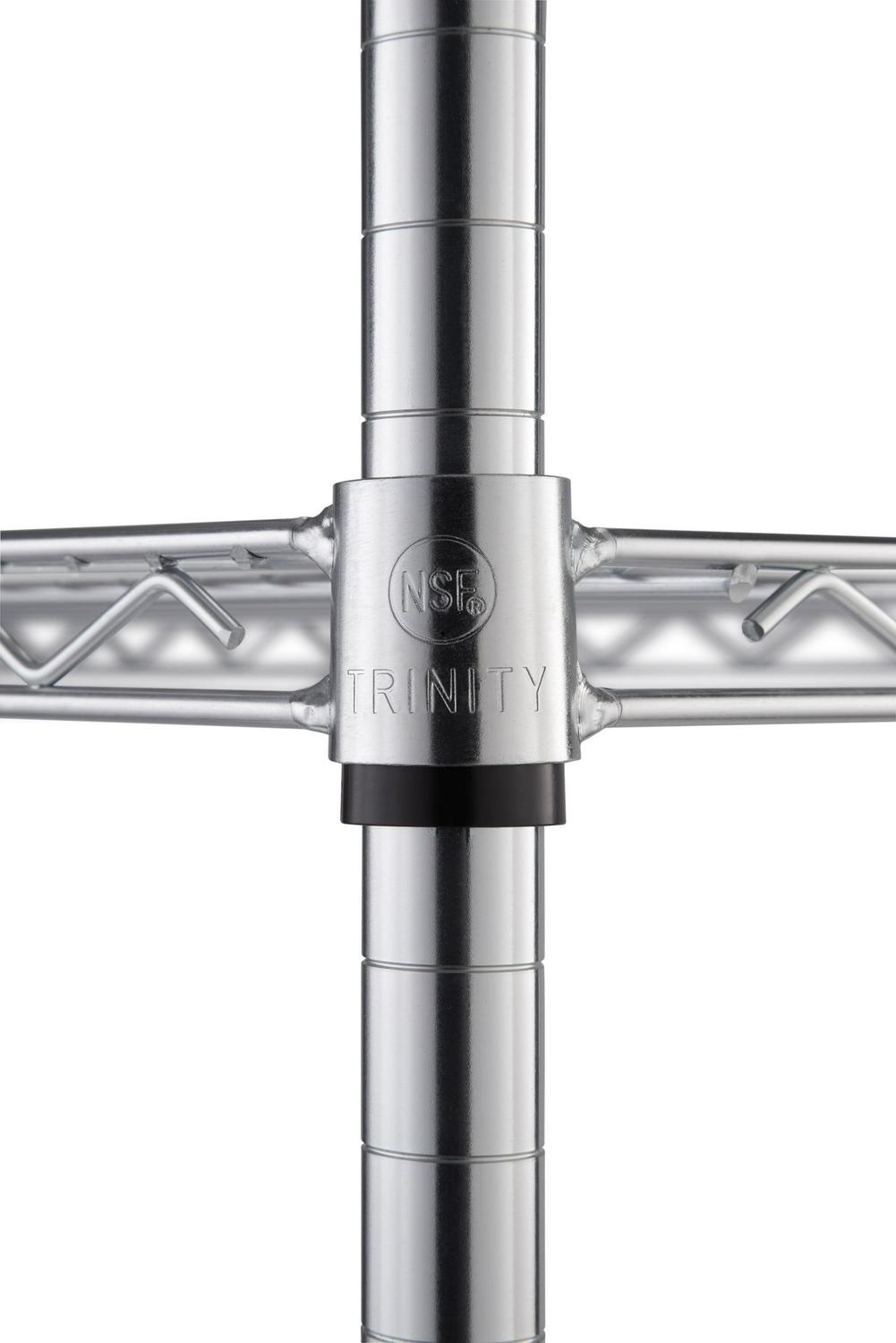 TRINITY EcoStorage NSF-certified wire shelving rack on wheels is perfect for any industrial, garage, or commercial kitchen use. With an 800 lb weight capacity per shelf on feet levelers, it can hold your boxes, cookware, tools, and everything in between. Assembly requires no tools, and uses a slip-sleeve locking system which allows shelves to be adjusted in 1-inch increments.