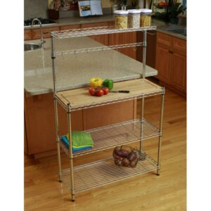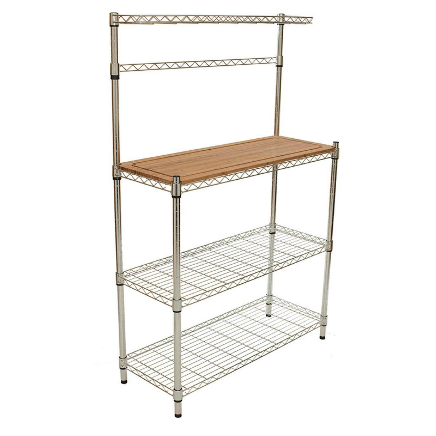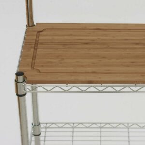 TRINITY EcoStorage Commercial Bamboo Baker’s Rack is a great addition to any kitchen or pantry area. The bamboo surface can be used either on or off the rack. Shelves can be adjusted in 1-inch increments. A hanging bar with (6) hooks is also included to hang your cooking utensils and baking accessories.