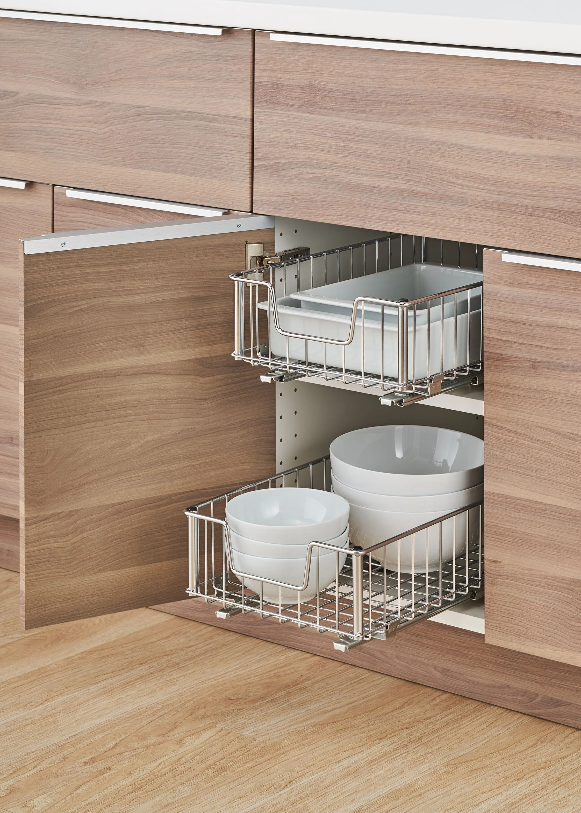TRINITY’s Sliding Wire Drawers are a great addition to any kitchen or storage area. Add these to any 13″ or wider cabinet and get instant pull-out access to your items. These drawers add convenience, accessibility, and visibility to all your items. One pair of slides is included and all hardware is provided for mounting in a cabinet or on a wire shelf.