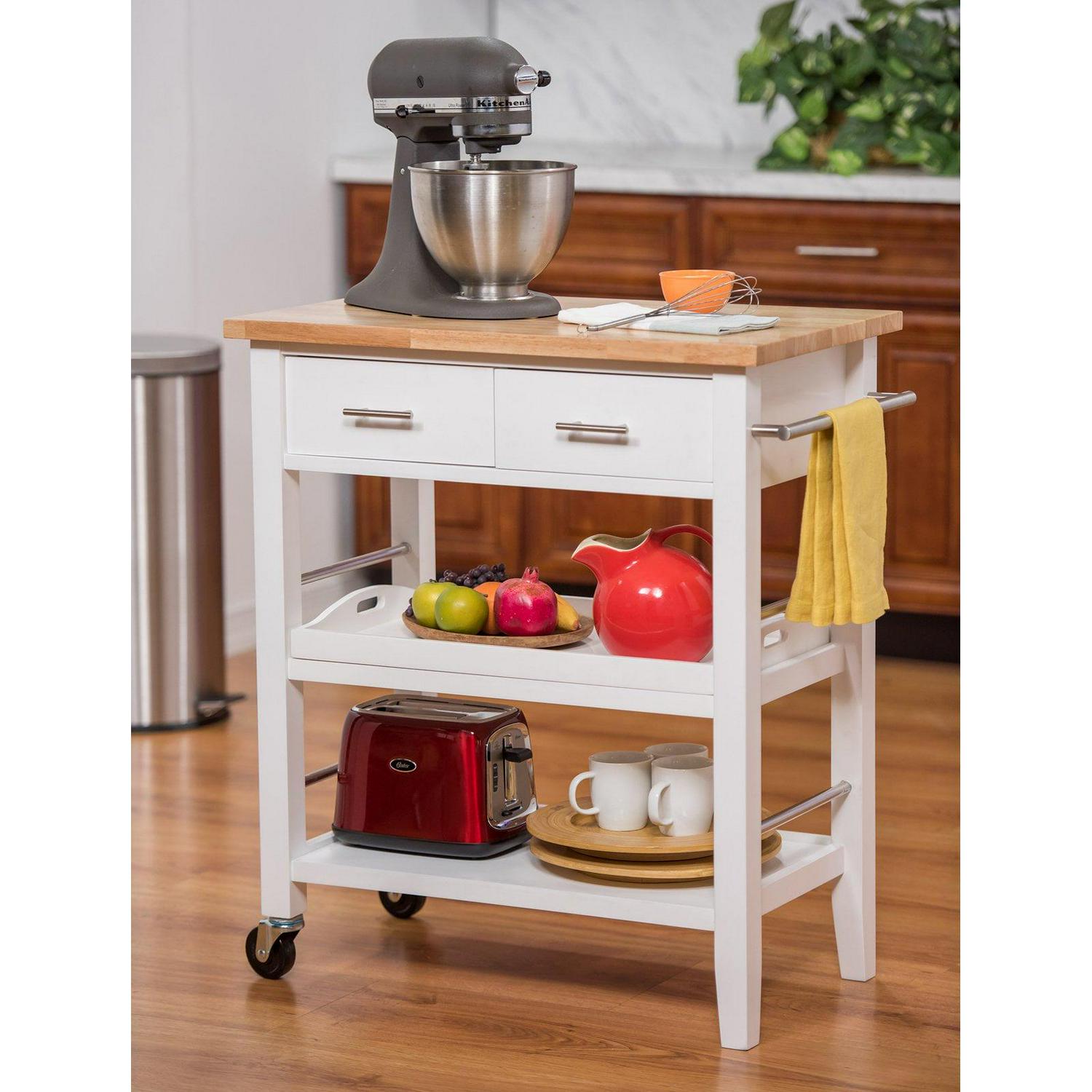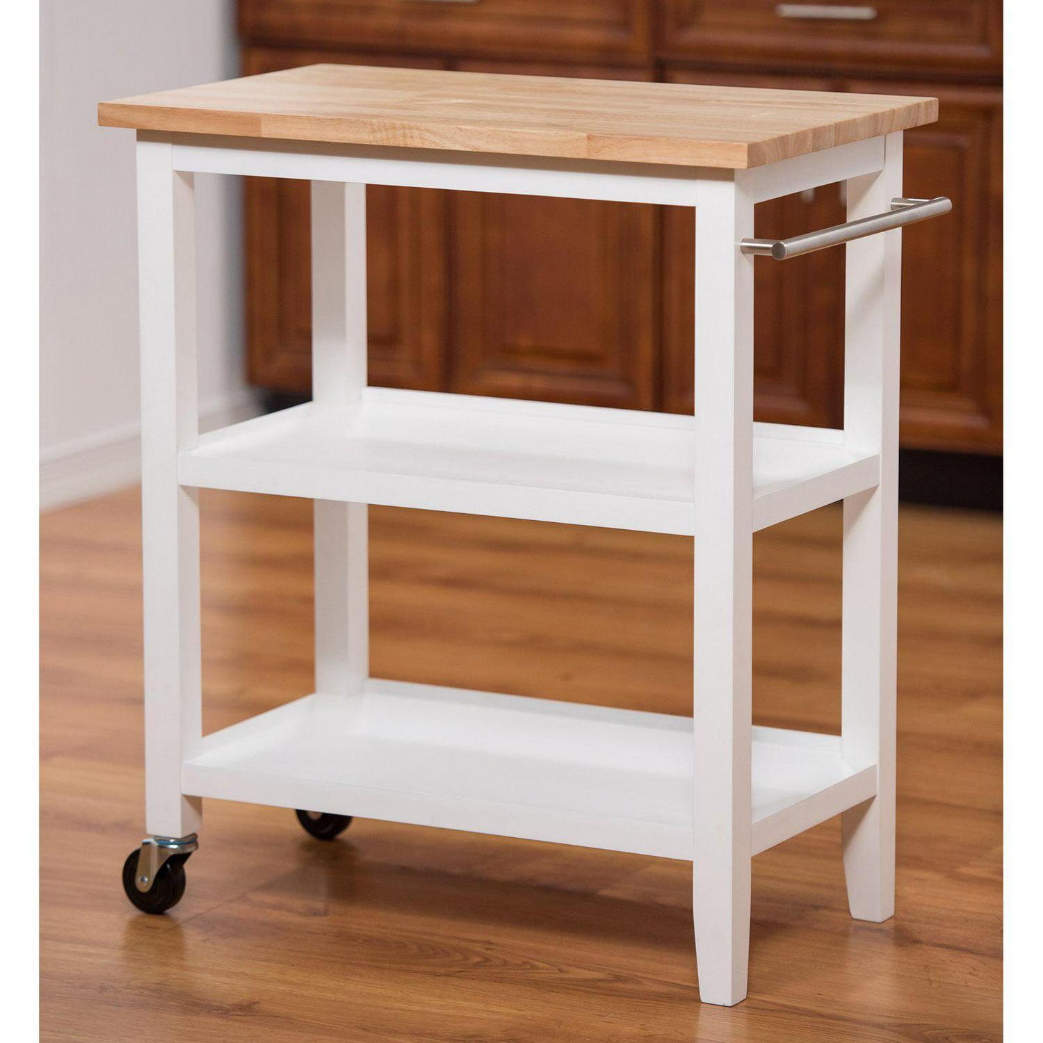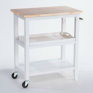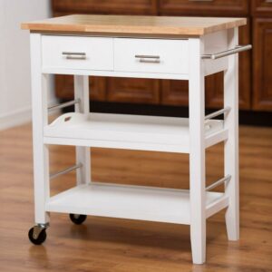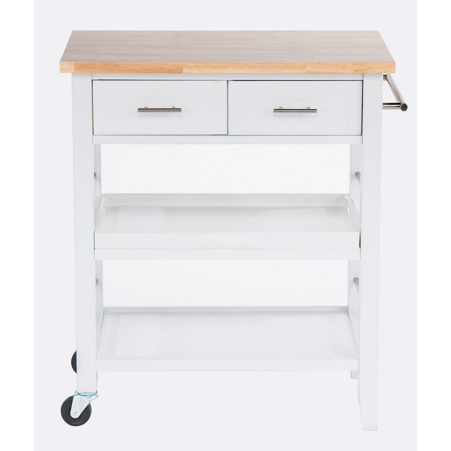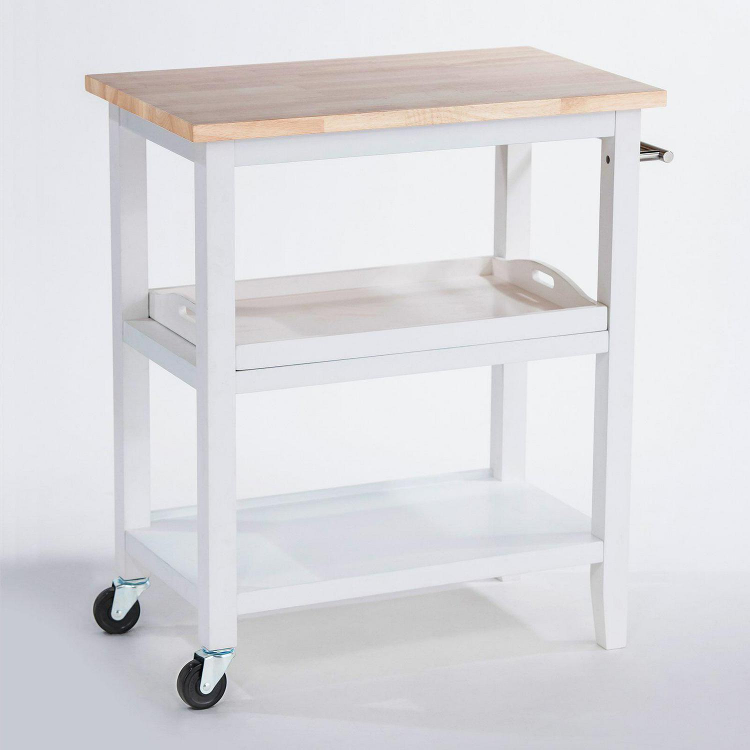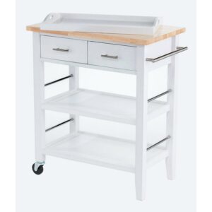 Organize your kitchen and simplify your prep with the Trinity Wood Kitchen Cart. Boasting a solid rubber wood top, it also features two shelves that can hold up to 50 pounds each.