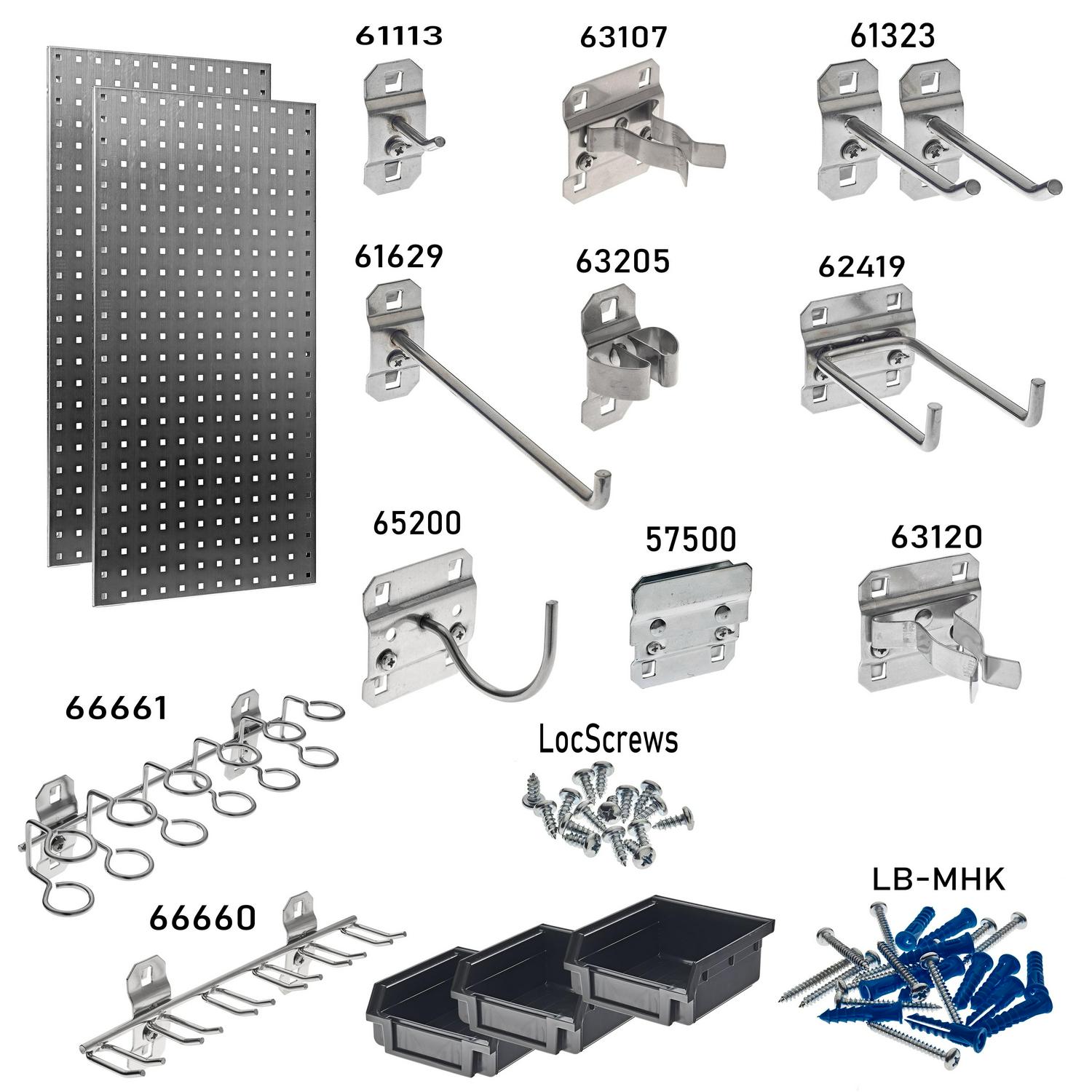 Stainless Steel LocBoard Kits offer the ultimate pegboard system for clean rooms to harsh environments. Made with 304 brushed stainless steel, LocBoard heavy-duty pegboards with square holes have more holding capacity for demanding tool and parts storage. Stainless Steel LocHook 60000 industrial hooks create the most reliable pegboard system. The most dependable pegboard for professional use. LB18S-Kit includes: (2) 18 In. x 36 In. Stainless Steel LocBoard; 32 hooks: (3) 1 In. stainless steel Single Rod 30 Degree Bend; (6) 3 In. stainless steel Single Rod 30 Degree Bend; (3) 6 In. stainless steel single rod 90 degree bend; (3) 4 In. stainless steel double rod 90 degree bend; (6) stainless steel Extended Spring Clip; (3) stainless steel Standard Spring Clips; (3) 2-1/4 In. stainless steel Curved Hook; (1) stainless steel Multi-Prong Tool Holder; (1) stainless steel multi-ring tool holder; (3) stainless steel BinClip(s) for (3) black Plastic Hanging Bins, mounting hardware.