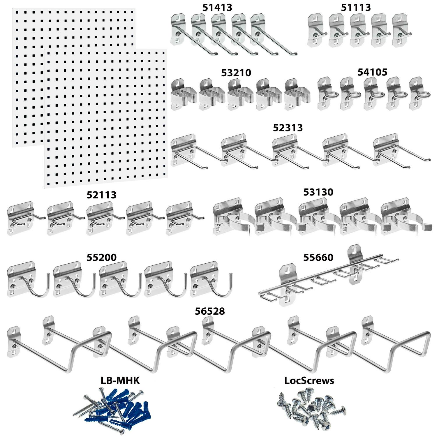 LocBoard heavy-duty scratch resistant epoxy coated steel pegboard with square holes offers ultimate holding capacity for demanding storage needs. LocBoard kit is ideal for use in clean room, factory floor production, maintenance, repair areas, home and garage. Industrial strength LocHook(s) create the most reliable pegboard system available. Demanding tool storage requirements for power tools, large and odd shaped tools are easily met using LocBoard steel pegboards. Contents: (2) 24 In. x 24 In. LocBoards; 46 hooks: (5) 1 In. Single Rod 30 Degree Bend; (5) 4 In. Single Rod 30 Degree Bend; (5) 1 In. Double Rod 30 Degree Bend; (5) 3 In. Double Rod 30 Degree Bend; (5) Extended Spring Clip/Spray Can Holder; (5) Standard Spring Clips; (5) Single Ring Tool Holder; (5) 3-7/8 In. Curved Hook; (5) Double Closed End Loop; (1) Multi-Prong Tool Holder.