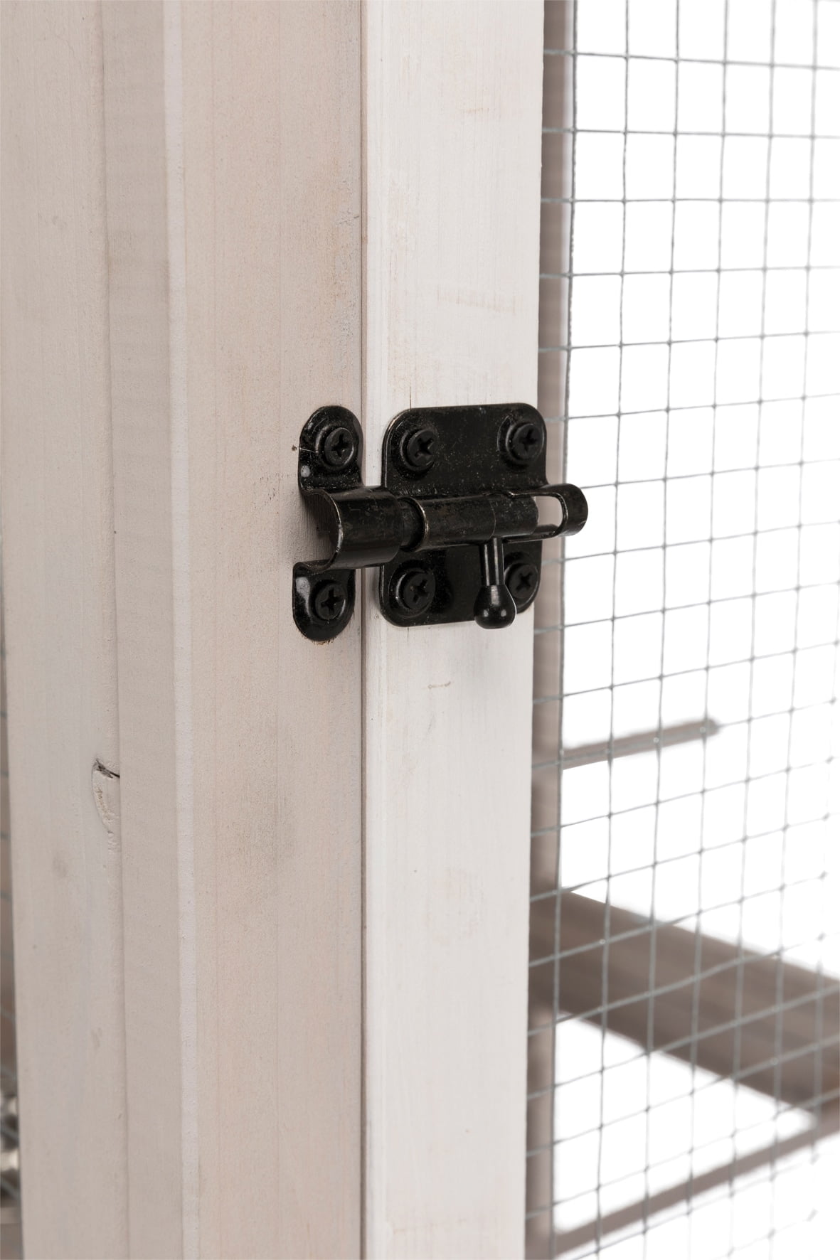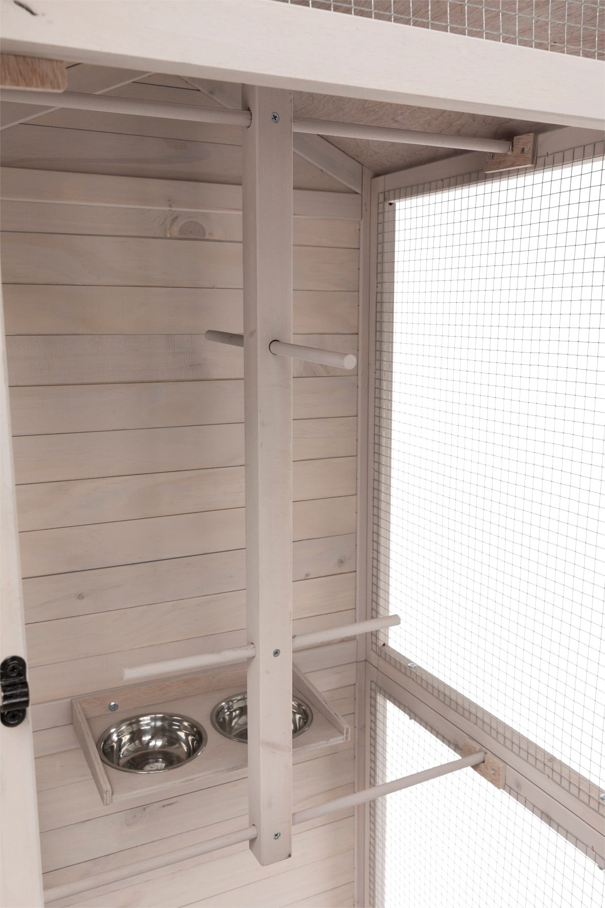 for indoor and outdoor use for small parakeets, zebra finches and other small birds 3 doors, plus metal slide latches flap on side for fastening e.g. a bath tub horizontal bars to hold accessories in place and for climbing pull-out plastic tub for fast and easy cleaning extra floor grid prevents birds from flying out when plastic tub is pulled out wood paneling at the back protects against wind includes 2 perches, climbing frame, ladder and feeding tray with 2 stainless steel bowls materials: glazed pine, galvanized metal grid, plastic, composite asphalt shingles, metal