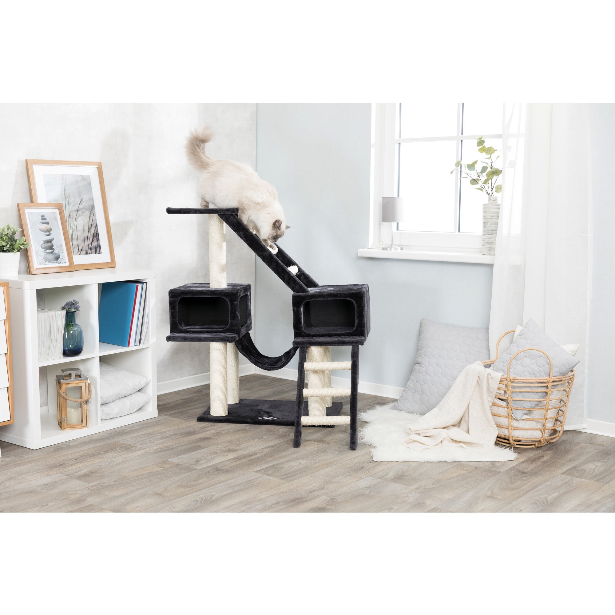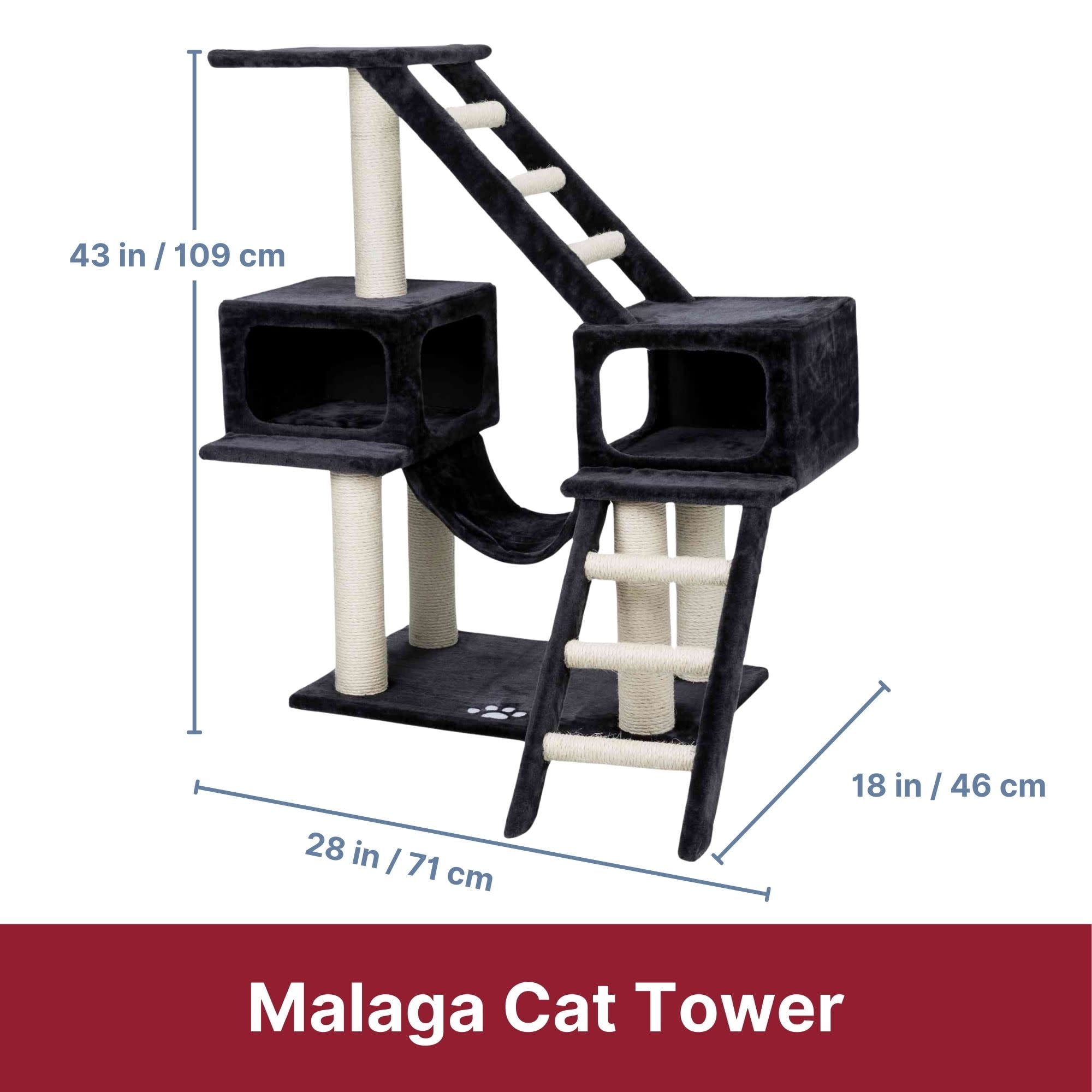 Give your curious feline companion the ultimate indoor adventure with the TRIXIE Malaga Cat Tower. This multi-level cat haven has exciting features to keep your kitty entertained for hours. Watch your playful feline friend ascend new heights on the sturdy sisal-wrapped ladders before curling up for a well-deserved nap in a plush condo or cozy hammock. With multiple scratching posts covered in durable sisal, your furniture will thank you!