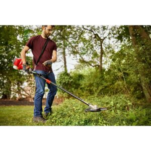 When a string trimmer alone just can’t get the job done, rely on the 27cc 2-cycle TB272BC brushcutter with a lightweight engine that is comfortable for everyone. Its full-crank engine provides greater comfort and less vibration. SpringAssist technology allows for easier pull starts. The tough 8 in. steel brush blade powers through heavy vegetation, while the straight shaft allows for greater reach. The brushcutter converts to other outdoor tools with TrimmerPlus attachment capability, and allows for more versatility and storage space. It doubles as a string trimmer with the included high capacity Click ‘N Trim Bump Head with 18 in. cutting swath. The adjustable J-Handle provides added control and easy right or left-handed use. Includes shoulder strap, 2-cycle engine oil, and a 2-year limited warranty.