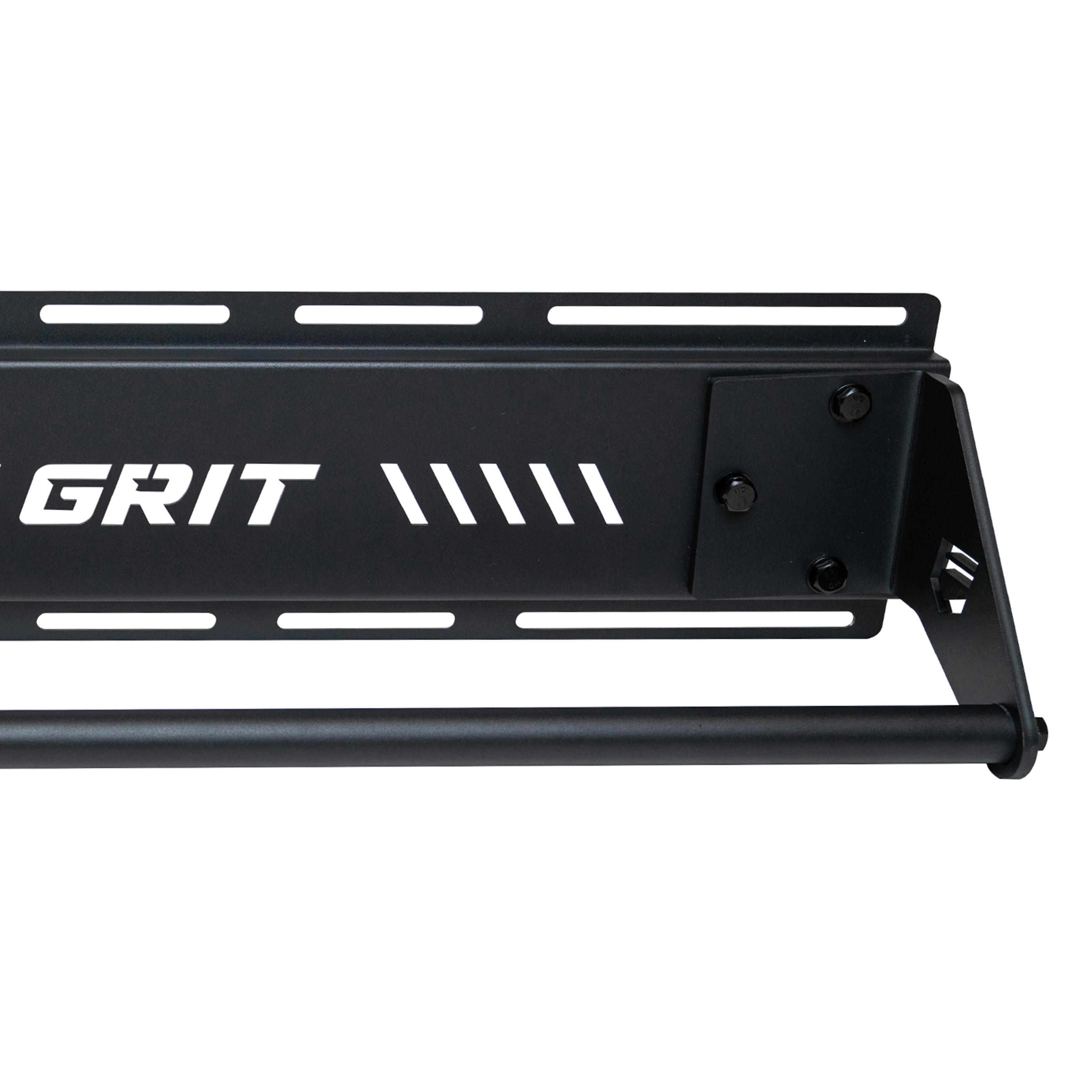 Tru Grit Fitness Pull Up Bar Pro Plate: Specifications – Crafted from Industrial Cut Tru Grit Steel Stringer Plate 44” Long x 8.98” Tall 6.20” Distance Between the Pull Bar and Tru Grit Stringer Plate Equipped with Black Oxide Stainless Steel Hardware Color: Coated Black Maximum weight 500LBS