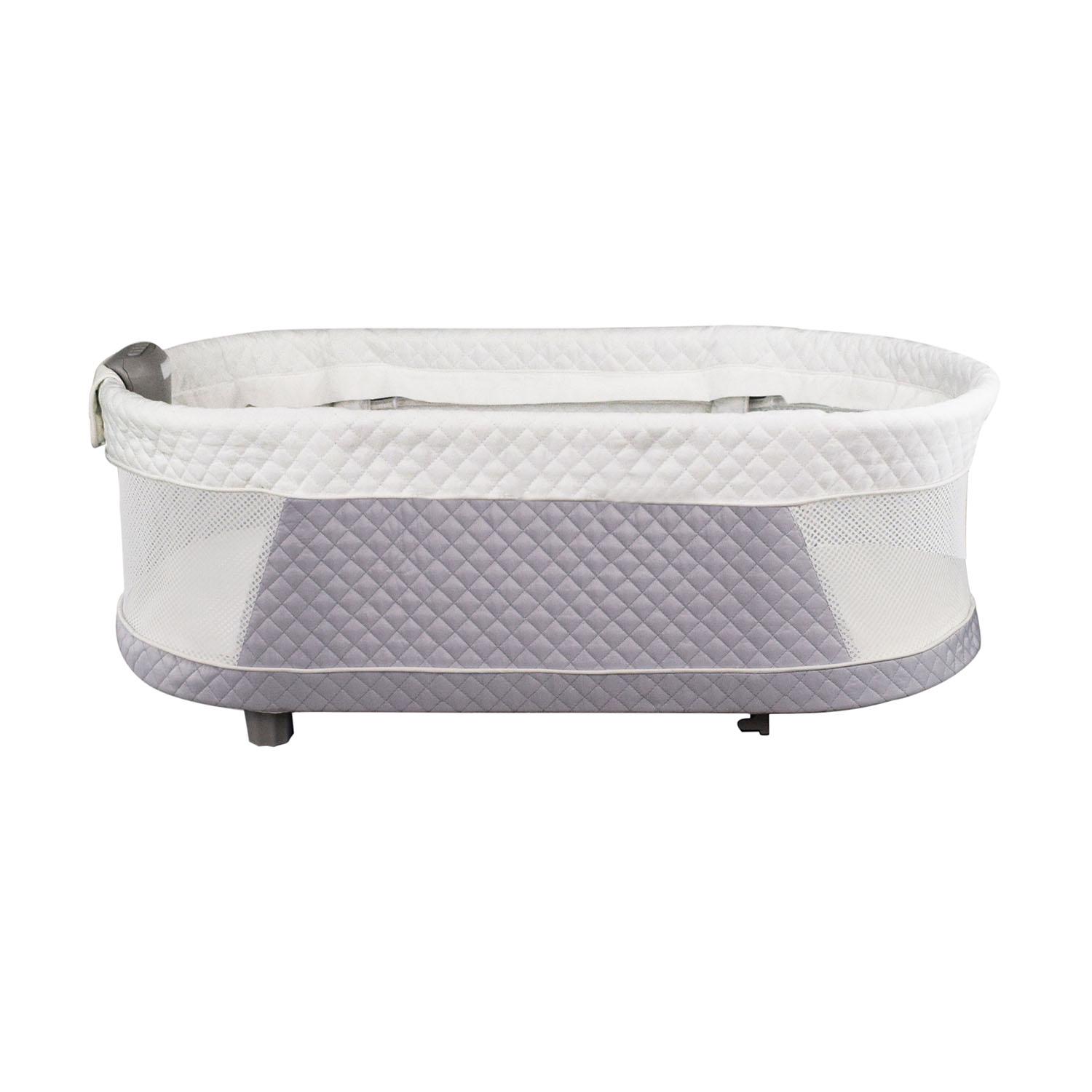 Lull your baby to sleep and give yourself some much-deserved rest. With the TruBliss Journey 2-in-1 Bassinet, get your infant to sleep through the night and add a beautiful touch to your nursery. This sleeper crib integrates cozy sleep technology designed to protect your baby and encourage sleeping through the night. Bring a beautiful traditional design to your nursery and rely on the convertible design of this infant crib to accommodate all your child’s needs. No matter if your little one is sleeping at home or on the go, trust the both by-the-bed sleeper mode and the portable sleeper mode to lull them safely to sleep. With a padded, vinyl-covered foam mattress pad and 2 printed fitted sheets, keep your kiddo cozy. Invest in a bassinet that takes everything into consideration. With intuitive electronic features, such as a nightlight, vibration, and sounds, you won’t have to rely on parental instincts alone to get your baby to lie down for a nap. No matter how you soothe your baby, the calming nature noises, womb sounds, guitar lullabies, and classical music will be sure to get your baby to sleep through the night. Prioritize your baby’s sleep with the TruBliss Sleeper. This crib was manufactured in 2011 or later and complies with the new federal safety standards issued by the CPSC.
