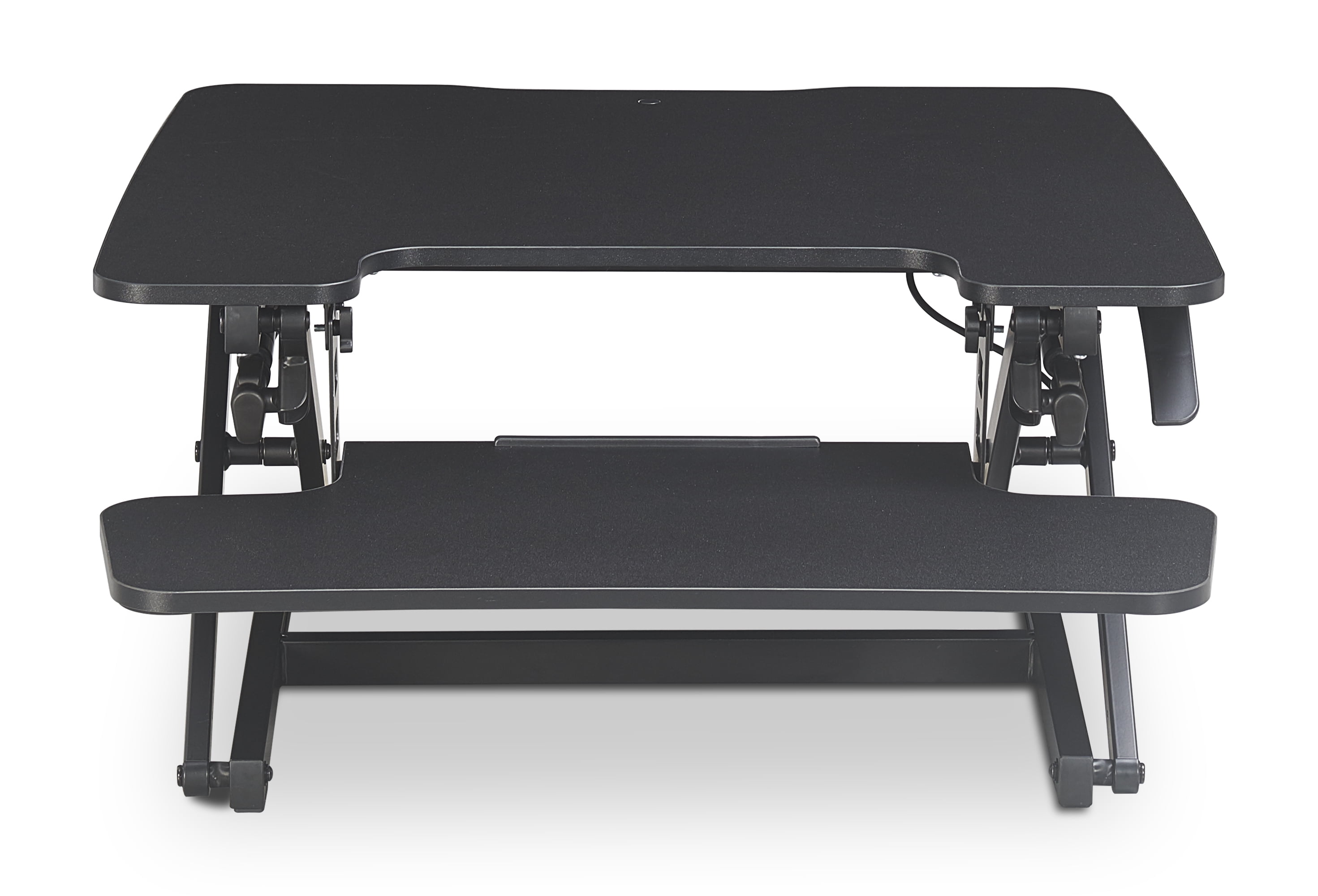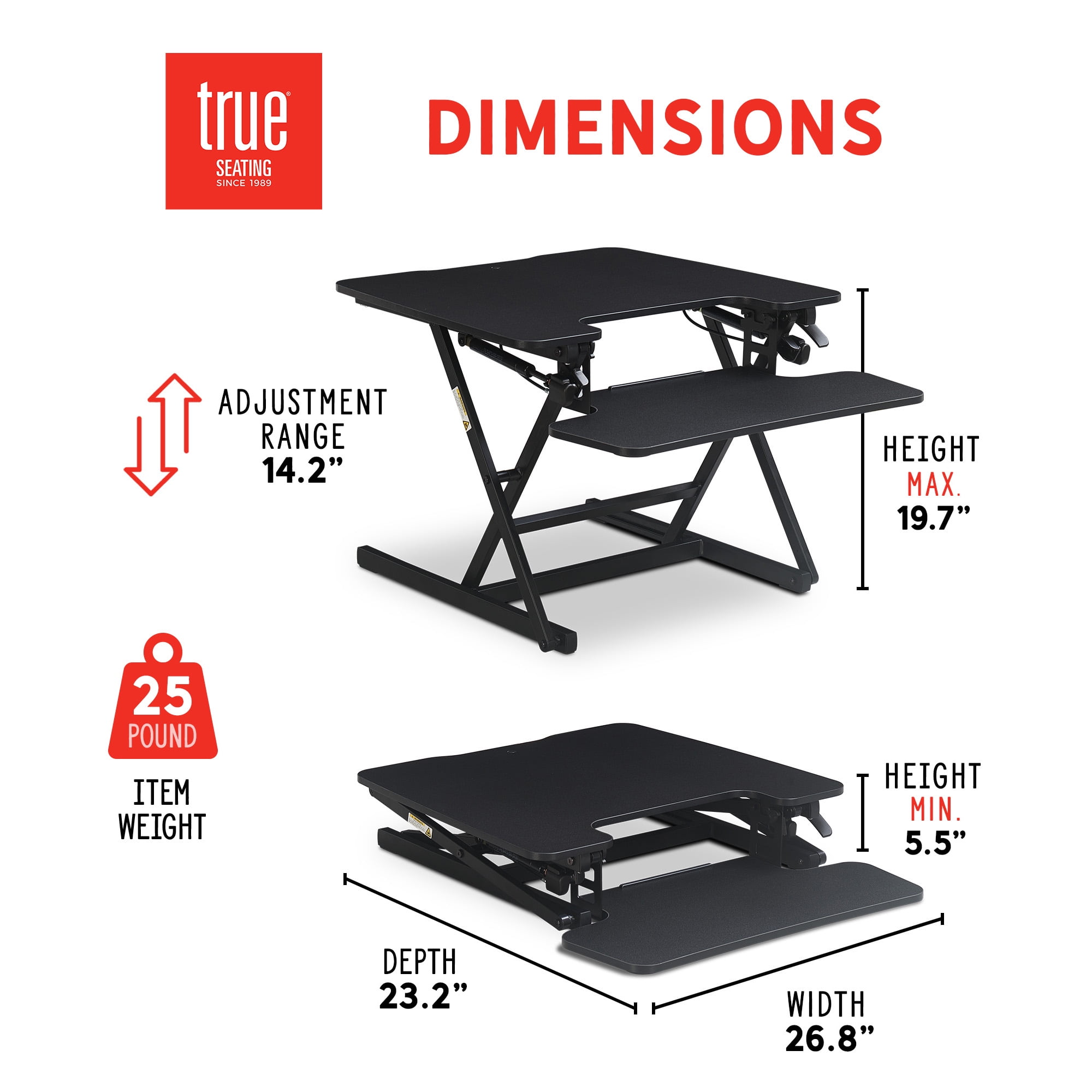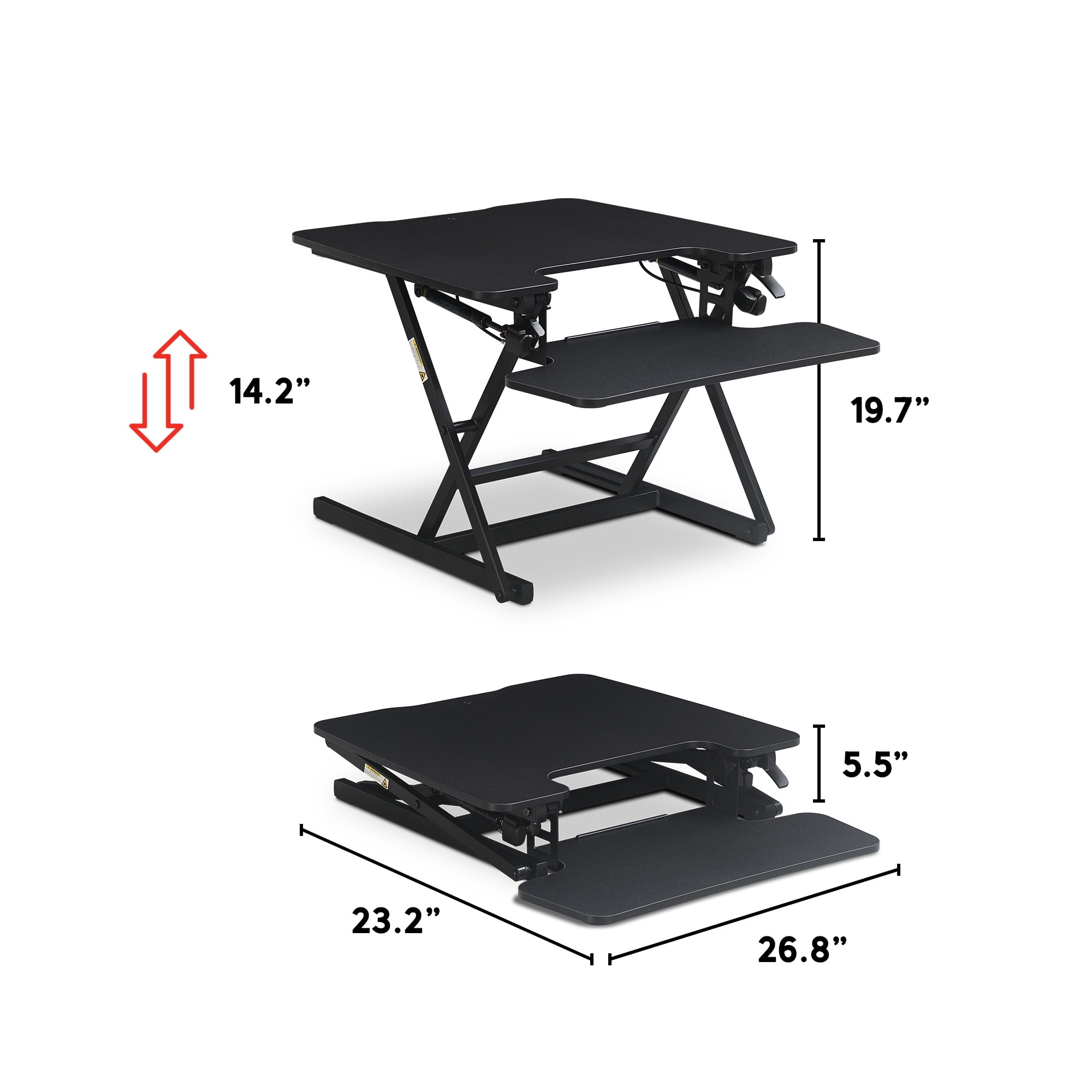 Easily transforms desk into a sit-stand workstation Adjusts from 5.5 to 19.75-inches height for custom comfort Room for laptop, tablet, mouse, and keyboard setups Dual gas lift adjust height with minimal effort Supports up to 33 lbs. Easy Assembly Required 26.8-inch width x 23.2-inch length x 19.7-inch height