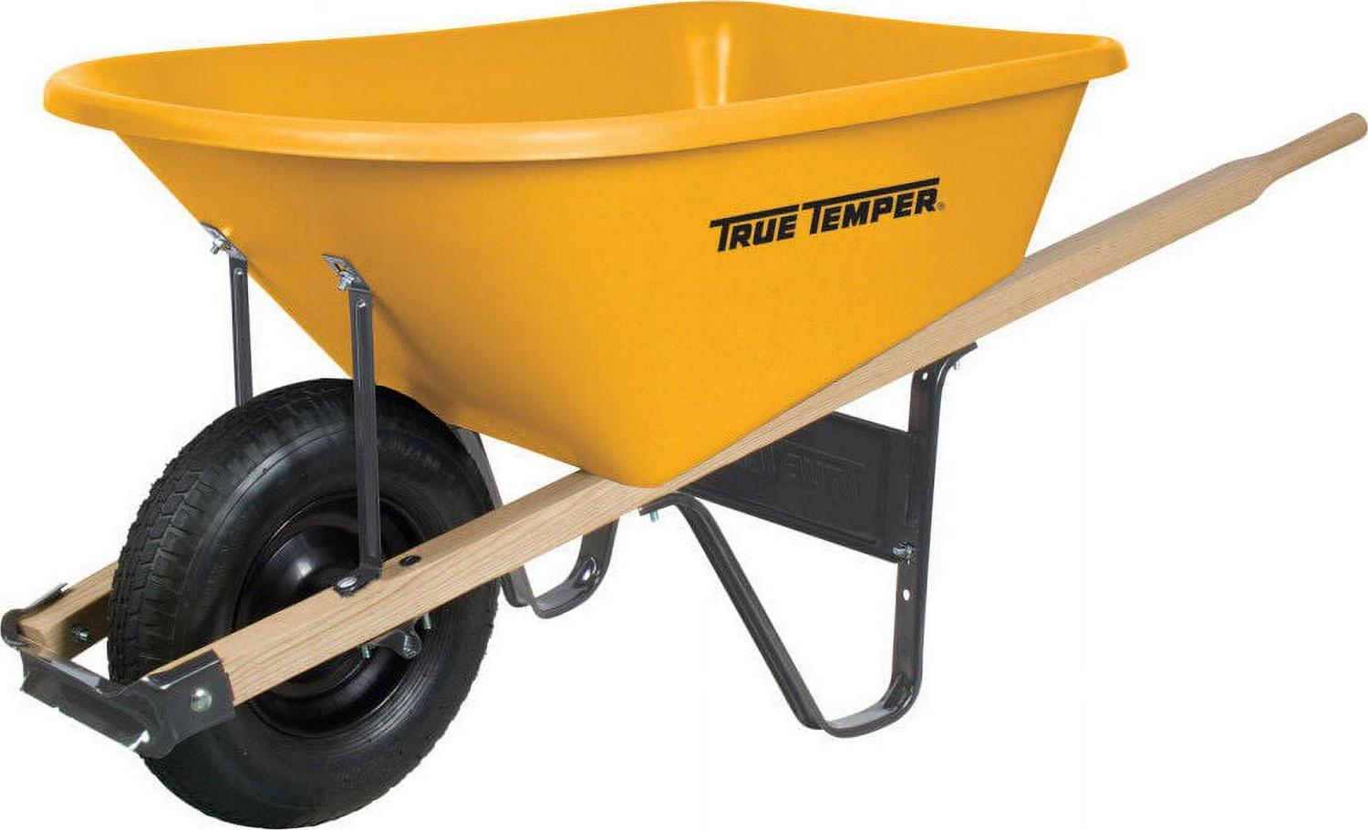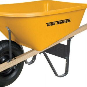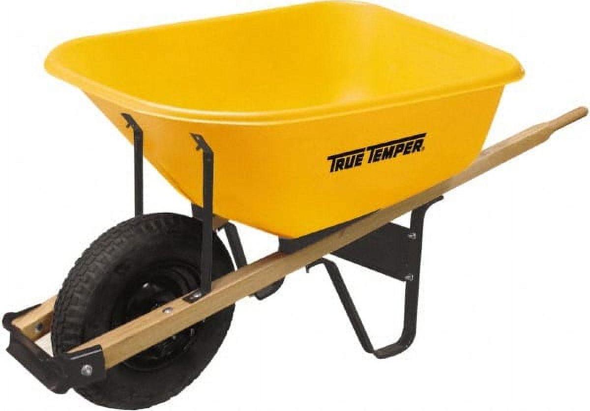 Boasting a bright yellow color, the True Temper RP625 6 Cubic Foot Poly Wheelbarrow has a corrosion and rust-proof poly tray. This large wheelbarrow is enhanced with a steel undercarriage that brings it added durability. The sealed hardwood handles are comfortable yet strong. A large tubed pneumatic tire allows you to move it around smoothly and easily over all types of terrain.