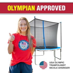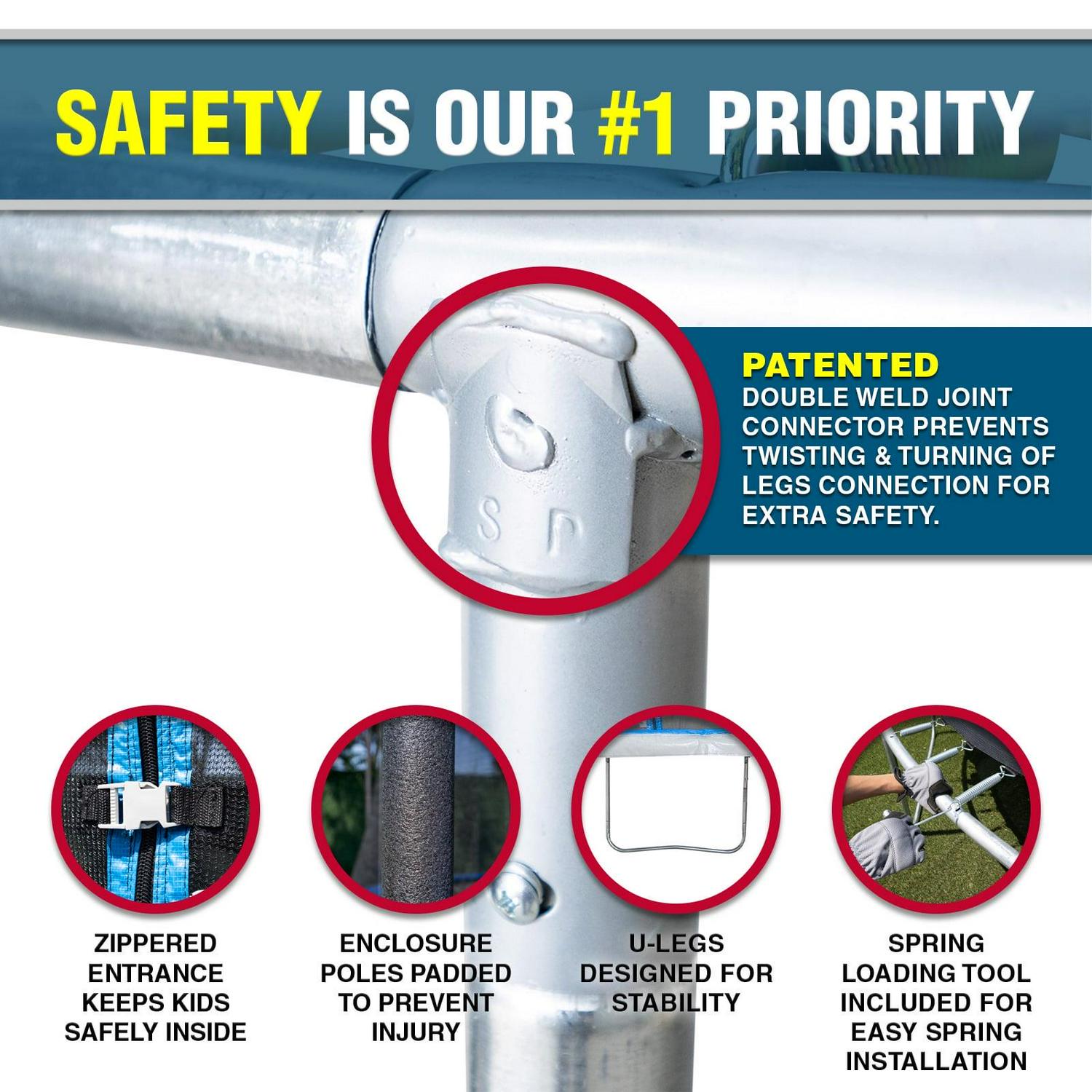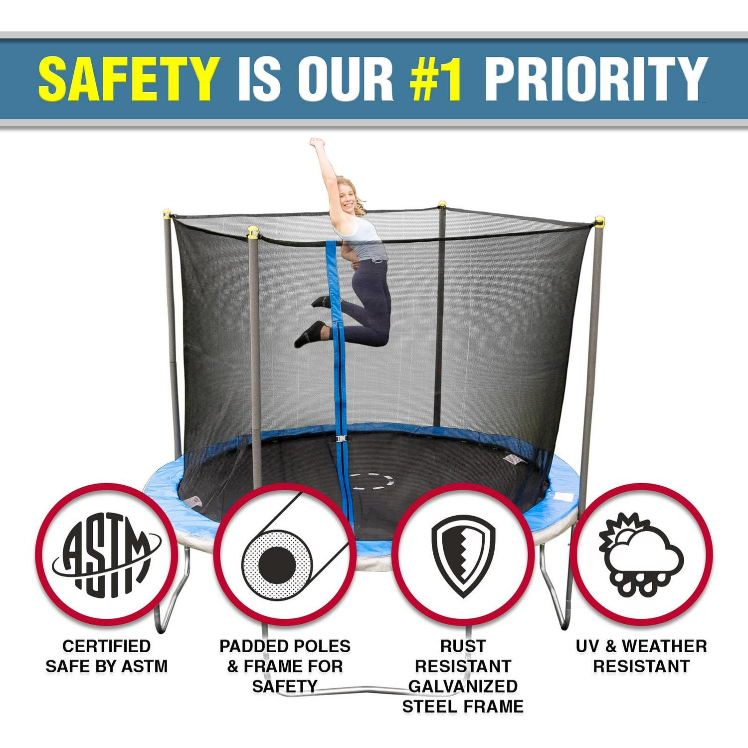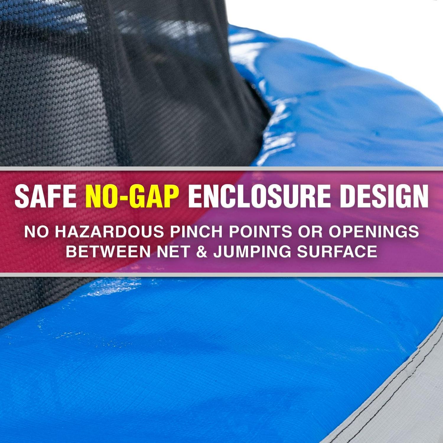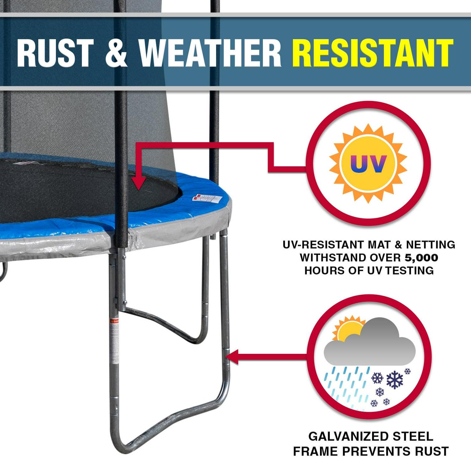 ULTRA DURABLE and SAFETY MATTERS: The trampoline frame and enclosure poles are constructed of rust-resistant, thick-walled steel tube. The enclosure is equipped with strong, no gap, and UV-resistant netting. The enclosure door is secured with an anti-slip zipper and buckle system. The springs are covered with thick padding.