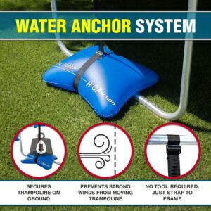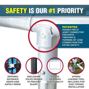 Rust-resistant galvanized steel frame Trampoline park quality jump mat withstands over 5000 hours of UV testing UV-resistant polyethylene enclosure netting to prevent falling out Foam padded spring cover to prevent impact, contact and entanglement Patented double welded plates leg weld to reinforce joints and prevent bending/breaking Steel W-leg design for stability Water anchors secure the trampoline in place. Spinner Light Zone