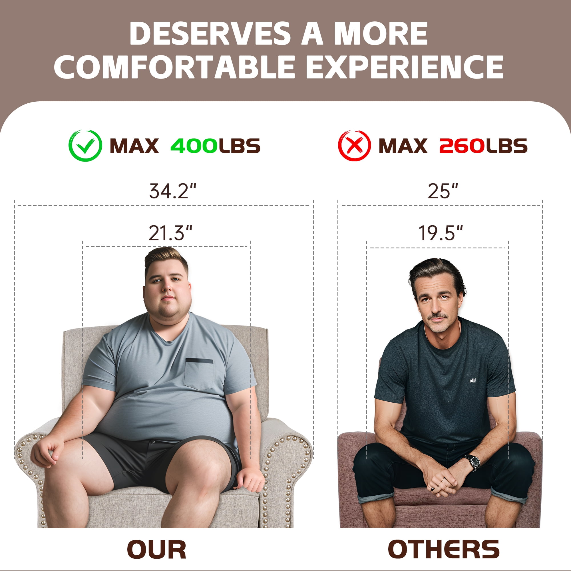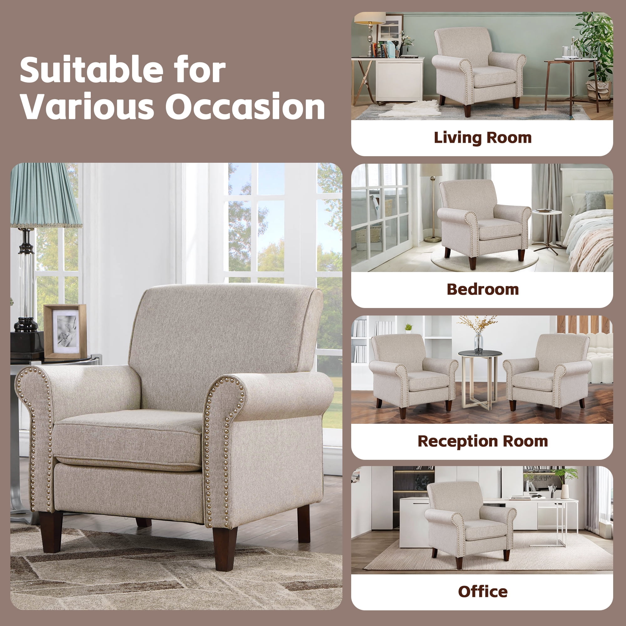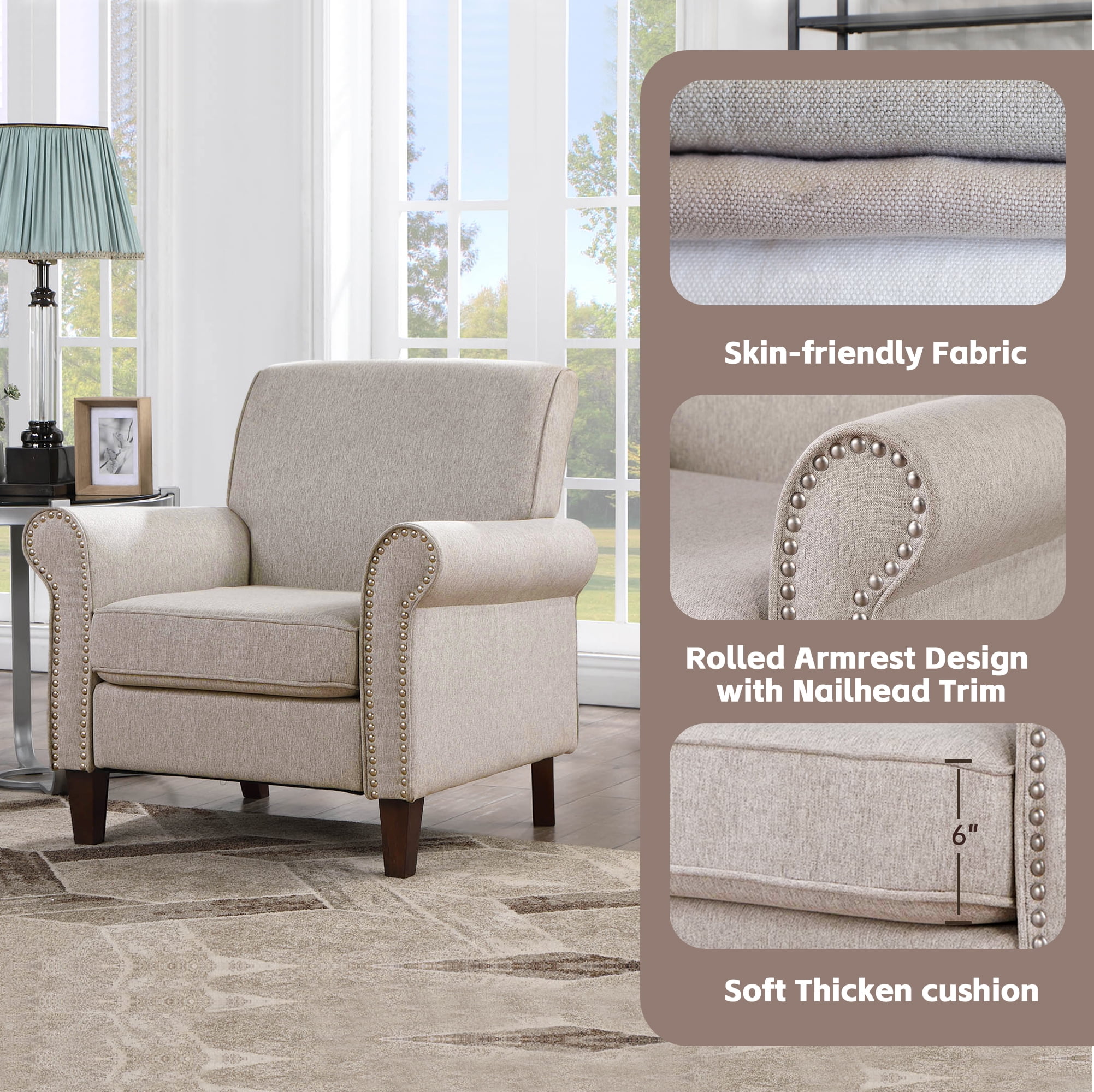 Comfortable & Soft Chair: This chair offers the perfect blend of firmness and comfort with a pocket spring core surrounded by high-density sponge. Whether you’re reading, gaming, socializing, or relaxing by the fireplace, it provides enduring comfort for all your activities. Timeless Medieval Style: Featuring classic rolled armrests and elegant nailhead trim, this mid-century armchair exudes a vintage charm that enhances any décor. Its sophisticated design makes it a standout piece for your bedroom, living room, office, or apartment. Overall Dimensions: This single sofa measures 31.5″ D x 34.25″ W x 35.8″ H, with a seat size of 21.3″ D x 22″ W. It supports up to 400 pounds and provides ample space. The seat’s inner dimensions are ideal for various sitting postures, ensuring comfort whether you’re enjoying a cozy read or a movie marathon. Ergonomic Design: The chair features an ergonomically curved back that conforms to the natural curve of your spine, relieving pressure on your back and neck. Generously wide armrests, measuring 6.5″ across, provide perfect support for long periods of lounging and reading. Easy Assembly: Assembly is straightforward with our clear, detailed instructions and included tools. You’ll have your new chair set up quickly and easily, so you can start enjoying it right away. Product Description: Overall:31.5″ D x 34.25″ W x 35.8″ H Seat: 21.3” D x 22 ” W Back Dimensions: 17.7” H Chair Design: Accent Sofa Chair Armchair Back Type: Tight Back Base Style: 4 Legs Arm Type: Round Arms Leg Color / Finish:Walnut Upholstery Material: Polyester Frame Material: Solid + Manufactured Wood Back Fill Material: Foam Seat Construction: Sinuous Springs Cushion Construction: Foam Foam Density: 1.5 lbs./cu. ft. Arm Material: Fabric; Wood; Foam Leg Material: Solid Wood Kiln-Dried Wood: Yes Nailhead Trim: Yes Assembly: Assembly Required Weight Capacity: 250 lb. Removable Components: Seat Cushion; Legs Additional Tools Required (Not Included): All Tools Included Cleaning Code: Spot clean with dry, solvent-based cleaner