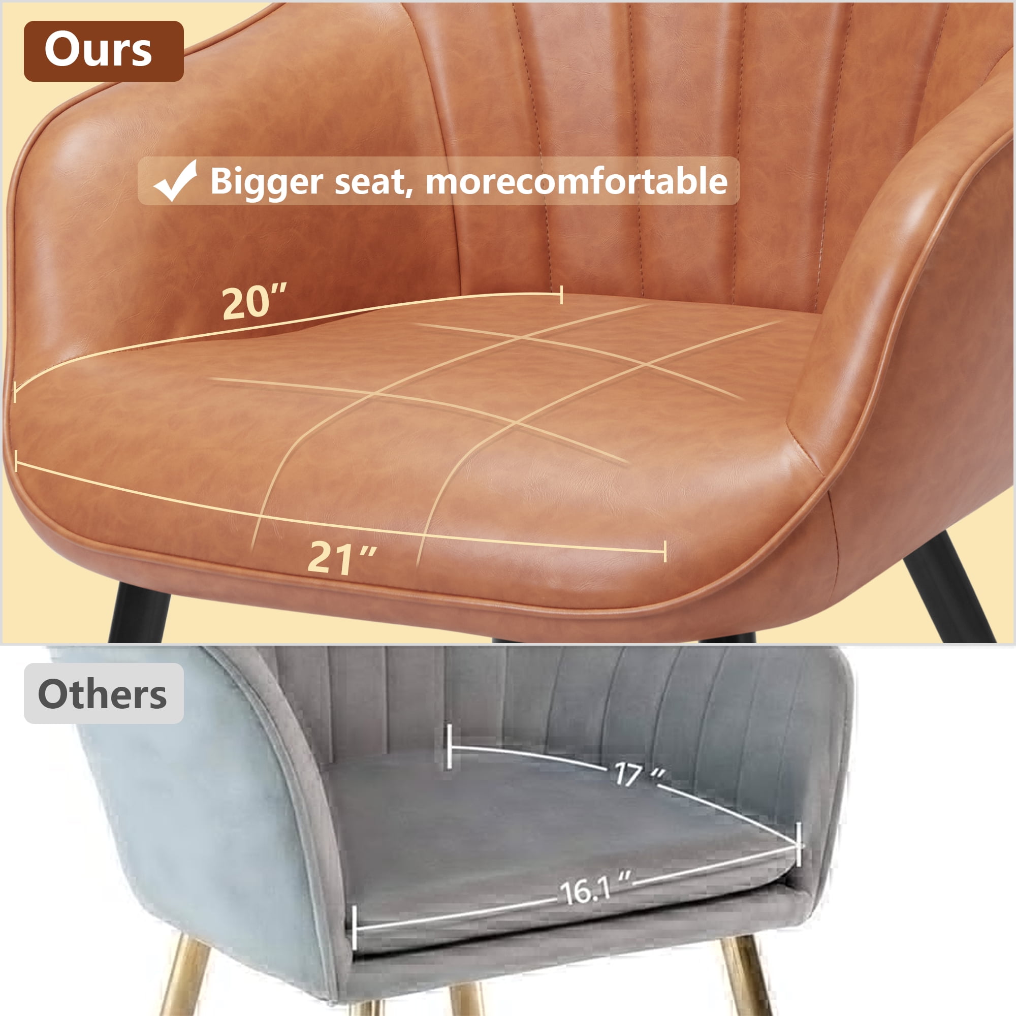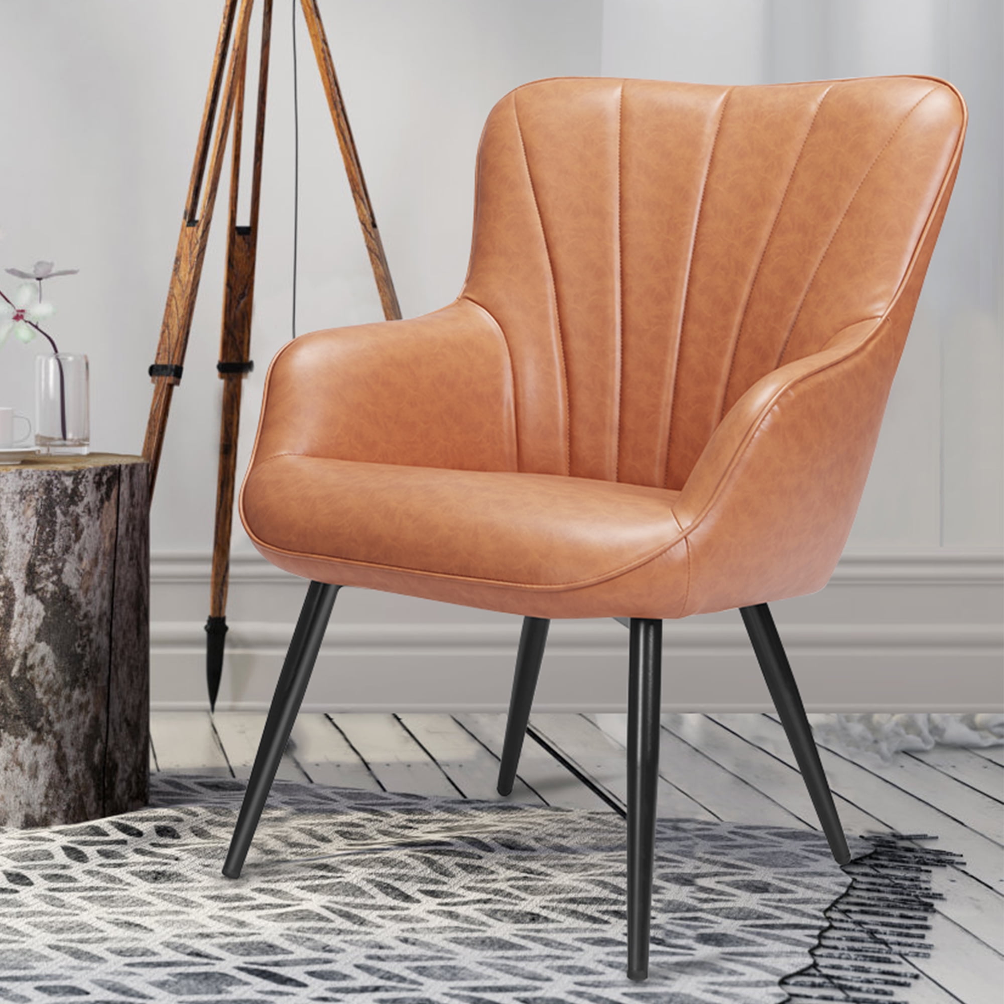Seat Length: 18 inch Size: 24.5″D x 24″W x 33″H Weight: 17 Lbs Product Description: Product Type: Accent Barrel Chair Color: Brown Chair Design: Wingback Chair Swivel: No Arms Included: Yes Leg Color / Finish: Black Upholstered: Yes Pattern: Solid Color Arm Type: Round Arms Faux Leather Type: PU Upholstery Material: Faux Leather Frame Material: Manufactured Wood Fill Material: Foam Back Fill Material: Foam Leg Material: Metal Weight Capacity: 330 lb. Accent Pillow Included: No Water Resistant: Yes Durability: UV Resistant; Scratch Resistant; Waterproof Cleaning Code: Spot clean with dry, solvent-based cleaner Product Care: clean it with a damp cloth Package: 1 x Accent Chair 1 x Tool bag 1 x Instruction